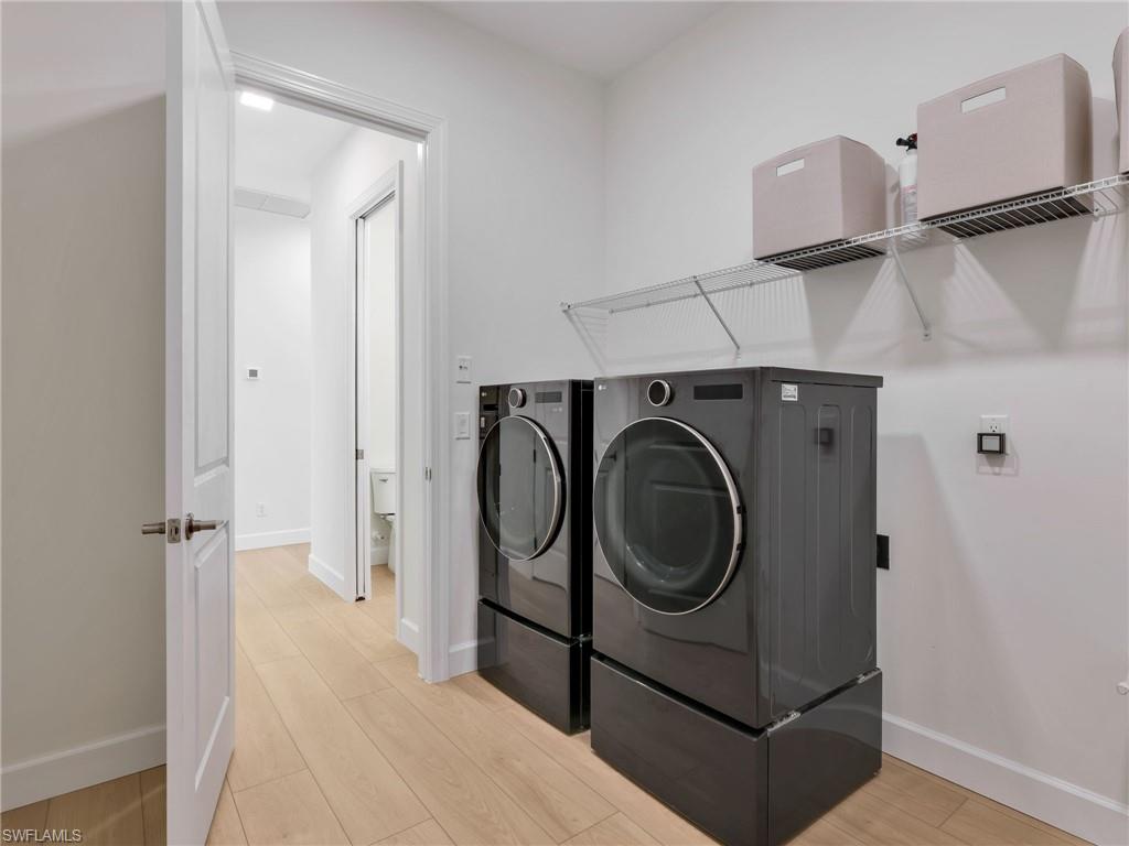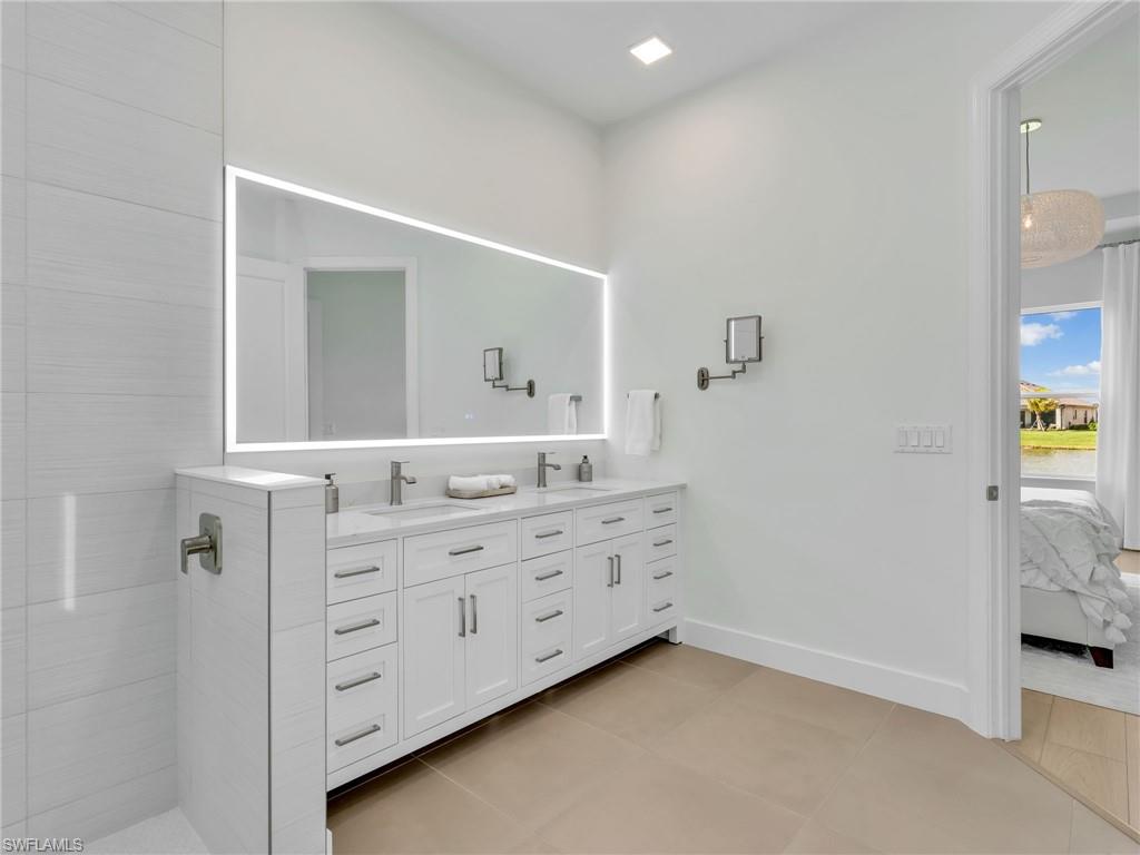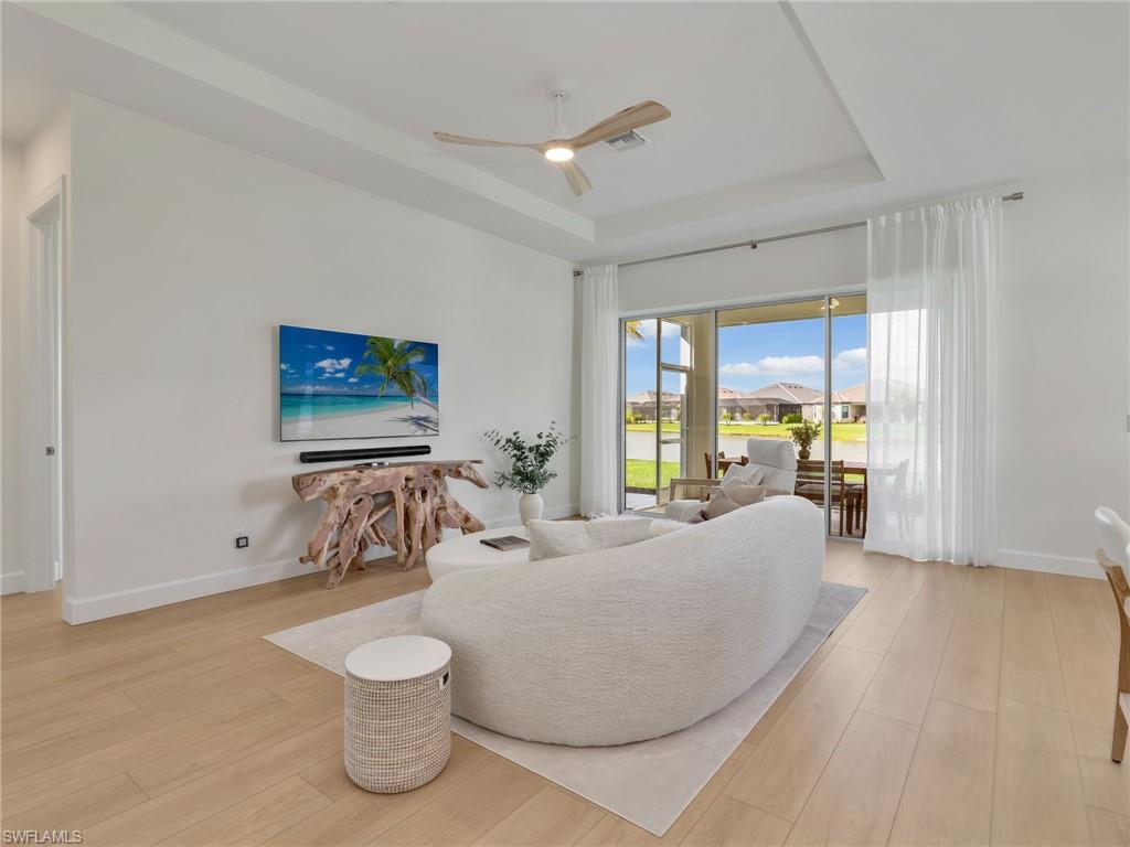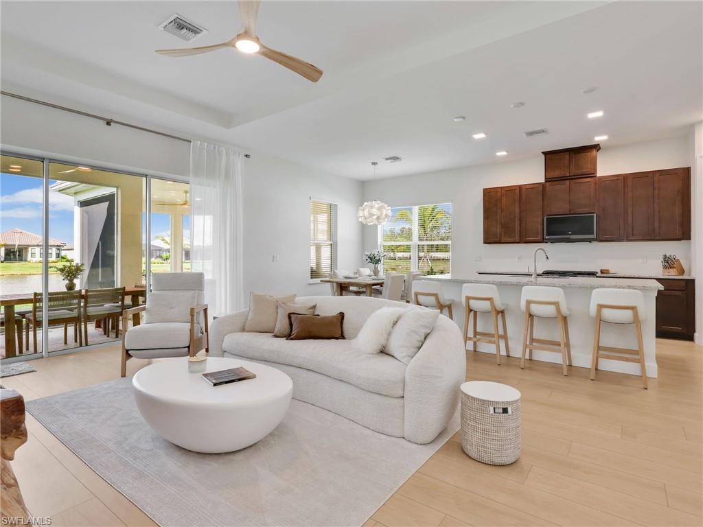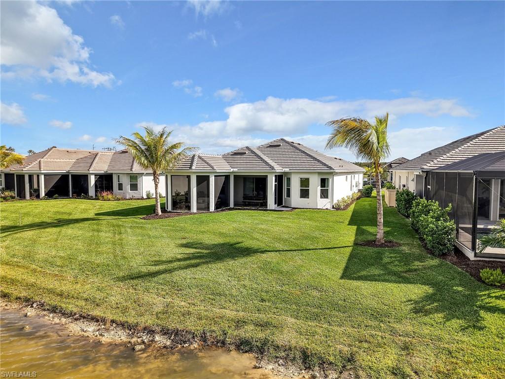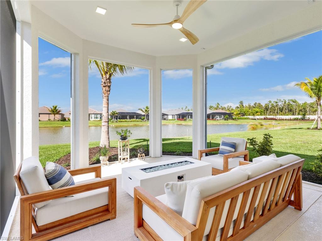 Welcome to 11934 Molto Drive, a stunning modern coastal retreat tucked away on a peaceful, low traffic, cul-de-sac road in the sought-after Esplanade Lake Club of Fort Myers, Florida. Perfectly positioned on a wide lakefront lot, this home offers breathtaking panoramic water views and exceptional privacy.Step inside and youu2019ll immediately feel the difference with its optional 10u2019 ceilings and trays in the master, living, foyer, and den areas; elegant finishes; and a bright, open-concept design that seamlessly blends indoor comfort with outdoor living. The extended screened lanai captures a true resort-style ambiance, complete with an open-air setting with pre-plumbing for a natural gas outdoor kitchenu2014no propane tanks needed!The kitchen is a showpiece, featuring LG black stainless steel appliances, a natural gas range, large island with a walk-in pantryu2014perfect for entertaining or everyday living. Each of the three spacious bedrooms includes its own private en suite bath and custom-designed walk-in closet, offering both luxury and convenience. A separate powder room provides additional comfort for guests.Designer details abound, including floor-to-ceiling draperies, West Elm lighting, Willow Wood vanities, Kohler undermount sinks and fixtures, Moen faucets, and Silestone Calacatta Gold quartz countertops. Each shower features floor-to-ceiling tile and thoughtfully designed niches not offered by the builder.The three-car garage was designed for the automobile enthusiastu2019s. With 10u2019 ceilings, it can accommodate a lift and features professional shop lighting, 60-amp EV pre-wiring, extra 120V outlets, a custom epoxy floor, and multiple ceiling storage racks. The garage is also insulated and includes a mini-split system, keeping the temperature at a cool 74 degrees year-round. The driveway has also been expanded on both sides for additional space.Living in Esplanade Lake Club means enjoying Lake Comou2019s 352 acres of boating and kayaking. Esplanade also features private, members-only amenities such as the Bahama Bar, a resort-style pool with cabanas, a fitness center, a full-service spa, tennis and pickleball courts, a dog park, and scenic walking trails.This exceptional home isnu2019t just a place to liveu2014itu2019s a custom-designed sanctuary that perfectly embodies the Southwest Florida lifestyle