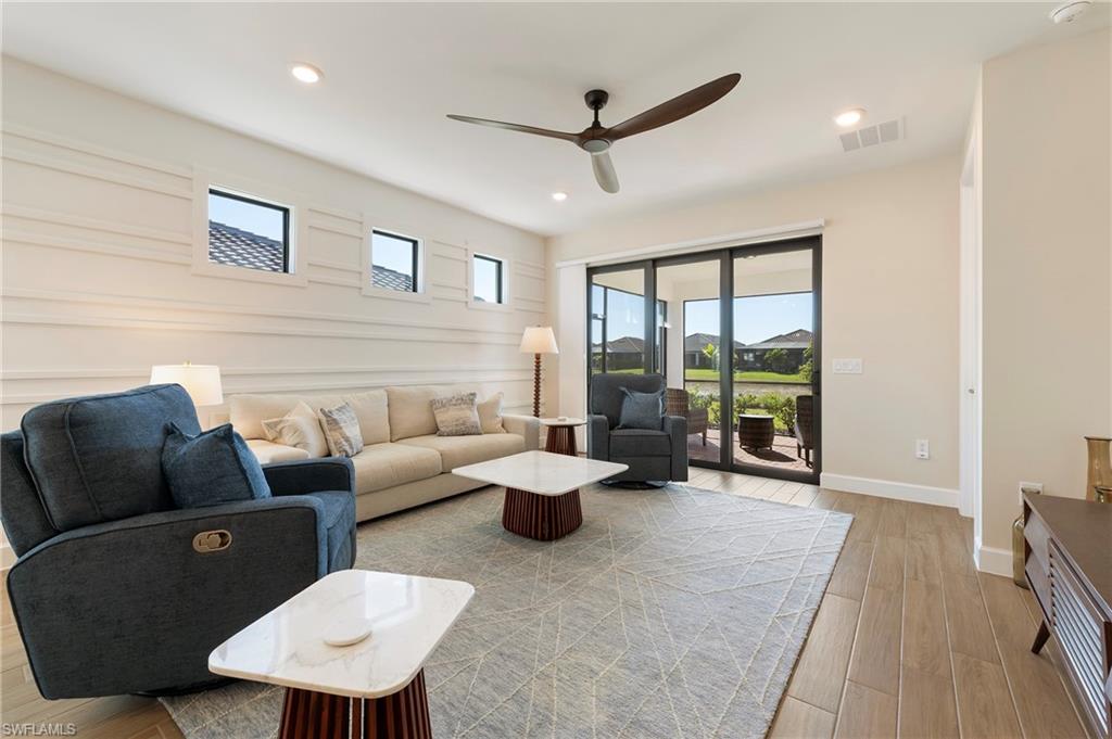 2027 SEASONAL RENTAL AVAILABLE DEC - APRIL @ $8,000/MONTH AND ANNUALLY/OFF SEASON @$4,000/MONTH (RENTED FOR SEASON 2026). This beautifully furnished Ellenwood villa is set on a peaceful waterfront lot with sunny southern exposure and tranquil views.The home offers 2 bedrooms, 2 full baths, and an enclosed den, with no carpet throughout. Wide plank tile flooring flows through the entire home, complemented by custom accent walls, tray ceilings, recessed lighting, and modern ceiling fans.The upgraded kitchen features quartz countertops, white cabinetry, stainless steel appliances, gas range, tile backsplash, center island with seating, and pendant lighting.The primary suite includes a tray ceiling, accent wall, and a spa-style bath with dual quartz vanities and a walk-in glass shower. The guest bedroom and second bath are equally well finished.Sliding glass doors open to a screened, covered lanai with paver flooring and peaceful water views. Additional features include a laundry room with storage and a two-car garage with epoxy flooring.Residents enjoy an exceptional resort-style community featuring a grand clubhouse, social lounge, on-site dining, fitness center, pickleball and tennis courts, lakefront beach area, sparkling resort pool, cabanas, community park, and scenic walking and biking paths. A full calendar of social events and activities creates an active, vibrant lifestyle.