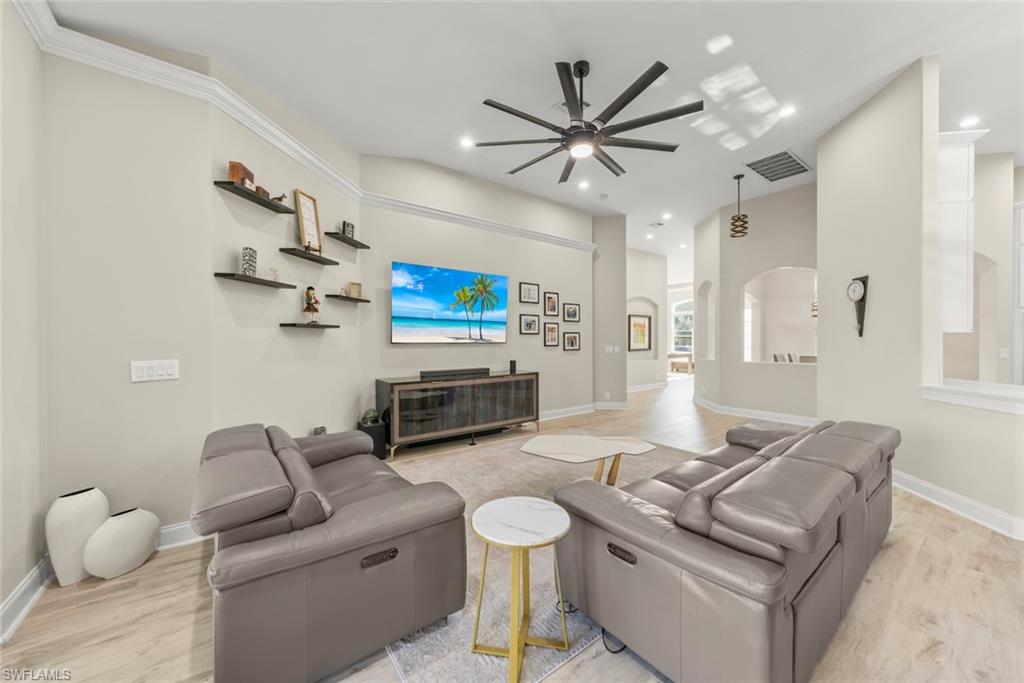 Located within the prestigious Fiddlesticks Country Club, this 3-bedroom, 3-bath residence has been extensively renovated to deliver modern comfort and timeless elegance. The expanded paver driveway provides ample space for family and friends, while the interior of the home features a completely remodeled kitchen with brand-new appliances, sleek finishes, and thoughtful design, creating an ideal space for both everyday living and entertaining. All bathrooms have been beautifully updated, complemented by fresh interior paint, new flooring, and contemporary lighting fixtures and ceiling fans throughout. Brand-new impact windows and an impact-rated front door provide enhanced security, energy efficiency, and a refined aesthetic. Designed for exceptional indoor-outdoor living, the home offers a heated private screened pool and spa, recently redone lanai floor, enclosed by a new pool screen, along with a pool heater for year-round enjoyment. The lanai is enhanced with ambient lighting, while professionally installed landscape lighting creates a warm, inviting atmosphere throughout the property. Additional highlights include a spacious 3-car garage, new A/C system (2025), and a roof replaced in 2021, offering peace of mind and long-term value. Meticulously updated and move-in ready, this residence presents a rare opportunity to enjoy elegant living within one of Southwest Floridau2019s most sought-after country club communities. MANDATORY EQUITY MEMBERSHIP FEE OF $115,000 DUE AT CLOSING. ADDITIONAL MONTHLY FEES APPLY.
