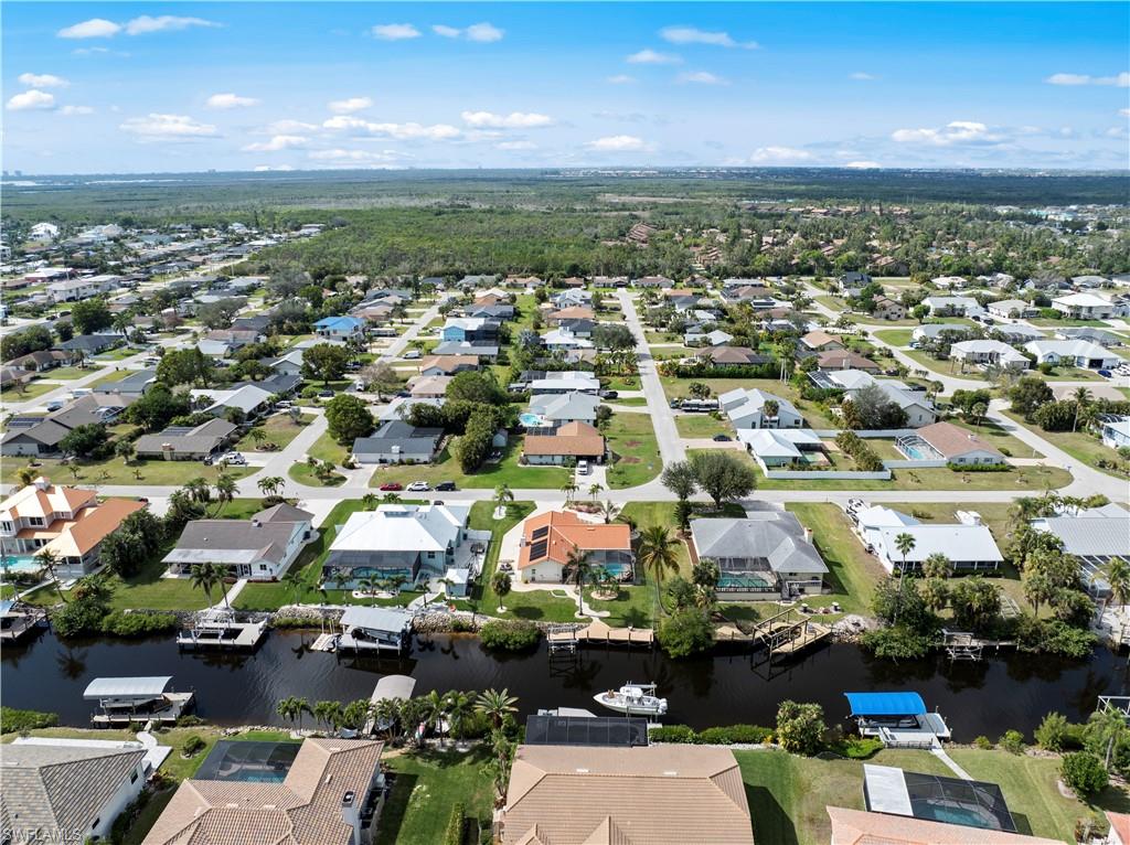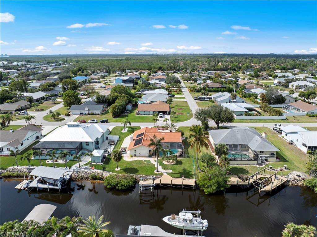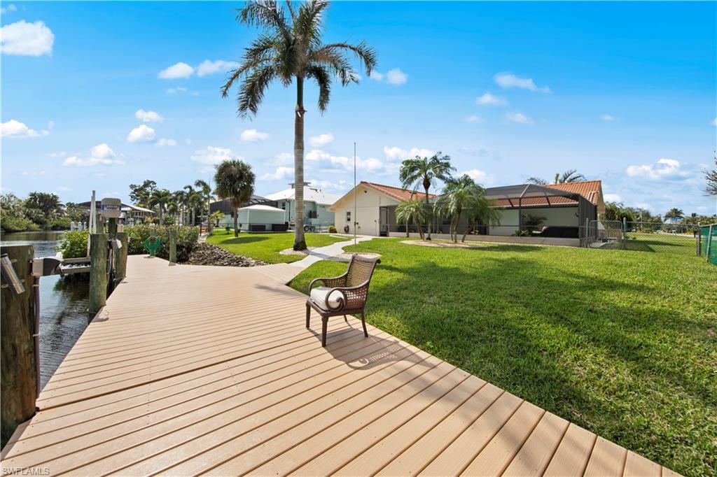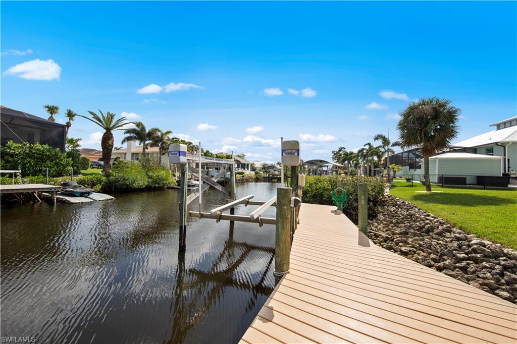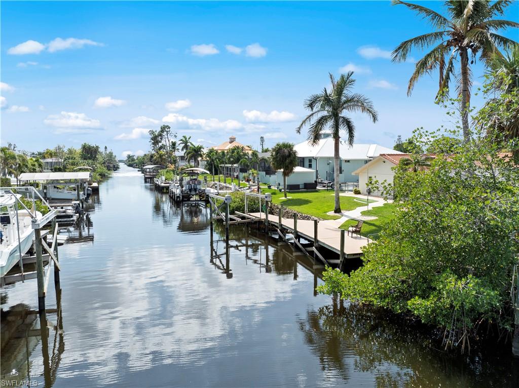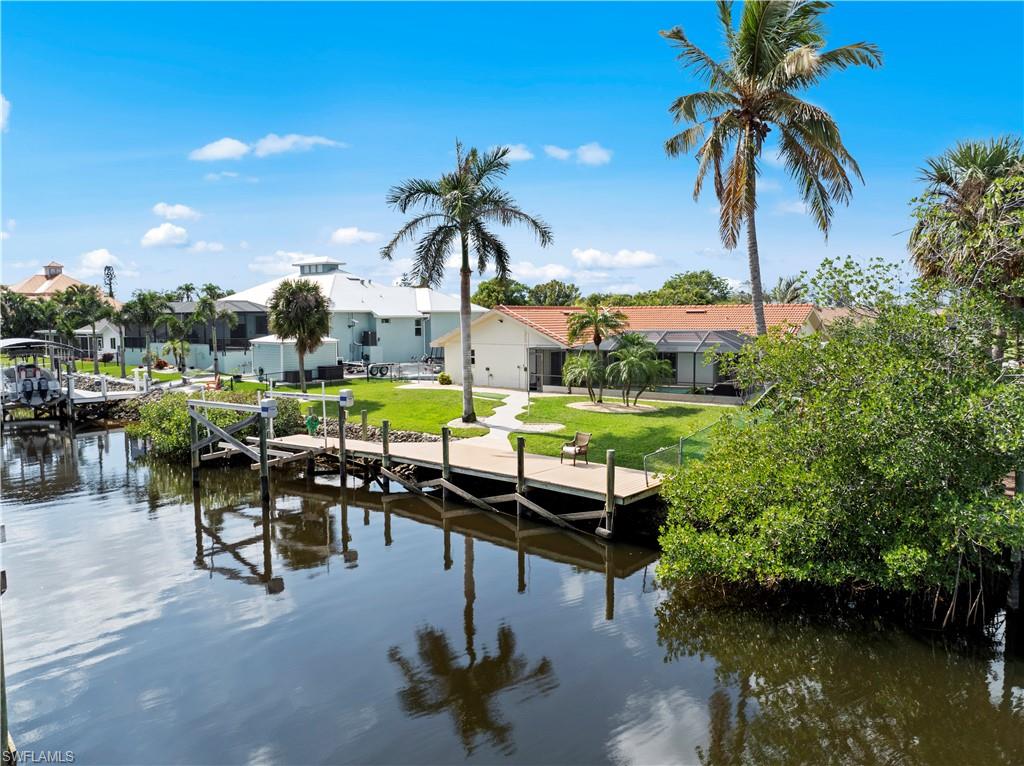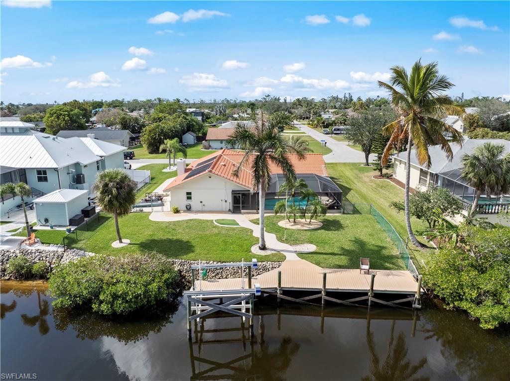 Welcome to this completely renovated Waterfront GEM now available in Island Park Woodlands. If youu2019ve been dreaming of the perfect Florida lifestyle, this waterfront home has everything you need from your backyard you can enjoy boating, kayaking paddleboarding with direct access to Estero Bay and the Gulf, along with world class fishing from your own private 400sq ft composite dock which features an all-aluminum 7,000 lb. boat lift with new stainless lift motors. Watch the manatees and boats go by as you catch snook, tarpon, snapper, jacks, and many other species from your own dock. This 3-bedroom 2 bath home is all about easy waterfront living. Step outside to the lanai where you will find a screened, solar heated in-ground pool. Which is perfect for relaxing, entertaining or enjoying the water views. There is all new landscaping which includes a 6-zone sprinkler system a fully fenced backyard and a Coach / RV pad with electric hookup. The home is concrete block construction with a new tile roof (2019) all hurricane impact windows and sliding doors (2022), new electric and plumbing (2022) new kitchen with custom shaker style soft close cabinetry, stainless steel appliances and granite counters, 2-new baths with custom tile and shaker style soft closes vanities with quartz tops and vessel sinks. The master bedroom has access to the lanai and the master bath features costume walk in glass tile shower. The home also has a new ceramic tile throughout (2022) new HVAC and HW heater (2022). Exterior painted (2025) and a wood burning fireplace in the family room. The Island Park Woodlands is a tranquil yet active community which offers amenities such as private boat ramp, tennis pickleball; cts, playground, BBQ area and lake Grasmere with a t-dock, HOA dues is only $ 240.00 per year.FFor peace of mind the home has a flood insurance policy that is well priced and Transferrable with an extremely low deductible.