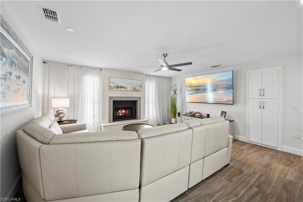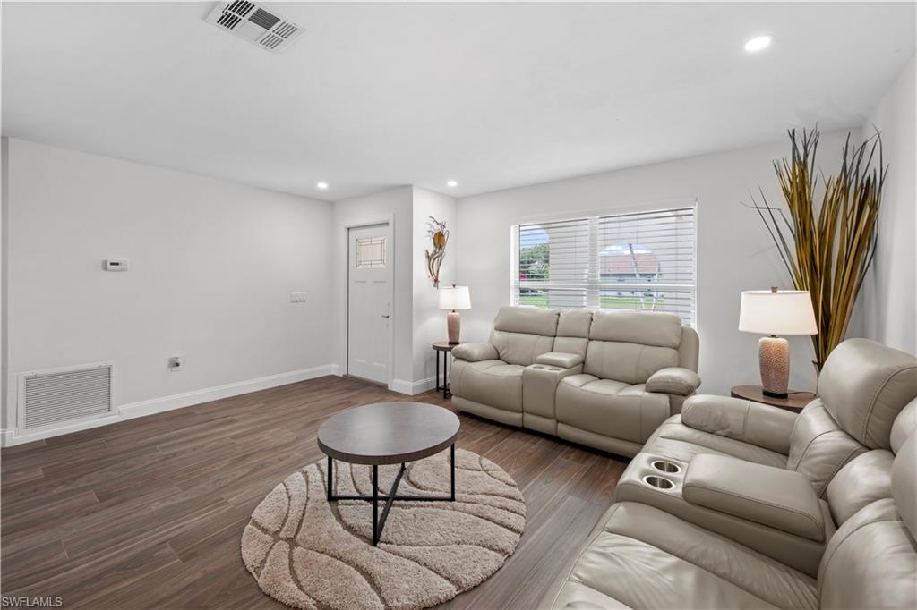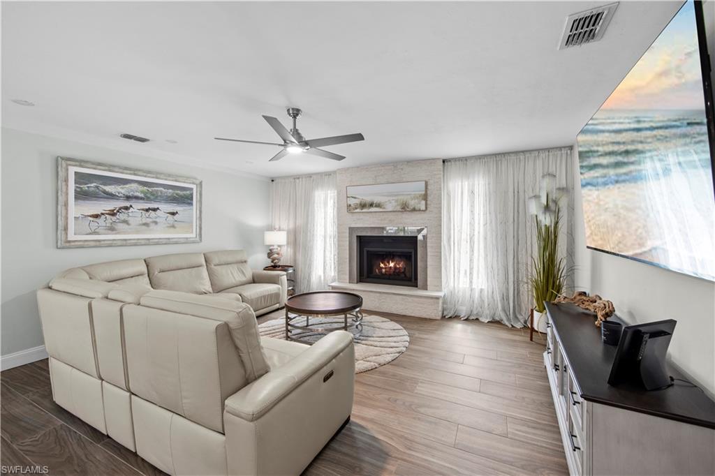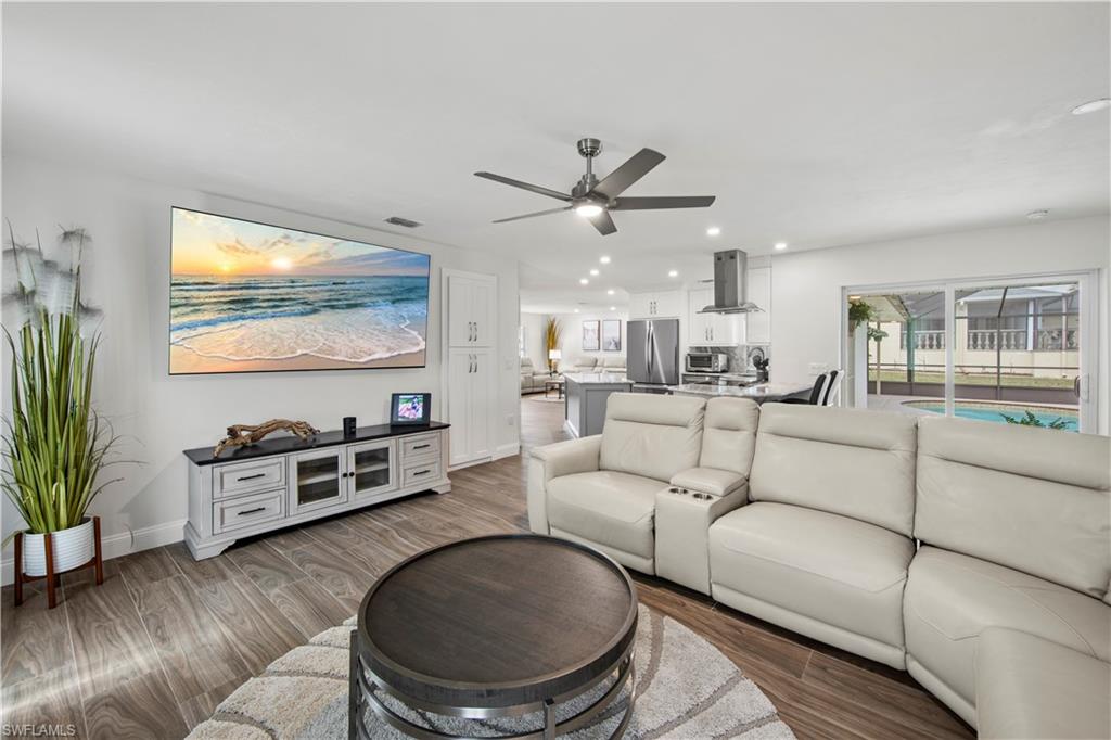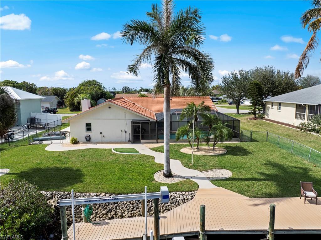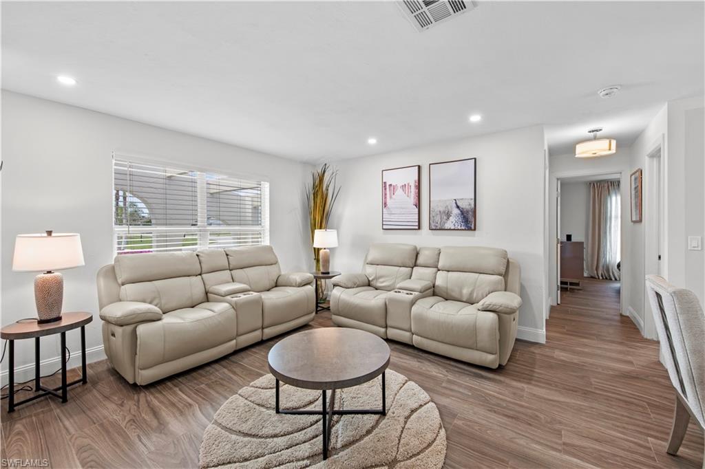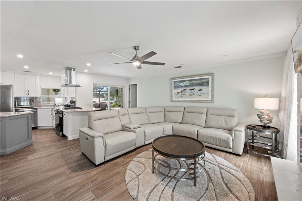 Welcome to this completely renovated Waterfront GEM now available in Island Park Woodlands. If youu2019ve been dreaming of the perfect Florida lifestyle, this waterfront home has everything you need from your backyard you can enjoy boating, kayaking paddleboarding with direct access to Estero Bay and the Gulf, along with world class fishing from your own private 400sq ft composite dock which features an all-aluminum 7,000 lb. boat lift with new stainless lift motors. Watch the manatees and boats go by as you catch snook, tarpon, snapper, jacks, and many other species from your own dock. This 3-bedroom 2 bath home is all about easy waterfront living. Step outside to the lanai where you will find a screened, solar heated in-ground pool. Which is perfect for relaxing, entertaining or enjoying the water views. There is all new landscaping which includes a 6-zone sprinkler system a fully fenced backyard and a Coach / RV pad with electric hookup. The home is concrete block construction with a new tile roof (2019) all hurricane impact windows and sliding doors (2022), new electric and plumbing (2022) new kitchen with custom shaker style soft close cabinetry, stainless steel appliances and granite counters, 2-new baths with custom tile and shaker style soft closes vanities with quartz tops and vessel sinks. The master bedroom has access to the lanai and the master bath features costume walk in glass tile shower. The home also has a new ceramic tile throughout (2022) new HVAC and HW heater (2022). Exterior painted (2025) and a wood burning fireplace in the family room. The Island Park Woodlands is a tranquil yet active community which offers amenities such as private boat ramp, tennis pickleball; cts, playground, BBQ area and lake Grasmere with a t-dock, HOA dues is only $ 240.00 per year.FFor peace of mind the home has a flood insurance policy that is well priced and Transferrable with an extremely low deductible.