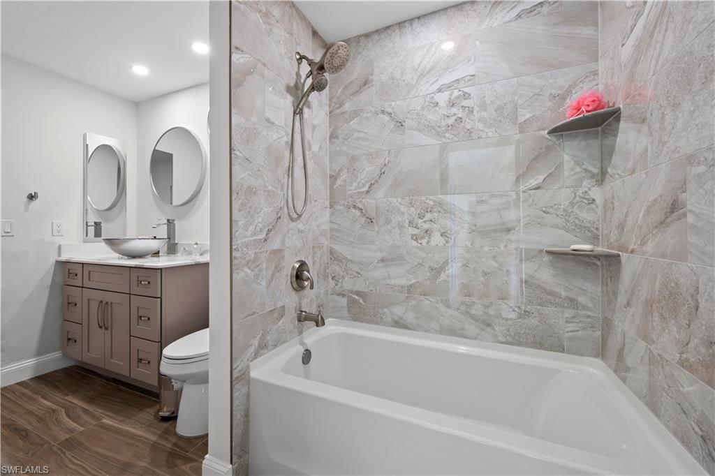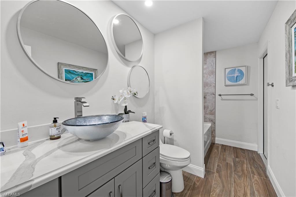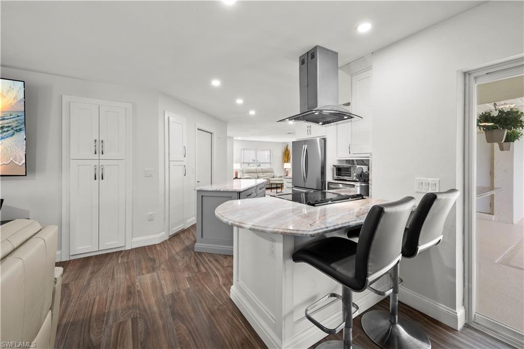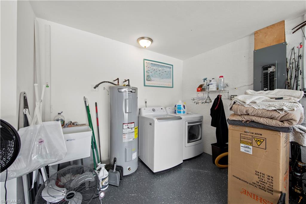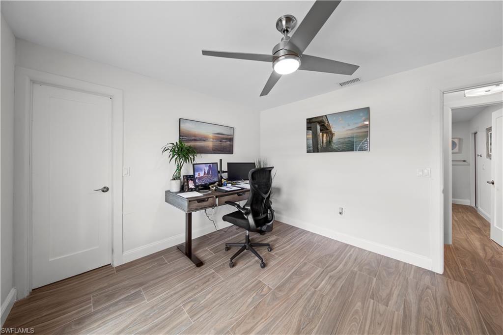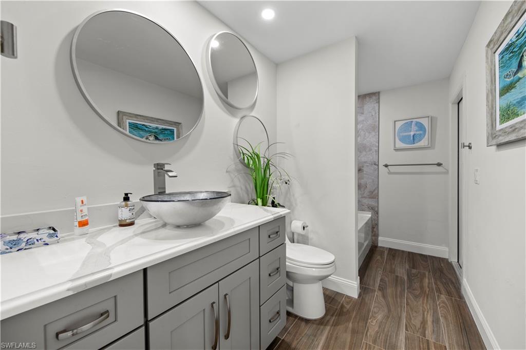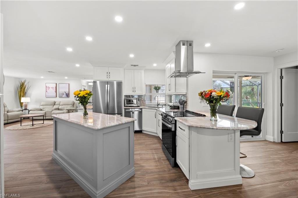 Welcome to this completely renovated Waterfront GEM now available in Island Park Woodlands. If youu2019ve been dreaming of the perfect Florida lifestyle, this waterfront home has everything you need from your backyard you can enjoy boating, kayaking paddleboarding with direct access to Estero Bay and the Gulf, along with world class fishing from your own private 400sq ft composite dock which features an all-aluminum 7,000 lb. boat lift with new stainless lift motors. Watch the manatees and boats go by as you catch snook, tarpon, snapper, jacks, and many other species from your own dock. This 3-bedroom 2 bath home is all about easy waterfront living. Step outside to the lanai where you will find a screened, solar heated in-ground pool. Which is perfect for relaxing, entertaining or enjoying the water views. There is all new landscaping which includes a 6-zone sprinkler system a fully fenced backyard and a Coach / RV pad with electric hookup. The home is concrete block construction with a new tile roof (2019) all hurricane impact windows and sliding doors (2022), new electric and plumbing (2022) new kitchen with custom shaker style soft close cabinetry, stainless steel appliances and granite counters, 2-new baths with custom tile and shaker style soft closes vanities with quartz tops and vessel sinks. The master bedroom has access to the lanai and the master bath features costume walk in glass tile shower. The home also has a new ceramic tile throughout (2022) new HVAC and HW heater (2022). Exterior painted (2025) and a wood burning fireplace in the family room. The Island Park Woodlands is a tranquil yet active community which offers amenities such as private boat ramp, tennis pickleball; cts, playground, BBQ area and lake Grasmere with a t-dock, HOA dues is only $ 240.00 per year.FFor peace of mind the home has a flood insurance policy that is well priced and Transferrable with an extremely low deductible.