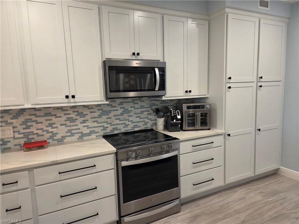 Super nice, completely remodeled second floor 2 bedroom + den garden home with 1 car garage and an fantastic lake and golf course view. This Social membership garden home in Legends Country Club has new flooring, new kitchen cabinets, quartz counters, stainless appliances, the sellers expanded the dan and added a closet, both bathrooms are remodeled, the lanai has glass sliders, all done with tasteful coastal look. Social members enjoy living and beautiful, friendly Country Club without the expense of golf but get to enjoy tennis, pickle ball, fitness center with free classes, 3 outstanding restaurants and perhaps the best resort style pools in all of SW Florida. Legends has no city taxes
