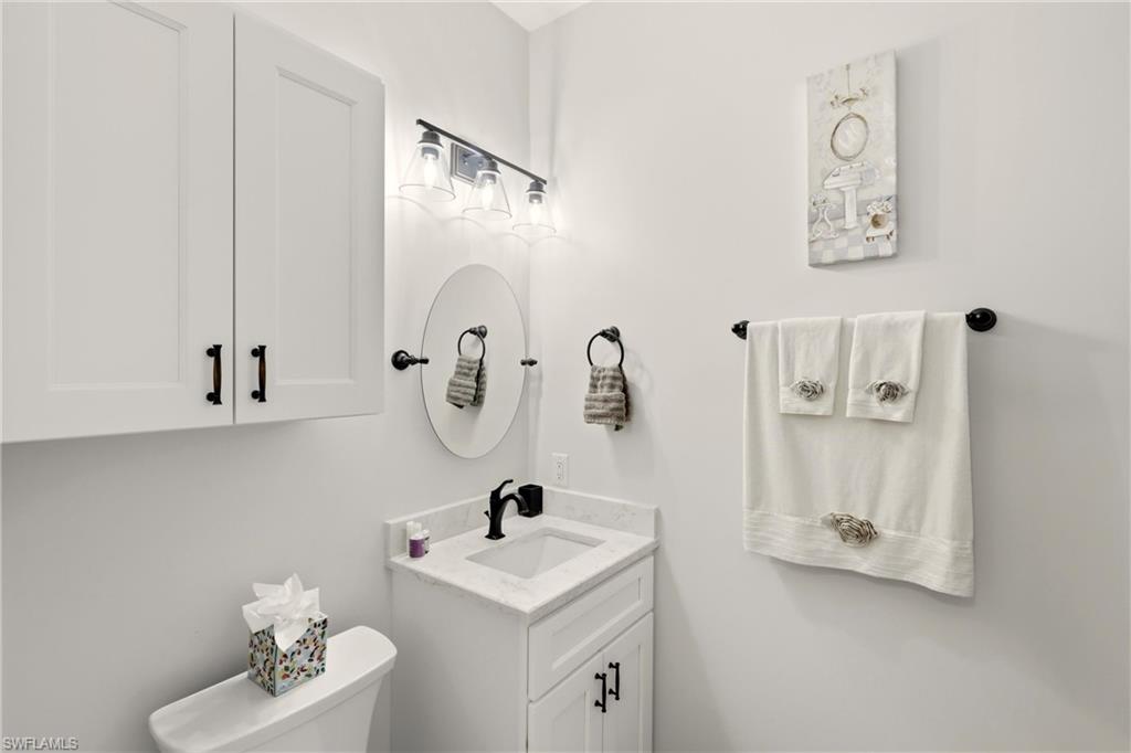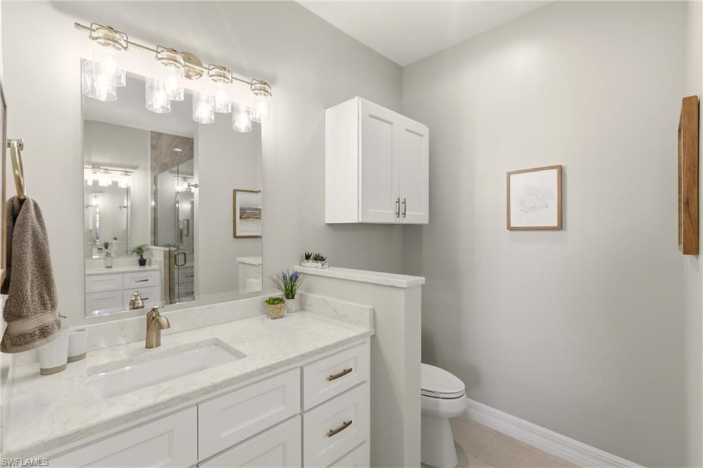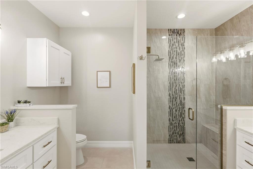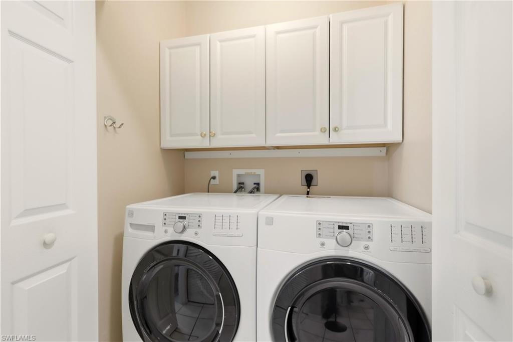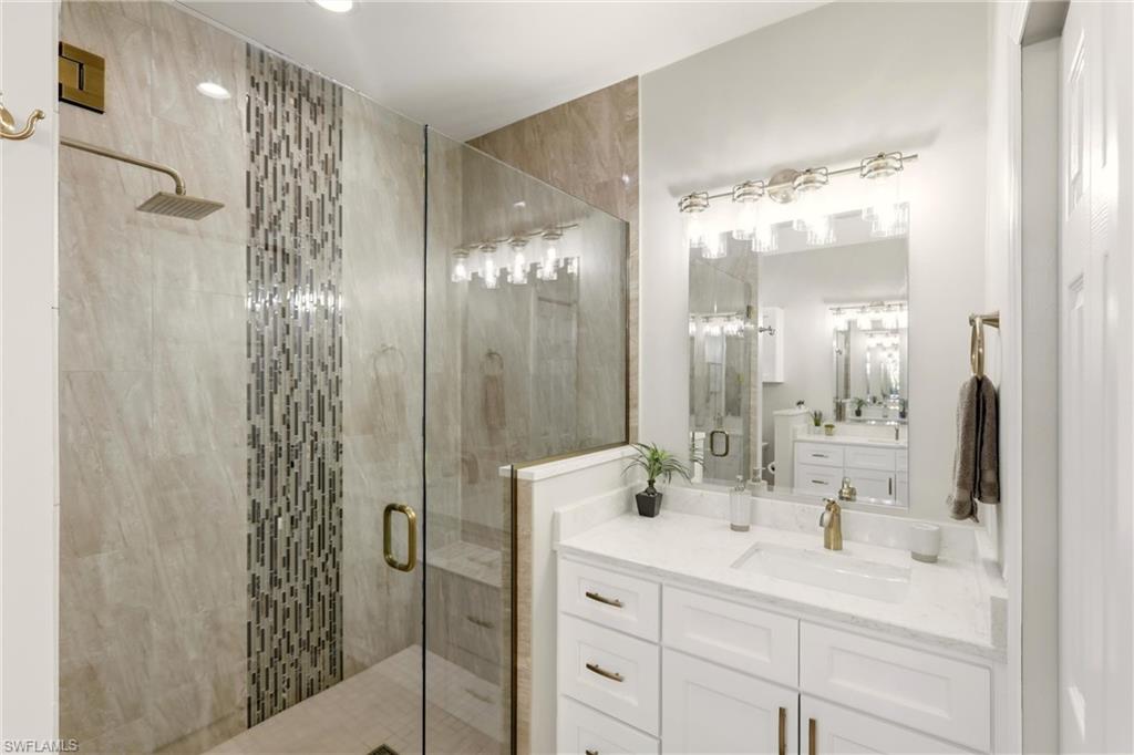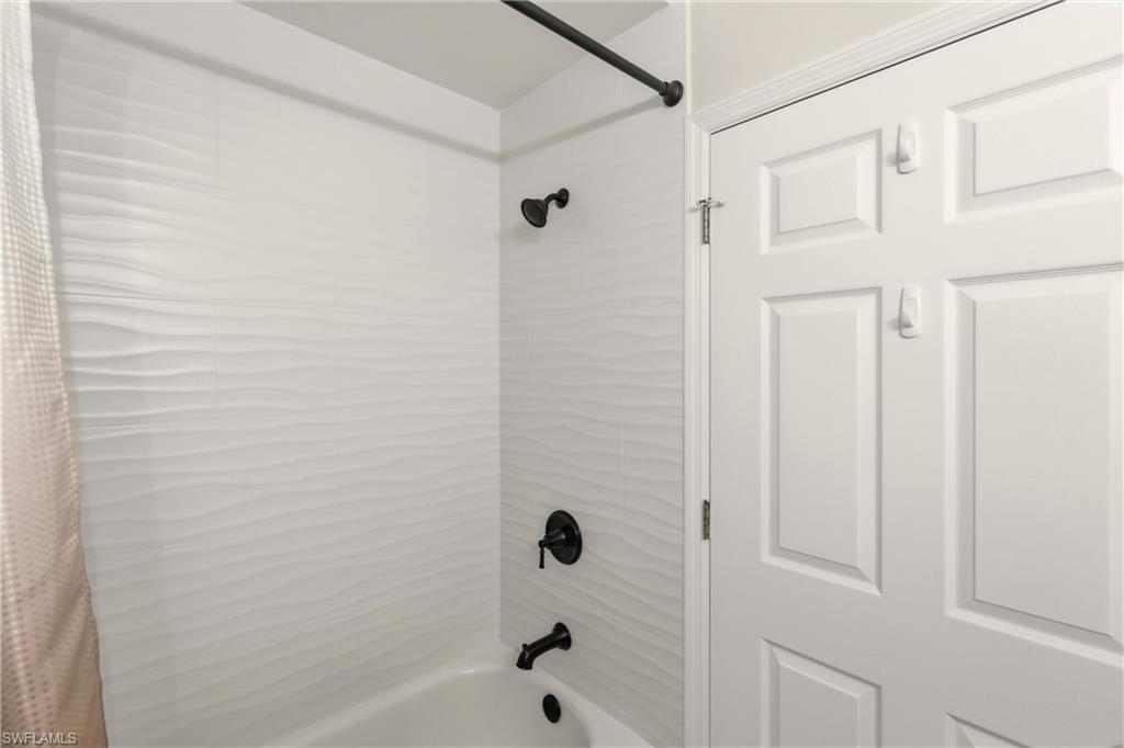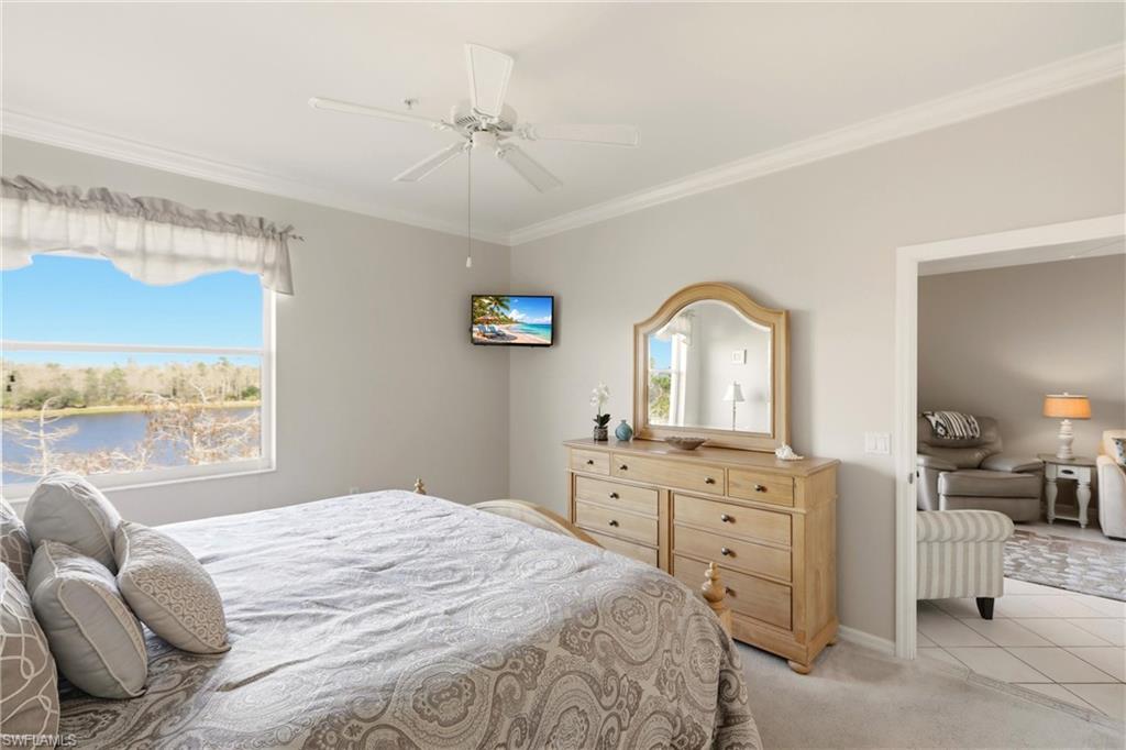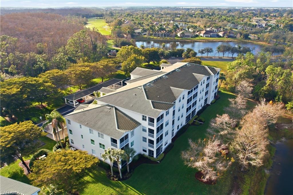 Priced to sell quickly with this beautiful TOP floor Waterfront condo and only steps to the Clubhouse!! Updated kitchen with Granite Counters, New Hardware and Black Slate Appliance Package with Slide in Range. Both baths are completely done over and WOW what a beautiful master bath! Gorgeous waterfall accented shower, Updated His and Her Vanities, Rain Shower Head with extra sprayers, Quartz Counters, New Hardware, Seamless Shower Glass, Custom Lighting and Mirrors. The guess bath also has been updated with Beveled Style Tile in the shower, Updated Cabinetry, Quartz, Kohler Comfort Height Toilet and more.!! Large capacity washer and dryer with storage cabinets above and in 2019 a new AC and Water Heater. This beauty is nicely painted in coastal colors and accented with Crown Molding, Plantation Shutters and Custom Lighting. This is a GOLF Membership property and being sold TURNKEY with lovely furnishings and accents. The Legends is a prestigious private country club w/ a 30,000+ sq ft Clubhouse offering fine dining, a casual sports pub & a spectacular outdoor Sunset Grill aside a lagoon style pool with a waterfall!!!! Tons of amenities to choose from such as tennis, championship golf, bocce ball, pickle ball & an exercise facility with plenty of classes to choose from. Premium location... Located close to shopping, dining, entertainment, the interstate and RSW international airport. Low carrying costs with no cart or green fees & low taxes. Resort Style Living to it's finest, turnkey and move in ready!!