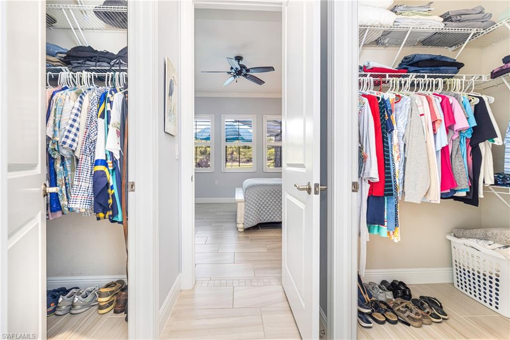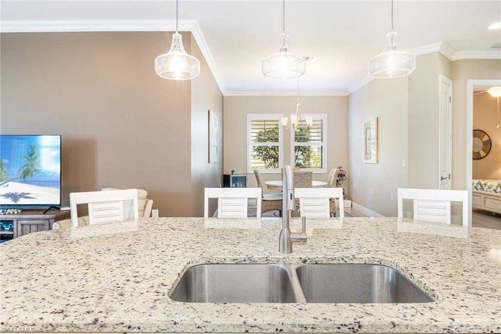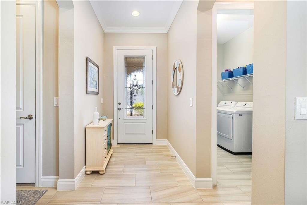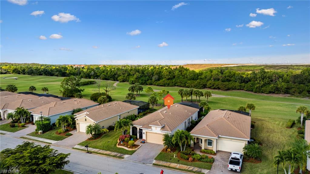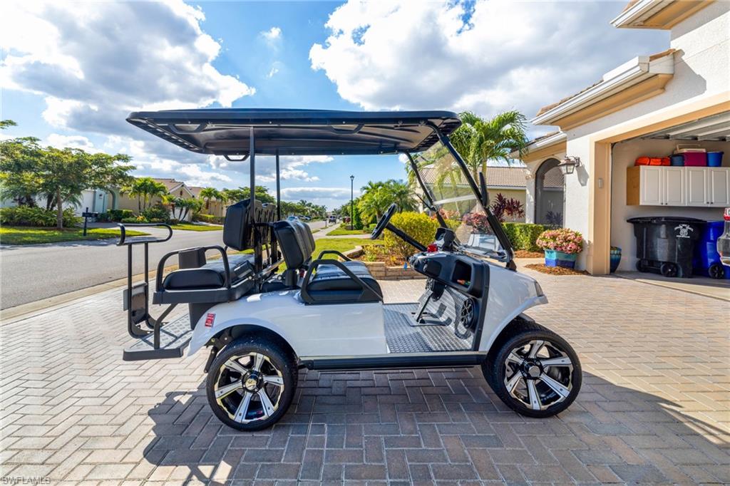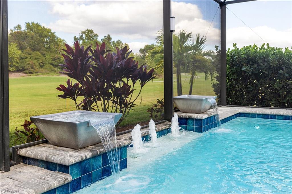 The stunning saltwater pool is the focal point of this exquisite home! Installed four years ago by Design Concepts, the pool features beautiful water features with display lights for evening enjoyment. The spacious pool deck offers ample room for relaxation or entertaining, all while enjoying views of the golf course and surrounding nature with no neighboring homes in sight, providing a high level of privacy. Plumbing is available for a potential summer kitchen, adding to the outdoor entertaining possibilities. Upon entering the home, you are greeted by a screened front entryway, providing an additional space to enjoy the beautiful Florida weather and welcome guests. The Nautilus floor plan offers a versatile flex room that leads into the great room, creating a seamless flow throughout the home. The kitchen appliances are newer, and the washer and dryer are very new, adding to the modern conveniences of the home. This WCI custom home boasts amazing 13-foot ceilings and 10-foot doors, creating a sense of grandeur throughout. The plank tile flooring adds a touch of elegance, while plantation shutters adorn all rooms, providing both style and functionality. Accordion shutters on all windows and doors, as well as electric storm smart shutters on the lanai, offer peace of mind during inclement weather. The high-end furniture is negotiable, allowing for a seamless transition into this luxurious home. The garage is equipped with extra storage areas, providing ample space for belongings. Additionally, the golf cart is available for purchase, adding to the convenience and enjoyment of living in this community. Located in Pelican Preserve, a sought-after 55+ community that has received national recognition for its exceptional lifestyle amenities, this home is sure to attract attention. Don't miss out on the opportunity to live the dream in this vibrant community. Experience the best of what Pelican Preserve has to offer - you will love it here.