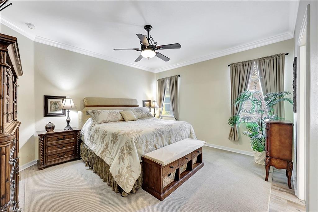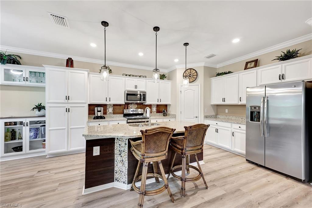Donu2019t miss this beautifully upgraded home that stands out! Offered furnished, complete with a golf cart, this residence features two bedrooms and a spacious office that can easily be converted into a third bedroom. You will love the open concept floor plan with attention to detail, featuring laminate wood flooring throughout, crown molding, and an extended kitchen designed for style and functionality, complete with white shaker cabinetry, stainless steel appliances, level-5 granite countertops, and a kitchen island ideal for meal prep or entertaining. The primary suite offers a generous walk-in closet, dual vanities, and a walk-in shower for comfort and convenience. Go outside to enjoy Florida living at its best on your extended screened-in paver lanai, ideal for relaxing or hosting guests. Beyond the lanai, the expansive backyard offers exceptional beauty, privacy and space, highlighted by lush landscaping and wide-open green views that make outdoor living feel serene and inviting. There is ample room to add a pool, giving future owners the opportunity to create their own private oasis. For peace of mind, this home features electric roll-down shutters on the lanai, accordion shutters around the house, in-wall pest control tubing, a whole-house water softener system, roof resealed in 2023 with an active maintenance contract and solar panels to help reduce energy costs. The garage provides extra storage with built-in shelving, metal cabinetry and a workbench, plus the golf cart with a recently replaced battery is included! In Pelican Preserve, one of Southwest Floridau2019s desirable 55-plus gated communities, residents enjoy resort-style living with 27-hole championship golf course, a 38-acre preserve, a 70,000 square feet town center that features indoor lap and outdoor resort styled pools, restaurants, cinema with free movies, state-of-the-art fitness center, indoor walking track, cyber cafe, six tennis courts with established tennis program, pickleball court and amphitheater. Close to the airport and some of the best dining, entertainment and beaches in Southwest Florida.