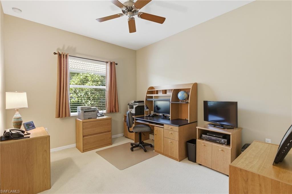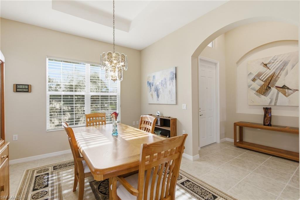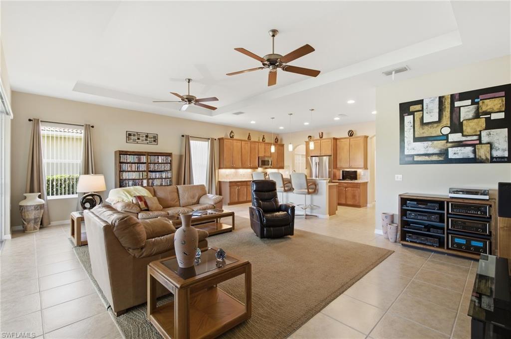 Explore this stunning property located in the sought-after Carena neighborhood. With 193 homes, low fees, and a plethora of amenities, this property is truly a gem. The original owners have meticulously maintained the property, ensuring it is in pristine condition. The San Remo floor plan offers 3+ bedrooms and 2.5 baths, along with ample counter space, cabinets, 2 pantries, and under cabinet lighting in the kitchen. Storage is abundant throughout the home, and the lanai provides a perfect spot to relax and enjoy breathtaking sunsets, water, and golf views. The property offers the potential to expand the lanai and add a pool. Featuring tile flooring throughout and carpet in the bedrooms that appears brand new, tray ceilings, LED lighting, and a flex room that can be used as a dining room or den, this property is both stylish and functional. The laundry room includes cabinets and a utility sink, and the water heater was recently replaced in 2022. The garage boasts pull-down stairs and cabinets, while the screened entry adds an extra touch of charm.Partially furnished with bedroom sets, living room furniture, and bar stools, this property is move-in ready. Residents will also have access to the award-winning 55+ Pelican Preserve community, which offers a wide range of amenities such as pickleball, tennis, bocce ball, lawn bowling, softball, walking trails, dog parks, a spa, amphitheater, indoor theatre, pools, bars, restaurants, cards, craft rooms, fitness facilities, music programs, fishing areas, and more. Optional golf memberships are available for those looking to enjoy 27 holes of golf.It's time to embrace the lifestyle you've always dreamed of. Start living the life you've worked so hard for in this exceptional property.
