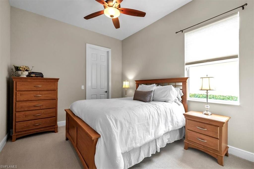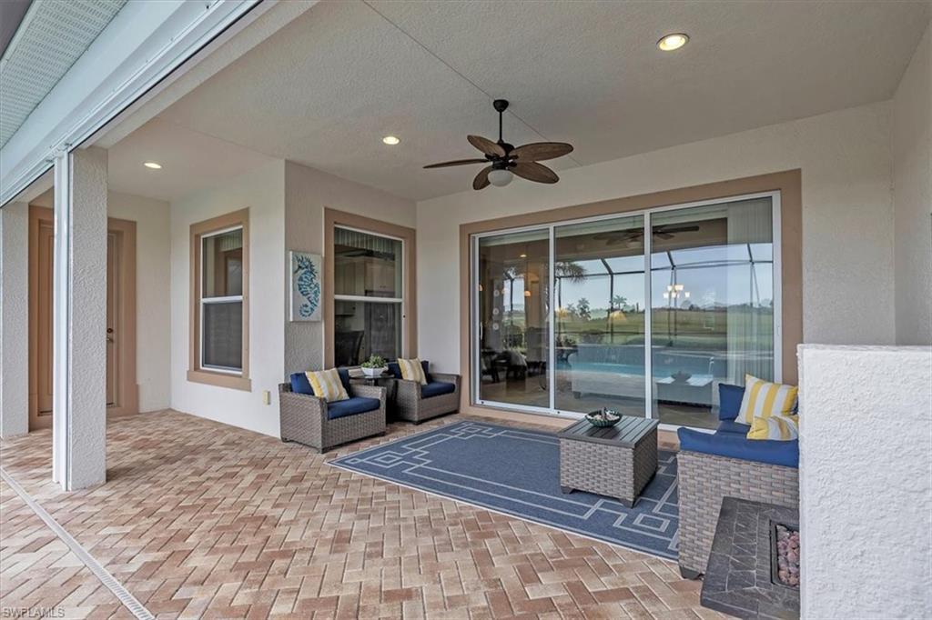 This exquisite home is situated in the award-winning Pelican Preserve community, featuring the stunning Correggio floor plan in the coveted Azzurra neighborhood. It overlooks the golf course with water views beyond. The property offers a spacious paved lanai, perfect for enjoying morning sunrises and sipping coffee. The saltwater pool and spa with waterfall and new equipment in 2021, creating a luxurious outdoor oasis. Additionally, there is a convenient half bath on the lanai and plumbing for an outdoor kitchen. Electric shutters adorn the lanai and front of the home, while accordion shutters protect all other windows. The front entry is screened in, adding to the charm and functionality of the property. Inside, high ceilings with crown molding and trays plus attractive fixtures create an elegant atmosphere. The living area features 18` diagonal tile, while the large den boasts French doors and engineered wood flooring. The kitchen has been updated with a granite island and new appliances, including 2 pantries. There is a whole house water filter system for clean and purified water. The AC was replaced in 2019, the water heater in 2018, and the roof has been inspected and deemed to be in excellent condition. The owner's suite includes his and hers counters, a soaking tub, and a large walk-in shower. The garage offers extra space for a golf cart, an extra refrigerator, and shelving for storage. Furniture is negotiable, as well as a 4-seat golf cart with new batteries. Pelican Preserve is a 55+ community known for its amenity-rich lifestyle, offering activities such as tennis, pickleball, fitness classes, dancing, bocce ball, swimming, restaurants, walking trails, a dog park, butterfly garden, softball field, and more. Residents can also enjoy a 27-hole golf course with various membership options. This exceptional property is sure to attract interest, so schedule a viewing today to experience the luxurious lifestyle that Pelican Preserve has to offer.