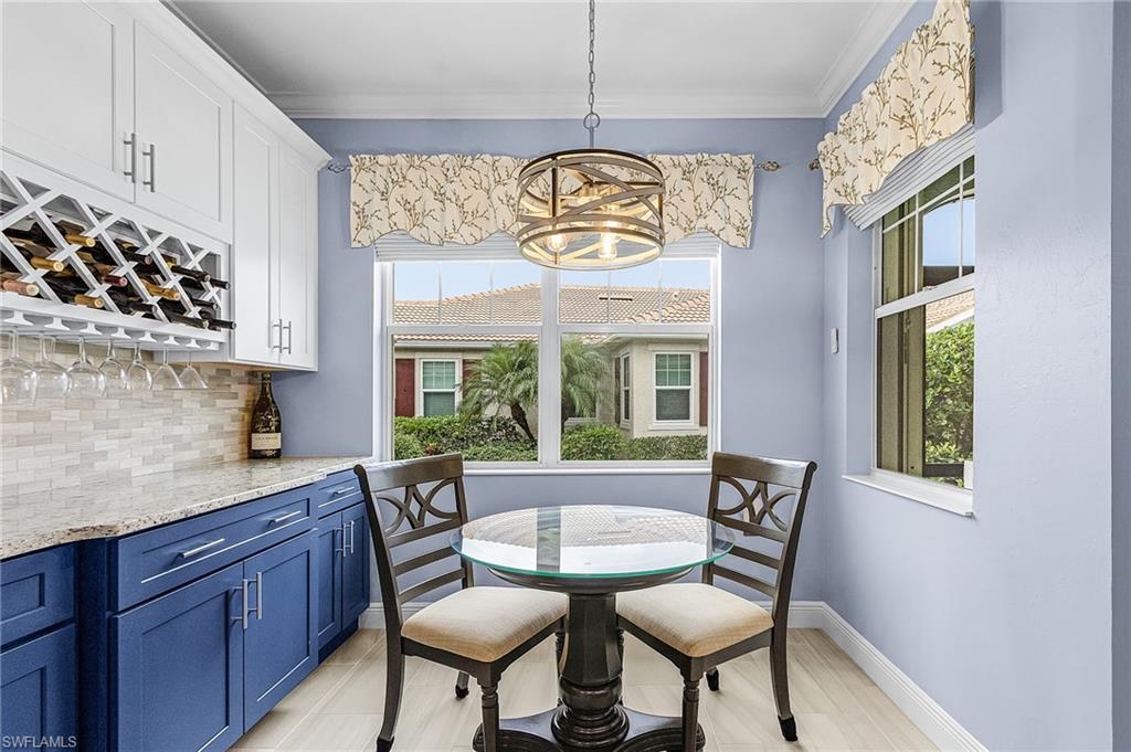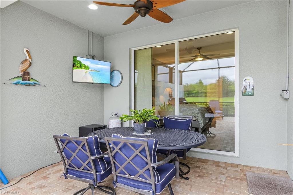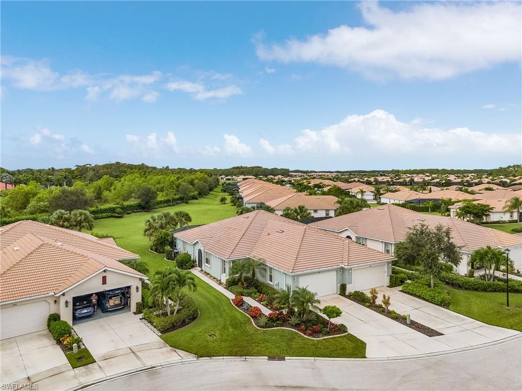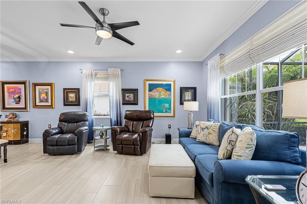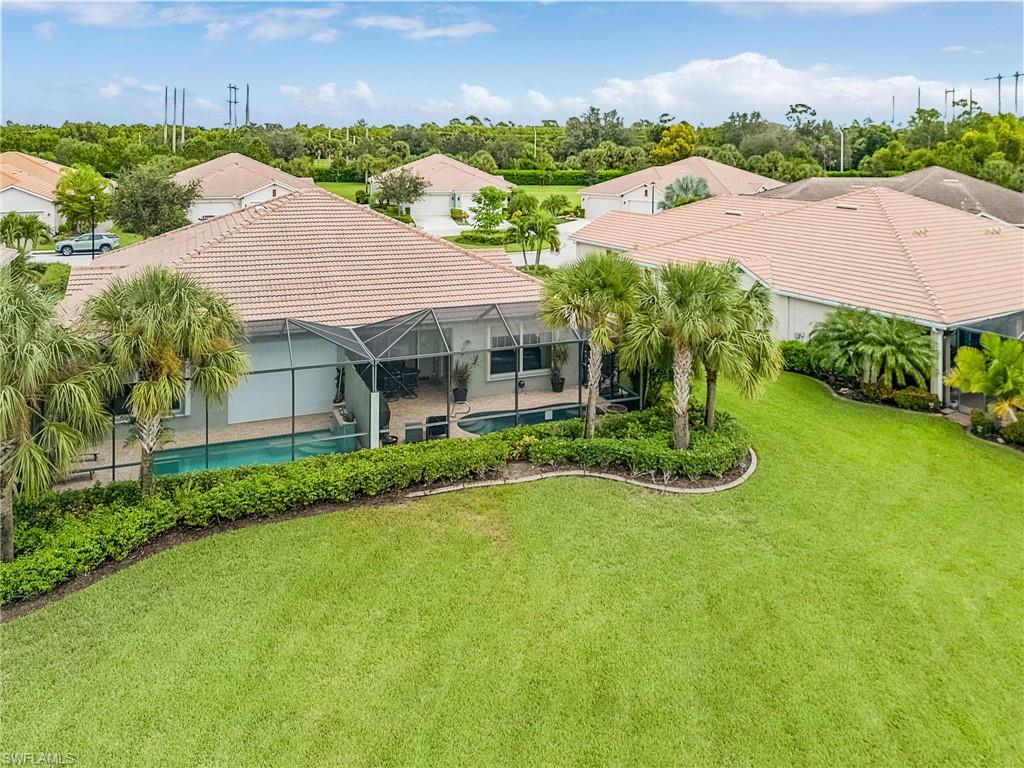 A must see villa with a great backyard setting to enjoy the screened lanai with private pool and additional lighting. There is a screened slider on the lanai that leads to the living room with crown molding and remote Roman Shades. This 3 Bedroom home boasts many upgrades starting with a screened entry with glass insert front door. There are tile floors through the main living area, Luxury Vinyl Plank flooring in the Primary and new carpet (2025) in the guest rooms. The Kitchen has beautiful two tone cabinets with under cabinet lighting, an Island and wine bar with pull out shelves, additional cabinetry in the eating area plus a Keurig coffee maker with a direct line. There are newer LG appliances with transferable coverage (5/2026). Other upgrades: Hurricane Shutters, whole home water purifier and RO (2020), Hot Water Heater (2021), HVAC with UV Light (2024), new pool pump (2024) and all LED lighting. The interior was painted (2024), exterior painted (2025), roof baffles and vents resealed (2024), fresh landscaping (2024) roof cleaned (2025) and tile floors sealed (10/2025) with a 5 year transferable warranty. There is a portable whole home generator (2024) and lanai TV that will convey with the home. This home has it all where you can move right in and start to enjoy your new resort lifestyle. Pelican Preserve is a nationally recognized active adult 55+ community with endless amenities including the Flip Flops outdoor restaurant, 3 pools, Tennis, Pickleball, Bocce, Softball, Fitness, Movie Theater, Billiards, Hobby Rooms, Amphitheater, Destinations indoor restaurant, plus many special events throughout the year. The Brokke Center includes a Library, Card Rooms and Coffee Center for socializing with friends. Pelican Preserve has a 27 hole Private Golf Club with optional memberships. Pelican Preserve is a short drive to RSW Airport and many shops and restaurants and the gulf coast beaches. It's time to call this your next home. Some furniture is available in a separate bill of sale.