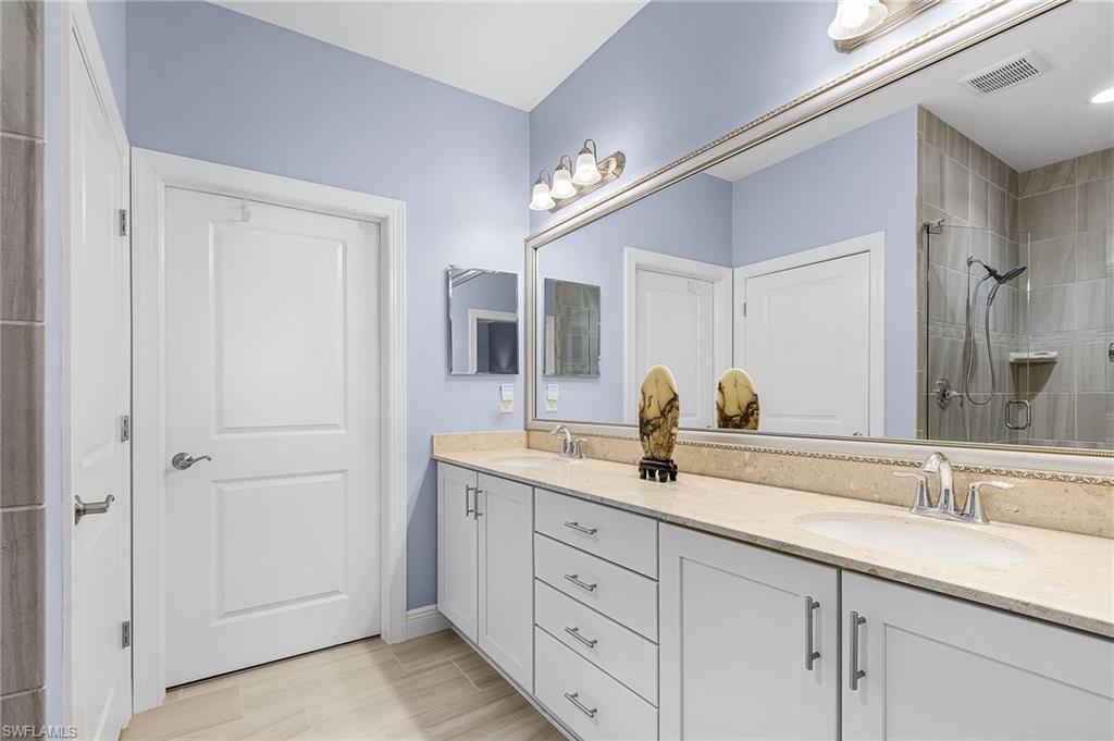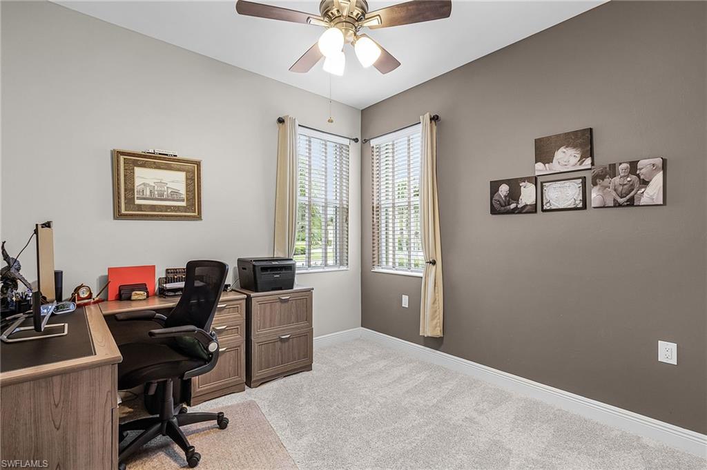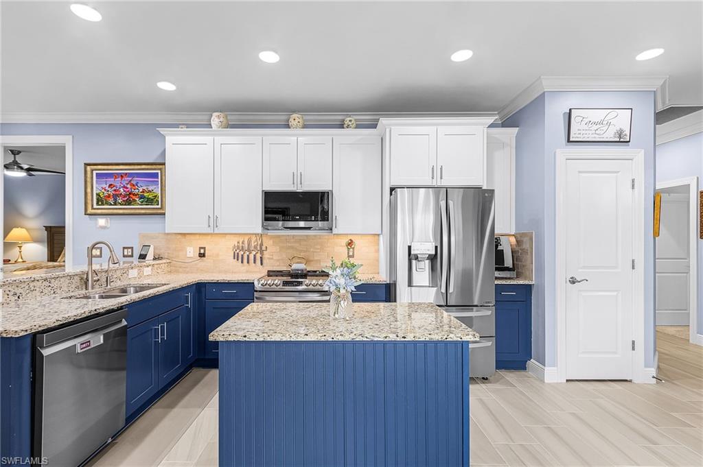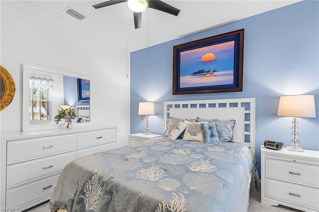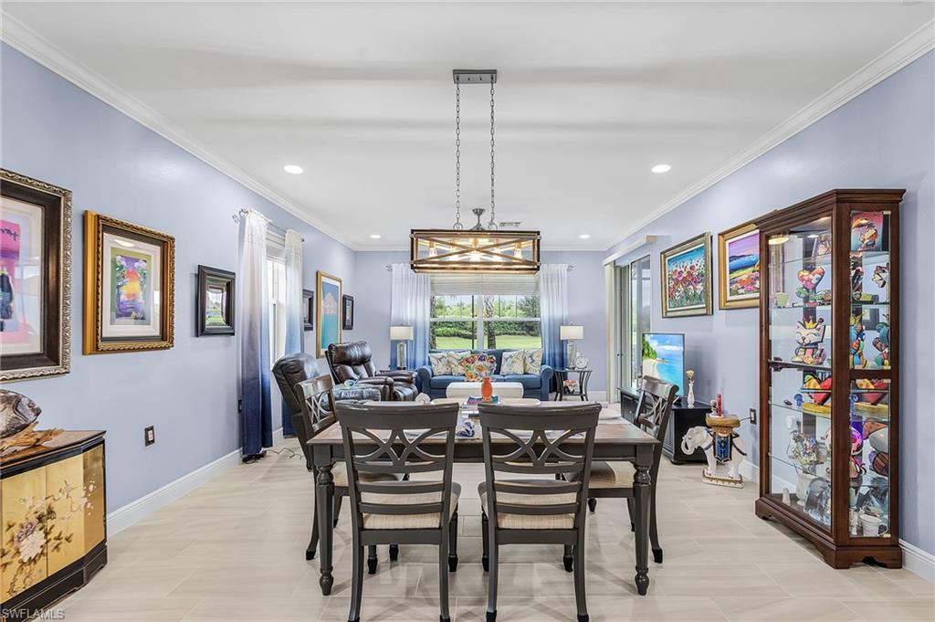 A must see villa with a great backyard setting to enjoy the screened lanai with private pool and additional lighting. There is a screened slider on the lanai that leads to the living room with crown molding and remote Roman Shades. This 3 Bedroom home boasts many upgrades starting with a screened entry with glass insert front door. There are tile floors through the main living area, Luxury Vinyl Plank flooring in the Primary and new carpet (2025) in the guest rooms. The Kitchen has beautiful two tone cabinets with under cabinet lighting, an Island and wine bar with pull out shelves, additional cabinetry in the eating area plus a Keurig coffee maker with a direct line. There are newer LG appliances with transferable coverage (5/2026). Other upgrades: Hurricane Shutters, whole home water purifier and RO (2020), Hot Water Heater (2021), HVAC with UV Light (2024), new pool pump (2024) and all LED lighting. The interior was painted (2024), exterior painted (2025), roof baffles and vents resealed (2024), fresh landscaping (2024) roof cleaned (2025) and tile floors sealed (10/2025) with a 5 year transferable warranty. There is a portable whole home generator (2024) and lanai TV that will convey with the home. This home has it all where you can move right in and start to enjoy your new resort lifestyle. Pelican Preserve is a nationally recognized active adult 55+ community with endless amenities including the Flip Flops outdoor restaurant, 3 pools, Tennis, Pickleball, Bocce, Softball, Fitness, Movie Theater, Billiards, Hobby Rooms, Amphitheater, Destinations indoor restaurant, plus many special events throughout the year. The Brokke Center includes a Library, Card Rooms and Coffee Center for socializing with friends. Pelican Preserve has a 27 hole Private Golf Club with optional memberships. Pelican Preserve is a short drive to RSW Airport and many shops and restaurants and the gulf coast beaches. It's time to call this your next home. Some furniture is available in a separate bill of sale.
