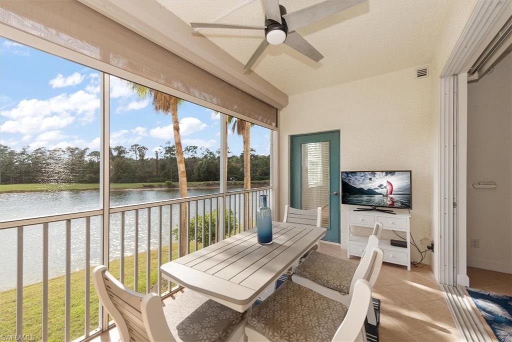 Gorgous 2/2 TURNKEY property in Pelican Preserve, a desirable 55+ active community with loads of social activites and amenities and OPTIONAL GOLF. Custom kitchen with upgraded wood cabinetry, with pull-outs in the lower cabinets, custom pantry, quartz countertops, upgraded stainless appliances AND cafe table nook. There is tile through out (no carpet!) and the unit is nicely furnished with a coastal chic vibe! Master bath has custom cabinets, quartz counters, upgraded tile shower with rim-less shower doors, and huge walk-in closet with California closets. Laundry area has a tankless hot-water heater and additional cabinets. Enjoy the Lake views from the great room, primary bedroom and large screened lanai. Storm-smart drop-downs on lanai. New Impact window in Master bedroom (2025), whole house water filtration (2024) and the unit is equipped with a radon protection system(2025), New AC (2020). Includes a covered carport space. Building has a New roof (2019) and the structural reserve study is completed (2025). Pelican Preserve is an active adult community offering award winning resort style amenities to keep you entertained while you enjoy our phenomenal Florida weather. Golf memberships are available. Tennis, Pickleball, 3 pools, Theater, Staffed fitness center, Spa Services, Billiards, Bocce, Restaurants, Woodworking, Softball and so much more.