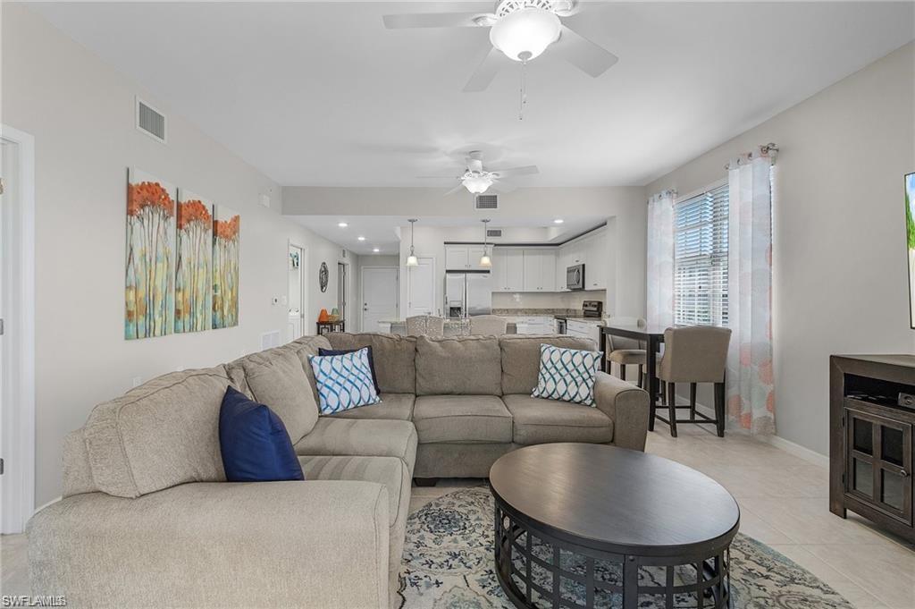 Get Out of the COLD! April Special $4000 per month plus taxes and fees. 2 Bed+ Den Turnkey Rental Available - Quiet Top floor end unit. You don't have to worry about all the noise above you or other residents passing by to the elevators or trash chute. Beautiful end unit overlooking the peaceful preserve from the cornered screened lanai. Turnkey 2 Gorgeous Bedrooms +den 2 Bathroom condo. Everything and more for your relaxing vacation rental you could need or want. Just bring your toothbrush and your bathing suit. Kitchen has stainless steel appliances, marble counter tops and marble breakfast island, and dinette. Bedrooms and den carpeted. Open bright living room with pocket sliders leading onto quiet lanai Large Master Bedroom in back of unit so you wont be disturbed by your guest. Bedroom has preserve view. King bed, tray ceiling, & large walk in closet. Master bathroom has his/her sinks, marble counter tops and large step in corner shower with bench. Guest bedroom and den at front of unit has Queen bed and den includes desk additional TV and sleeper sofa perfect for those who need to work from home while on vacation. Guest bathroom has tub and and marble sink countertop. Washer and dryer in residence. Unit is located next to Palazzo community pool. Additional to Town Center amenities Palazzo Community includes a separate area for Palazzo guests only including a pool with hot tub and Bar B Que. Pelican Preserve offers 70,000 sq ft. Town Center offering 2 outdoor pools, indoor lap pool & walking track, pickleball, tennis, spa, fitness center, 2 restaurants, craft, sewing & woodworking room, billiards room, theater, exercise classes bingo nights, card rooms, outside amphitheater, nature walk with preserve boardwalk, & more. Rentals under 6 months include electric w/cap, cable & internet, tenant to pay 11.5% tax Available April 2026 $4200 per month, May - Nov 2026 $2400 per month plus taxes and fees. December 26 - April 2027 4 month rental $5300 per month, plus taxes and fees. Utilities Included. Leases 6 months plus a day do not require taxes & include utilities.