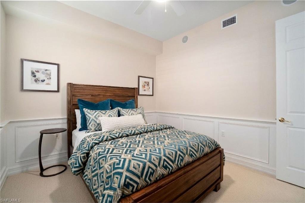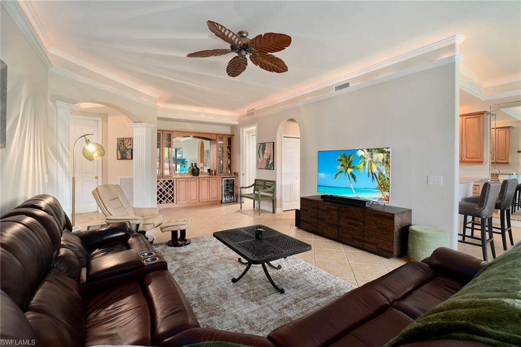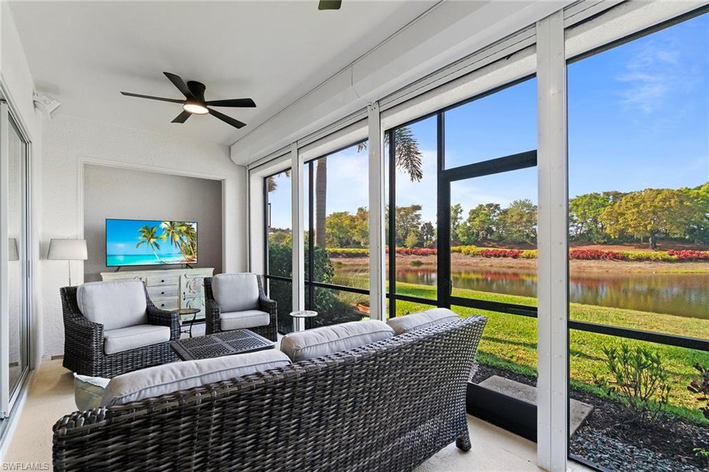 Panoramic golf course and sparkling water views stretch endlessly, with no neighboring houses to interrupt the scene, setting the stage for this remarkable first floor Renaissance residence. Refined interior details elevate the living experience, including tile flooring throughout the main living areas, plush carpeting in the bedrooms, plantation shutters, and crown molding throughout. Tray ceilings with integrated ambient lighting create a warm, inviting atmosphere, while custom wainscoting adds character to the den. The kitchen is both functional and stylish, featuring granite countertops, soft-close cabinetry, a pantry, and an eat-in bar ideal for casual dining or entertaining. A well-appointed wet bar enhances the space, complete with a wine cooler, built-in storage, and a striking mirrored display. A dedicated laundry room with built-in cabinetry and utility sink provides everyday convenience with direct access to the generous two car garage. The primary suite serves as a private retreat, offering tranquil golf course views, abundant natural light, and dual oversized walk-in closets. The spa-inspired bath includes a jetted soaking tub, expansive walk-in shower with multiple shower heads, dual vanities, and generous storage. Outdoor living is equally impressive, with a southwest-facing screened lanai capturing breathtaking panoramic views of the golf course and pond, with no neighboring houses in sight. Electric hurricane shutters provide added peace of mind, while updated exterior fans enhance comfort year-round. Offered turnkey, this residence presents a seamless opportunity to enjoy elevated living in one of the areau2019s most sought-after golf course communities. Incredible value. Residents of Renaissance enjoy access to a championship 18-hole Arthur Hillsu2013designed golf course, and a clubhouse with fine and casual dining. Additional amenities include tennis, pickleball and bocce courts, a resort-style pool, a full-service spa and fitness center, steam rooms, a library, playground and a vibrant calendar of social eventsu2014all just minutes from RSW Airport, Gulf beaches, shopping and dining. Move-in ready and masterfully updated, this tech-enhanced sanctuary offers privacy, luxury and peace of mind in one of Southwest Floridau2019s sought-after communities.