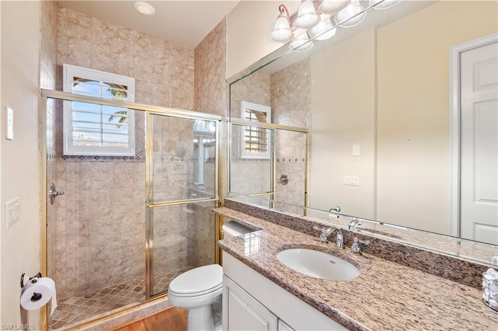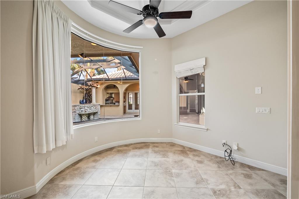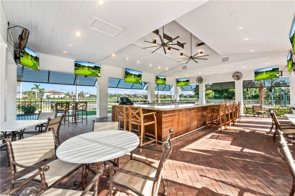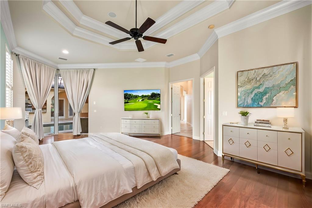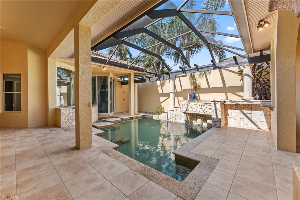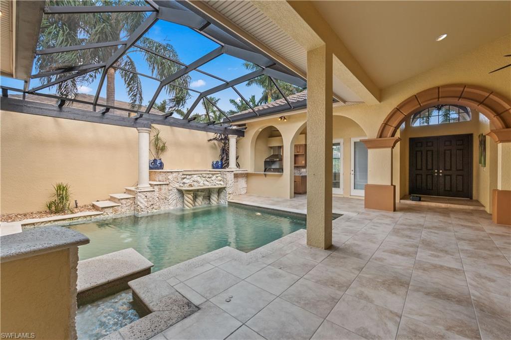 Unparalleled luxury and privacy await in the stunning residence nestled on the 17th hole with spectacular lake views in the exclusive Monteverdi at Renaissance community. Enjoy captivating lake and sunset views from multiple outdoor screened lanais while the private courtyard retreat serves as your personal oasis, complete with a custom pool, spa, cascading waterfalls, and a fully equipped outdoor kitchen perfect for entertaining. Inside, the home boasts high-end finishes throughout, including Brazilian mahogany engineered wood floors, double crown molding, and plantation shutters adorning every window. The expansive living spaces are accentuated by soaring ceilings, tray ceiling accents, and large bay and clerestory windows that fill the home with natural light. For seamless indoor-outdoor living, 9.5-foot pocketing sliders open to reveal two screened lanais, along with automated roll-down shades that offer 94% UV protection. The spacious gourmet kitchen is a culinary delight, equipped with a gas cooktop, convection oven, large island, a bar, and custom cabinetry. A home office provides a quiet workspace, while the gas fireplace adds warmth and charm to the main living area. Each bedroom features its own ensuite bath, while the luxurious primary suite pampers with a jetted Jacuzzi tub, dual walk-in shower heads, a makeup vanity, and custom walk-in closets. Recent updates add modern comfort, including a Halo air purifier system with UV lights on the A/C, two newer A/C units (one just 2 years old, the other 3), and a 2022 pool pump and pool heater added in the past 5 years. The whole-house surround sound with ceiling speakers further enhances the ambiance. Renaissance is a low-density golf and country club community known for its award-winning course, unrivaled tee-time availability, and an abundance of luxurious amenities. The grand clubhouse offers fine dining, tennis, fitness, and social activities, while the communityu2019s ideal location provides quick access to I-75 and is just minutes from Southwest Florida International Airport. Experience refined living in a golferu2019s paradise, where every detail has been thoughtfully designed for comfort, elegance, and style.
