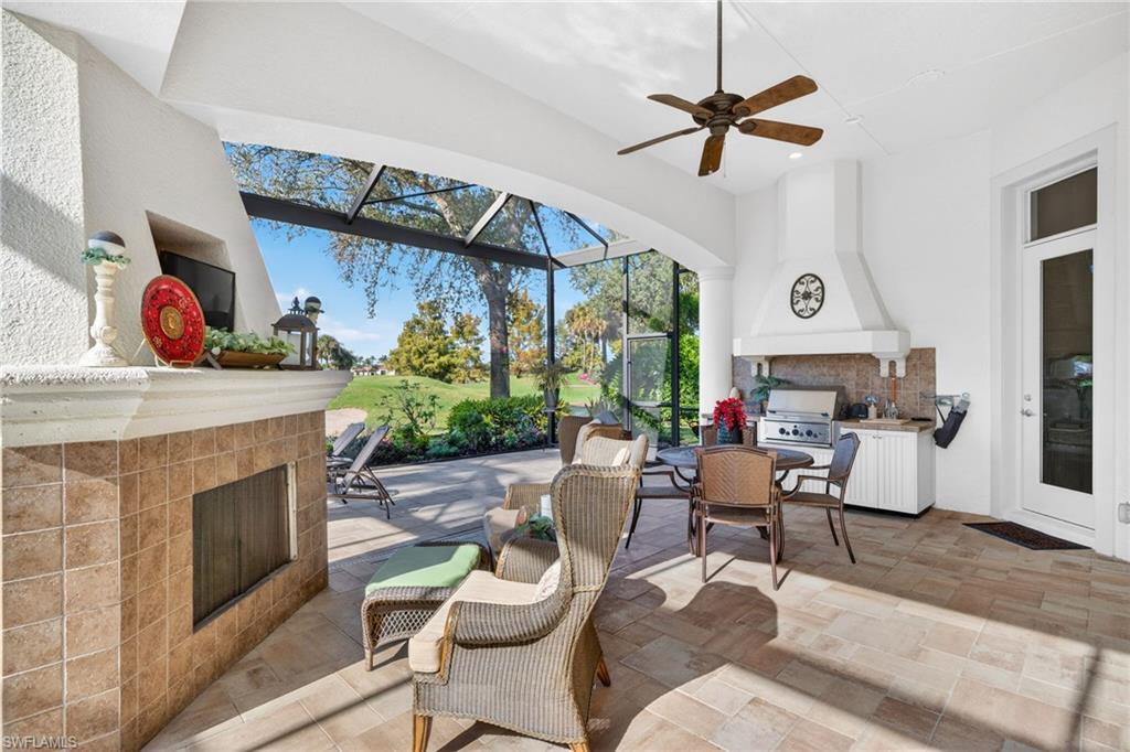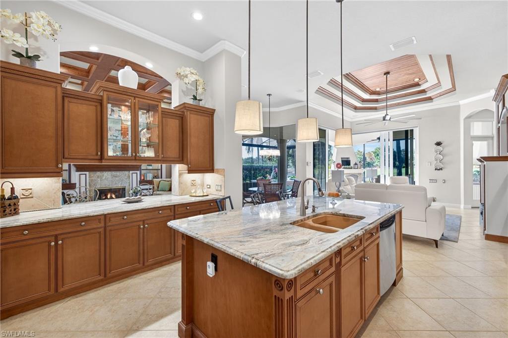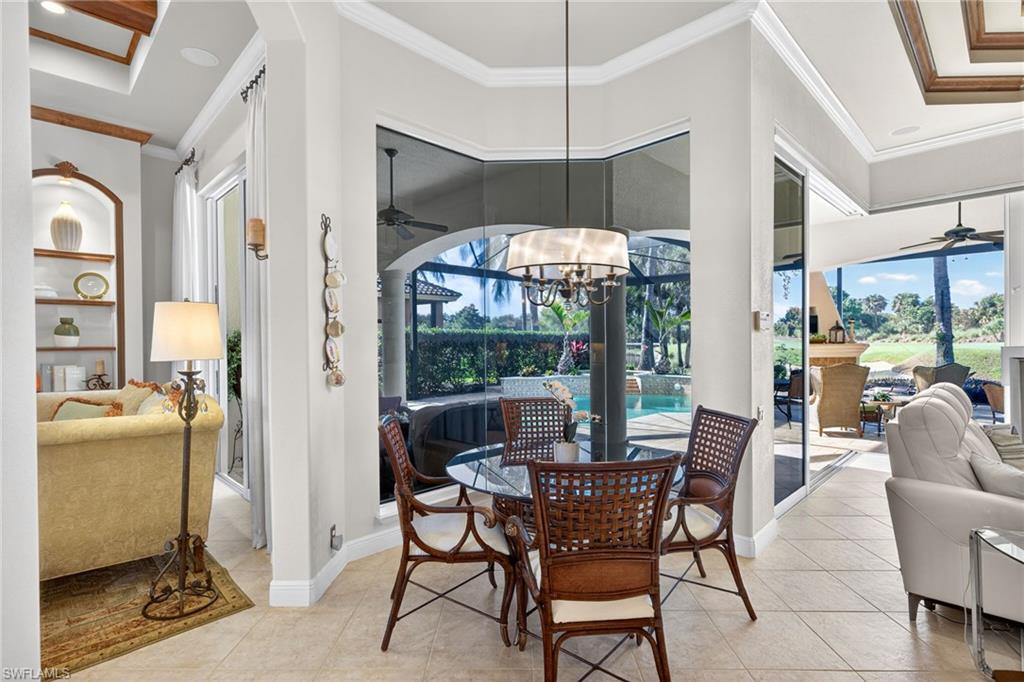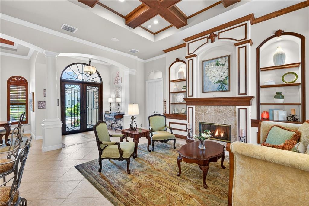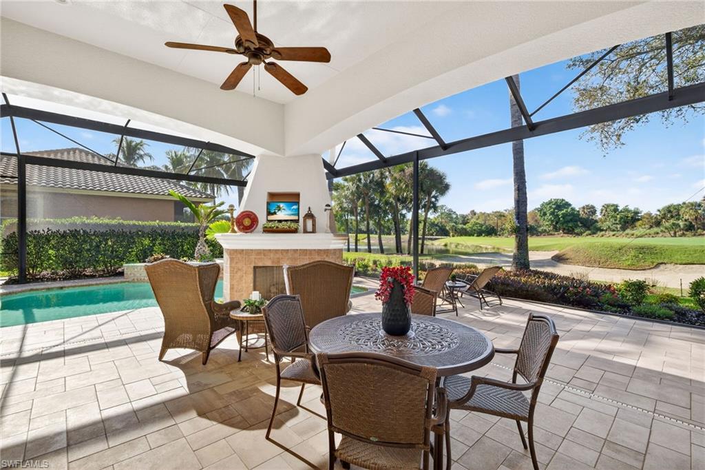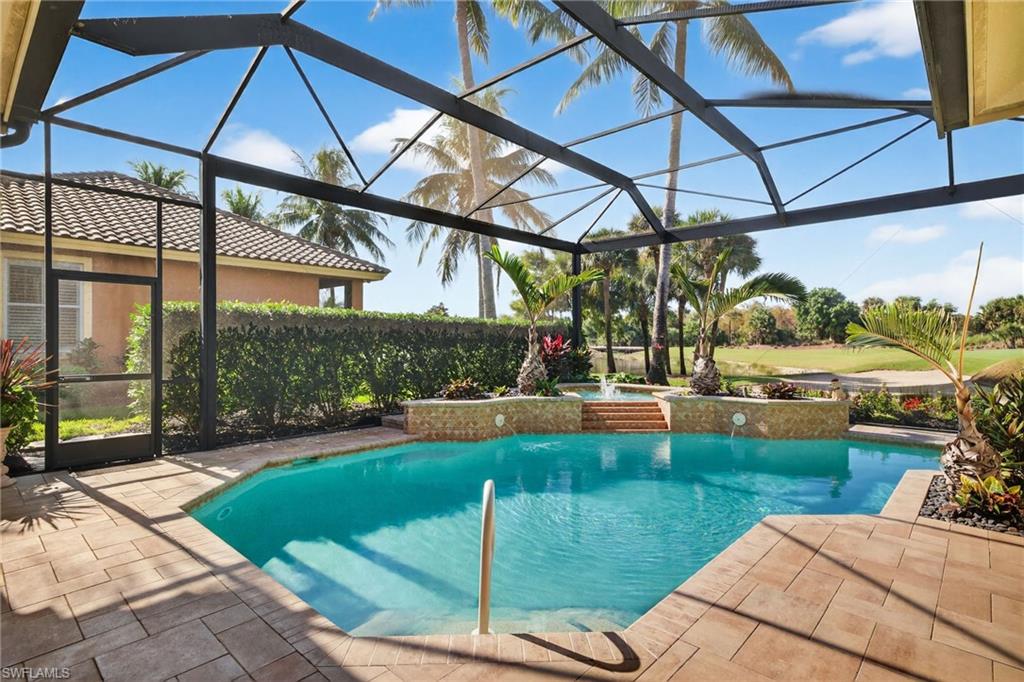 Arthur Rutenberg custom luxury pool and spa home, featuring 3 bedrooms plus a den, ideally positioned along The Renaissanceu2019s most scenic 17th signature hole of the Arthur Hills championship golf course. With a northwestern exposure, this residence captures breathtaking sunset views across a tranquil pond and striking fountain backdrop.Refined craftsmanship is apparent, highlighted by wood coffered ceilings, a grand arched entry with decorative inlay tile, multiple tray ceilings, architectural columns, and crown molding throughout. The private den is accented by real hardwood flooring and offers a flexible space for a home office or study.The kitchen is both striking and functional, featuring thick quartzite countertops, custom cabinetry, stainless steel appliances, and a breakfast nook with panoramic glass, creating an exceptional space for everyday living. The kitchen flows seamlessly into the great room, where 10-foot impact-resistant multi-panel sliding doors open directly to the lanai, blending indoor and outdoor living.Outdoor living is a defining feature of the home. The lanai is anchored by a PebbleTec saltwater pool and spa with lifetime warranty, enhanced by new gas and electric heaters, a new pump and motor, automatic water refill system, and upgraded pavers. A picture-window pool enclosure preserves uninterrupted views of the fairway, pond, and fountain, while the outdoor grill, outdoor fireplace, and decorative lighting create a private, resort-style setting with sun exposure from approximately 10 AM to sunset.The primary suite serves as a private retreat, offering laminate wood flooring, a tray ceiling with ambient lighting, serene views of the pool and golf course, and direct access to the lanai. The spa-inspired primary bath features dual vanities with Italian marble countertops, a walk-in glass-enclosed shower with full tile surround, custom built-in shelving and a soaking tub framed by architectural columns and graceful archways.Functionality complements the homeu2019s elegance. The side-entry three-car garage offers epoxy-coated flooring, additional attic storage, and ample space for vehicles and golf carts. Interior upgrades include dual newer A/C systems, a durable concrete tile roof (2020), California Closets, updated lighting, fresh interior and exterior paint, and a whole-home and outdoor sound system.The setting offers rare privacy, with no homes behindu2014only golf course and water views framed by mature landscaping, royal palms, coconut palms, and ambient exterior lighting.As a resident of The Renaissance, enjoy an Arthur Hills championship golf course with golf memberships available immediately, along with a resort-style pool and pavilion, full-service spa and fitness center, six red clay tennis courts, two pickleball courts, two bocce courts, and a playground. Schedule your private showing and experience this exceptional home firsthand.