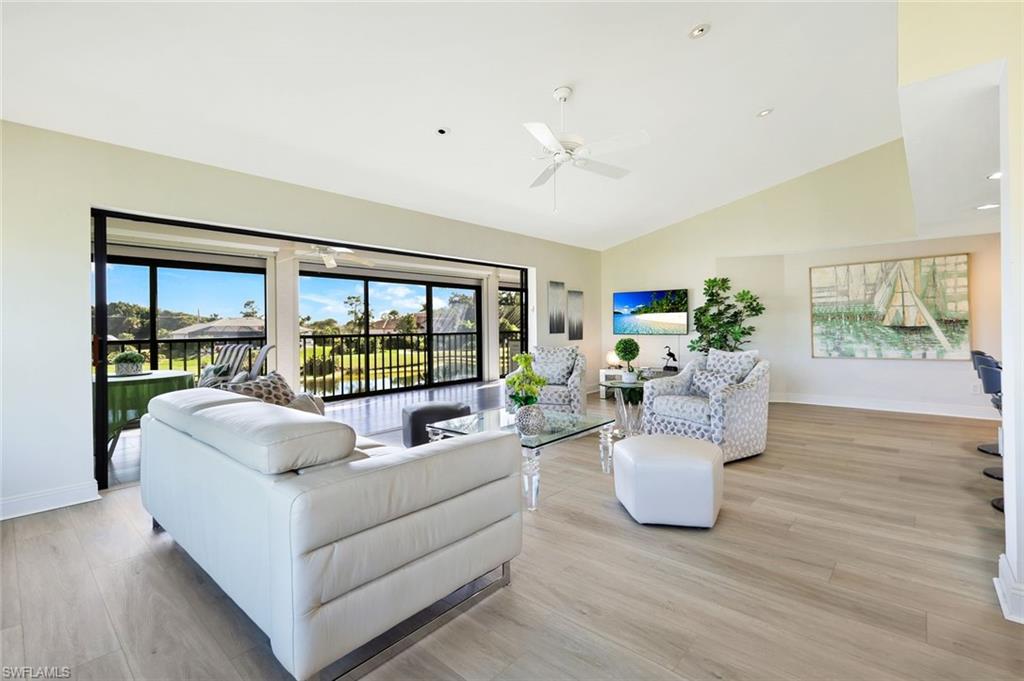 Experience this contemporary second-floor condominium featuring an inviting great room plan with eastern rear exposure and exceptional views of water, the golf course, and tropical landscapes. This fully furnished turnkey residence offers two bedrooms, two bathrooms, and a single-car garage. Dining Room Could Easily Be Converted to a 3RD Bedroom or Den. Overlooking the Bobcat Championship Golf Course holes #2 and #3, the condo offers raised ceilings, newly installed 7` baseboards, custom moldings, new furnishings, custom mirrors, upgraded doors, fresh interior paint, luxury vinyl or porcelain tile flooring (no carpet), and impact-resistant front door and windows. The enclosed four-season lanai is equipped with Storm Smart fabric electric shutters and removable vinyl windows. Easy Extra Year Round Living Space. The remodeled kitchen includes a spacious open island for gatherings, stainless steel appliances, soft-close white shaker cabinetry with pull-outs, custom window treatments, and silhouette blinds. Additional features comprise a well-maintained air conditioning system, Square D electrical panel, new shingle roof, extra built-in storage, and recent paint. This residence did not incur any water intrusion from Hurricane Ian.Membership to the Country Club is optional, 2026 incentive discounts are currently available for new residents. The property is conveniently located just 15 minutes from RSW Airport, within biking distance to Lakes Park's Market Day, and surrounded by over 8 miles of sidewalks, streetlights, more than 20 lakes, and abundant wildlife. Beaches such as Sanibel and Fort Myers Beach are only 20 minutes away. Some amenities described may require membership. There is also a children's park available. Discover the lifestyle offered in The Forest community.