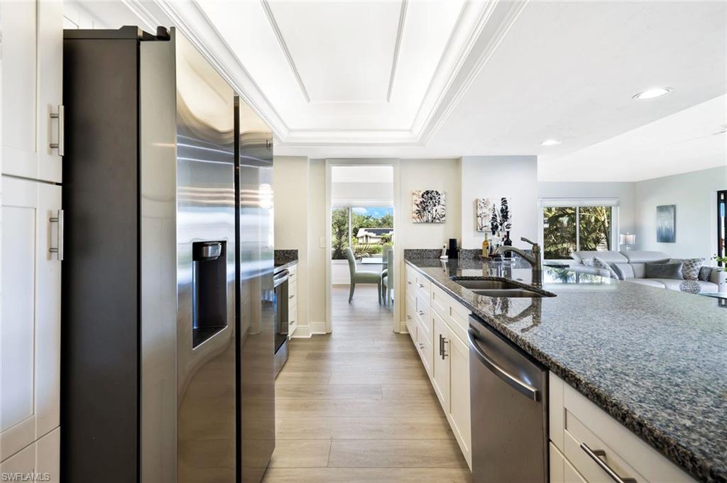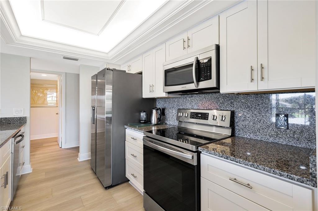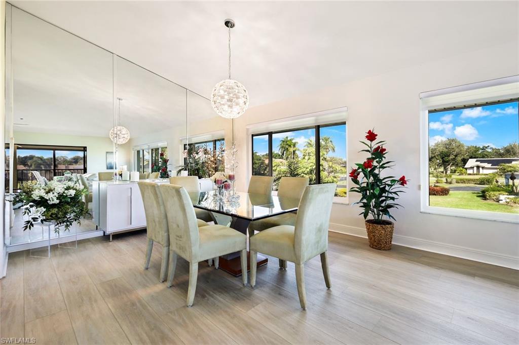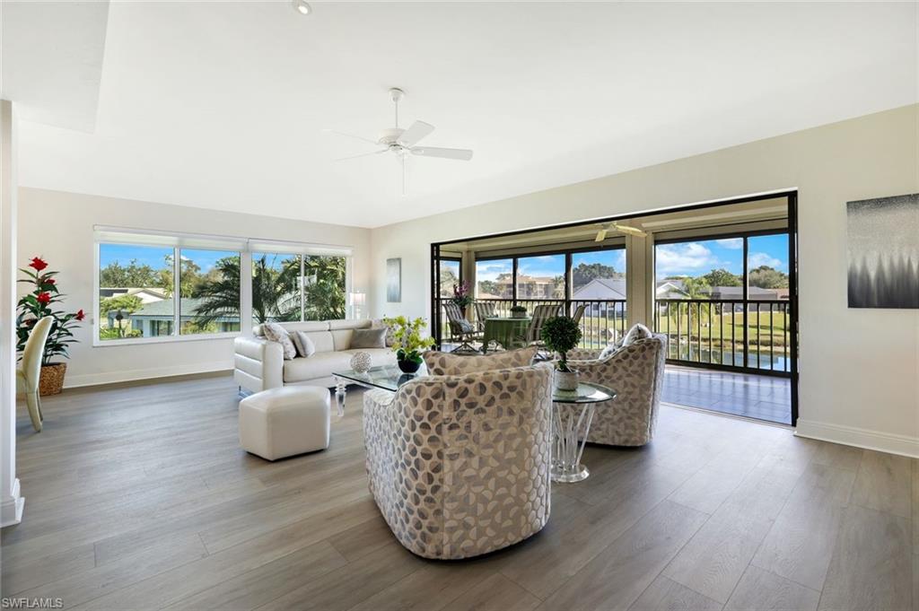 Experience this contemporary second-floor condominium featuring an inviting great room plan with eastern rear exposure and exceptional views of water, the golf course, and tropical landscapes. This fully furnished turnkey residence offers two bedrooms, two bathrooms, and a single-car garage. Overlooking the Bobcat Championship Golf Course holes #2 and #3, the condo offers raised ceilings, newly installed 7` baseboards, custom moldings, new furnishings, custom mirrors, upgraded doors, fresh interior paint, luxury vinyl or porcelain tile flooring (no carpet), and impact-resistant front door and windows. The enclosed four-season lanai is equipped with Storm Smart fabric electric shutters and removable vinyl windows.The remodeled kitchen includes a spacious open island for gatherings, stainless steel appliances, soft-close white shaker cabinetry with pull-outs, custom window treatments, and silhouette blinds. Additional features comprise a well-maintained air conditioning system, Square D electrical panel, new shingle roof, extra built-in storage, and recent paint. This residence did not incur any water intrusion from Hurricane Ian.Membership to the Country Club is optional, 2026 incentive discounts are currently available for new residents. The property is conveniently located just 15 minutes from RSW Airport, within biking distance to Lakes Park's Market Day, and surrounded by over 8 miles of sidewalks, streetlights, more than 20 lakes, and abundant wildlife. Beaches such as Sanibel and Fort Myers Beach are only 20 minutes away. Some amenities described may require membership. There is also a children's park available. Discover the lifestyle offered in The Forest community.