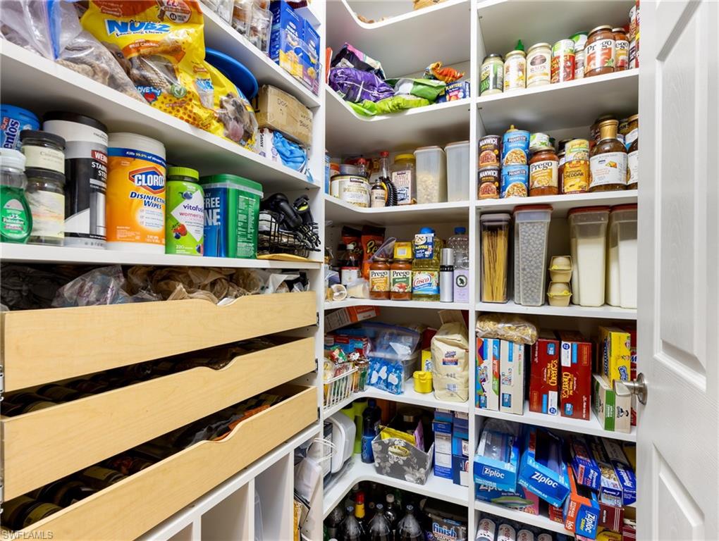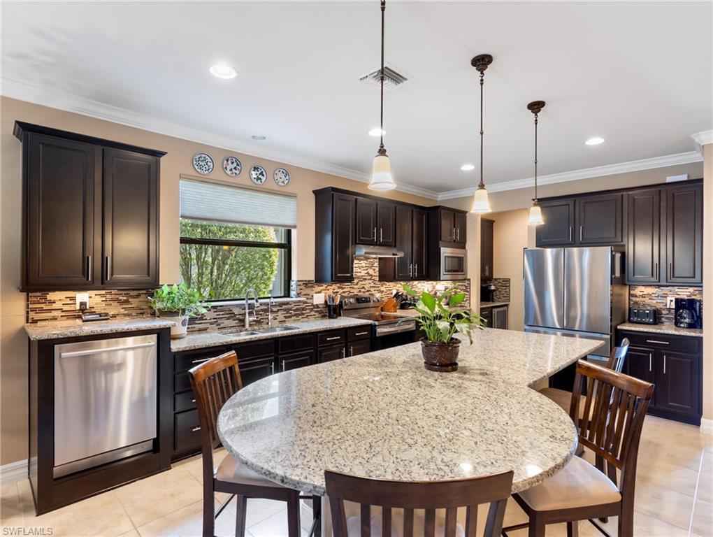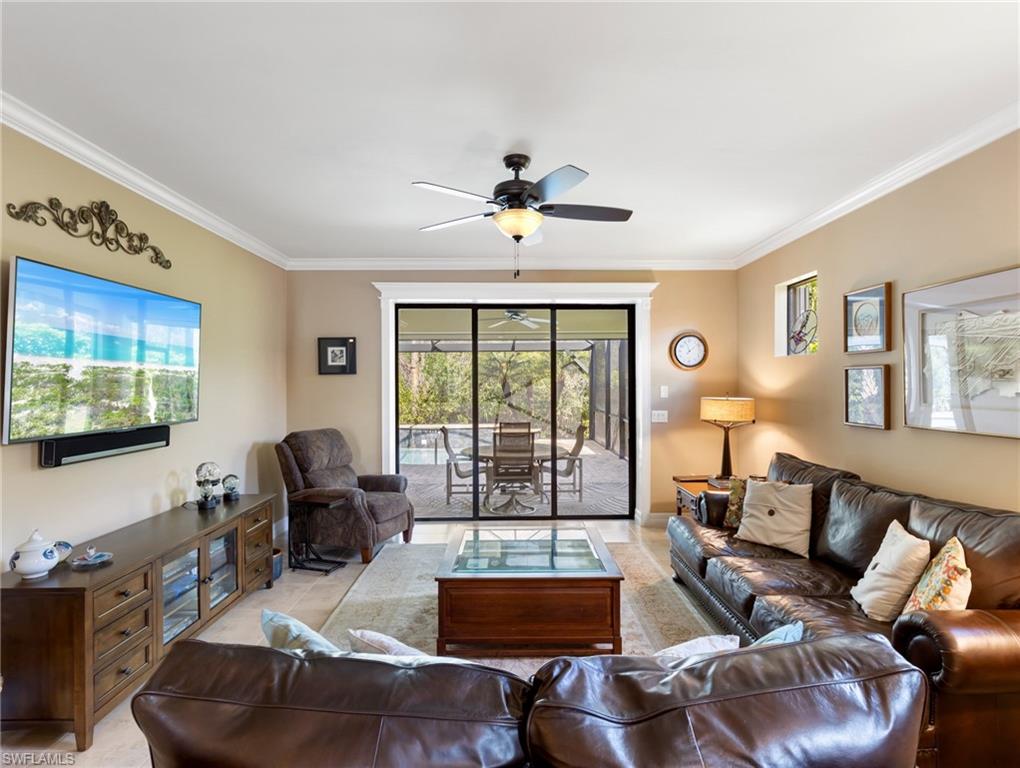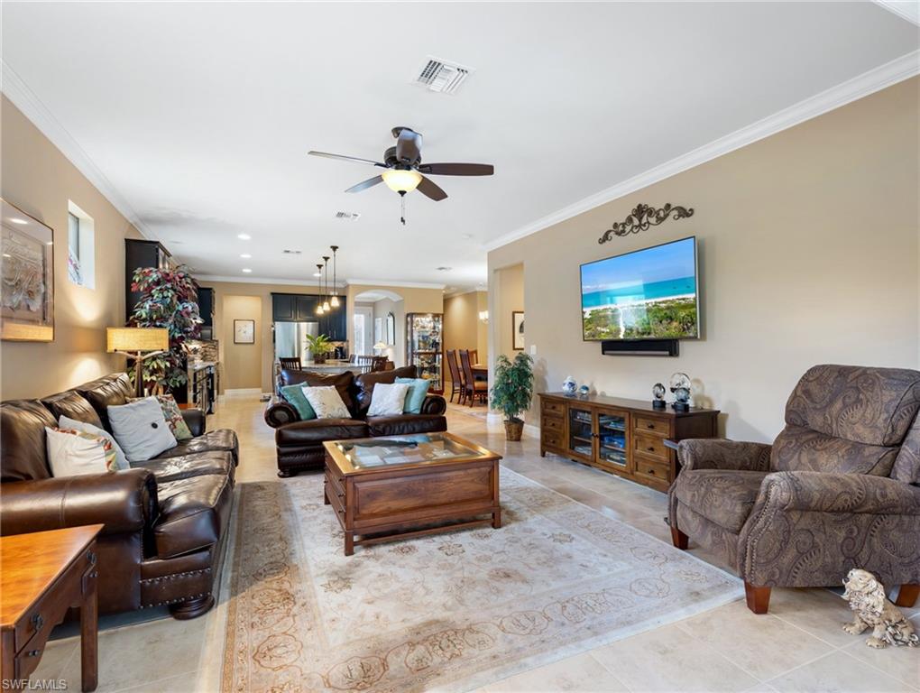This two-bedroom plus den saltwater pool home in Bridgetown at The Plantation offers over 1,900 square feet of living space with volume ceilings and designer finishes throughout. Upon entry through the hurricane glass led inlet door, tile and luxury vinyl flooring set an elegant atmosphere complemented by earth-tone paint and abundant natural light. Crown molding and tray ceilings add to the refined ambiance. The kitchen serves as a central gathering area, featuring a large granite island, designer pendant lighting, a stylish backsplash, and new appliances installed in 2023u2014including an LG French Door refrigerator, LG convection oven, and top of the line Bosch dishwasher. All cabinetry is equipped with built-in pullouts for optimal storage. Adjacent to the kitchen is a private coffee bar with pullout drawers, additional cabinetry, professional Marvel beverage refrigerator with drawer, and a walk-in pantry fitted with custom shelving and pullouts.The main living area is spacious and bright due to extra windows and includes a 65 inch Sony Bravia TV with Sonos soundbar for enhanced entertainment. Bedrooms are split for privacy, with the primary suite overlooking the pool and offering a large walk-in shower, built in 55 inch LG TV, and a closet with custom built-ins. Outdoor amenities include lush landscaping, a private preserve, a custom saltwater pool with water feature, a new 55 inch TV with full motion mount to watch while in the pool, and a picture screen lanai cage providing unobstructed views. The garage features plenty of room for a golf cart or additional storage, floor mats for protection, and a remote controlled screened door for maximum airflow and privacy. It houses the whole-house Kinetico water system and a hot water tank installed in 2024. The 18 SEER, quiet Rheem HVAC system with Smart thermostat, also newly installed in 2024, includes an air purifier to keep electric bills low. Comprehensive hurricane protection is provided with accordion shutters and remote controlled Electrical Shutters. Bridgetownu2019s low HOA includesComcast upgraded cable package and high speed internet. Just minutes away by golf cart or car, the amenity center offers a host of recreational activities: tennis, pickleball, bocce ball, fitness classes, gym workouts, lap swimming, or simply lounging by the pool. This residence offers a perfect blend of luxury, comfort, and resort-style livingu2014welcome home!