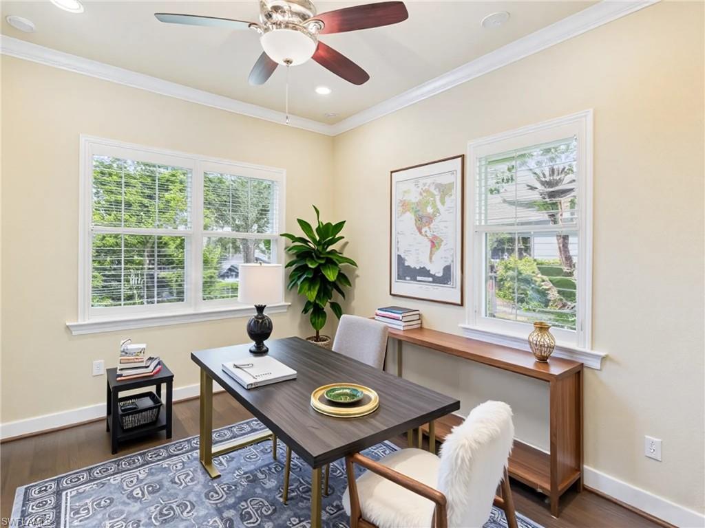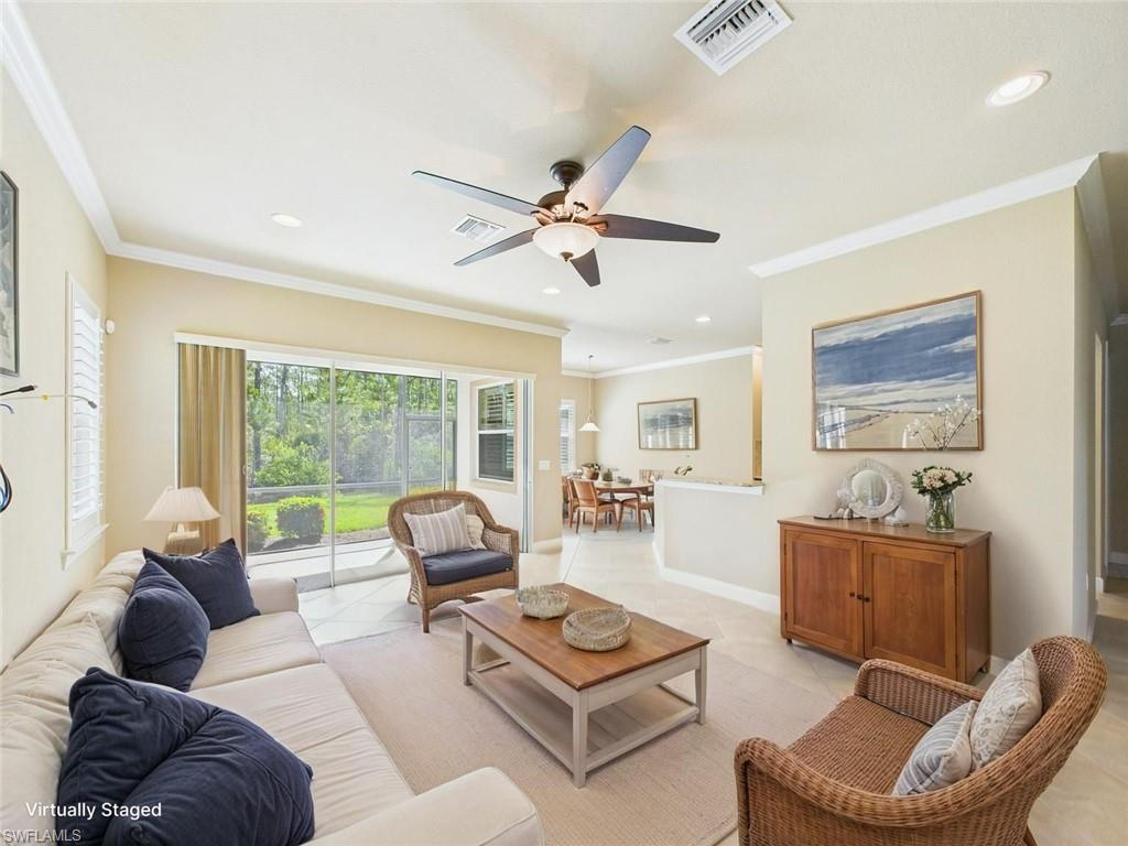 Live with ease and elegance in this beautifully upgraded 2-bedroom + den villa located in the highly sought-after Bridgetown community in Fort Myers. This low-maintenance, attached villa welcomes you with crown molding throughout and extended-height doorways that enhance its open, upscale feel.The kitchen offers granite countertops and a reverse osmosis system for purified water right at the sink. The spacious primary suite features a walk-in closet with custom cabinetry and a granite-adorned bath with an upgraded shower door. You'll also enjoy thoughtful details like custom cabinetry in the garage and a well-maintained termite protection system from the time of construction.Step outside and take advantage of Bridgetownu2019s resort-style amenities, including a resort pool, fitness center, tennis and pickleball courts, and a clubhouse perfect for social gatherings.Conveniently located just minutes from Gulf Coast Town Center, Miromar Outlets, and RSW International Airport, youu2019ll enjoy effortless access to shopping, dining, and travel. Whether you're looking for a year-round residence or seasonal retreat, this villa offers the perfect blend of comfort, style, and convenience.
