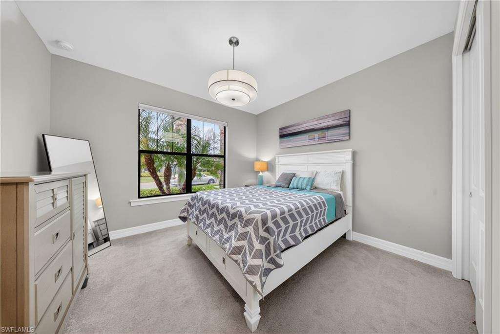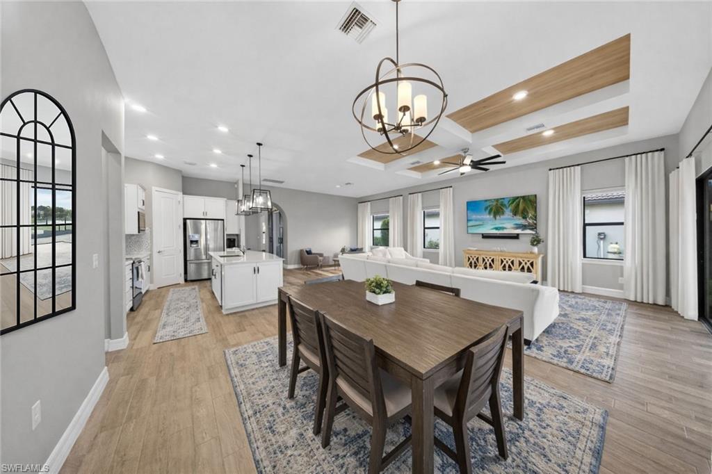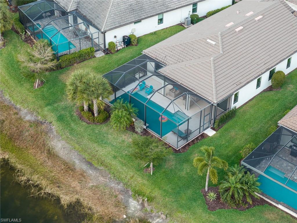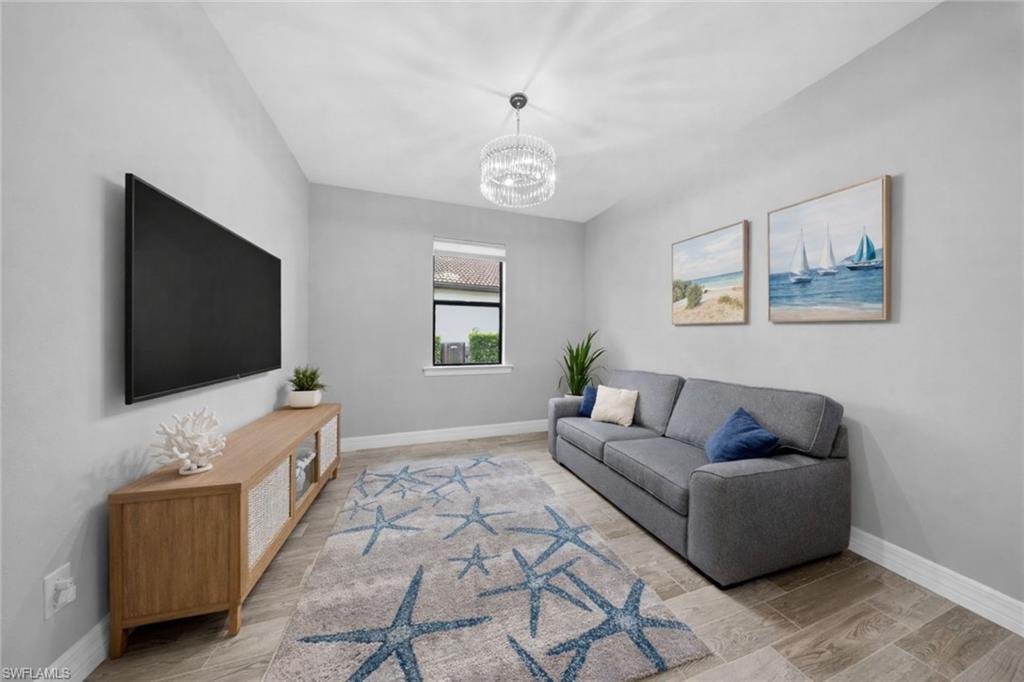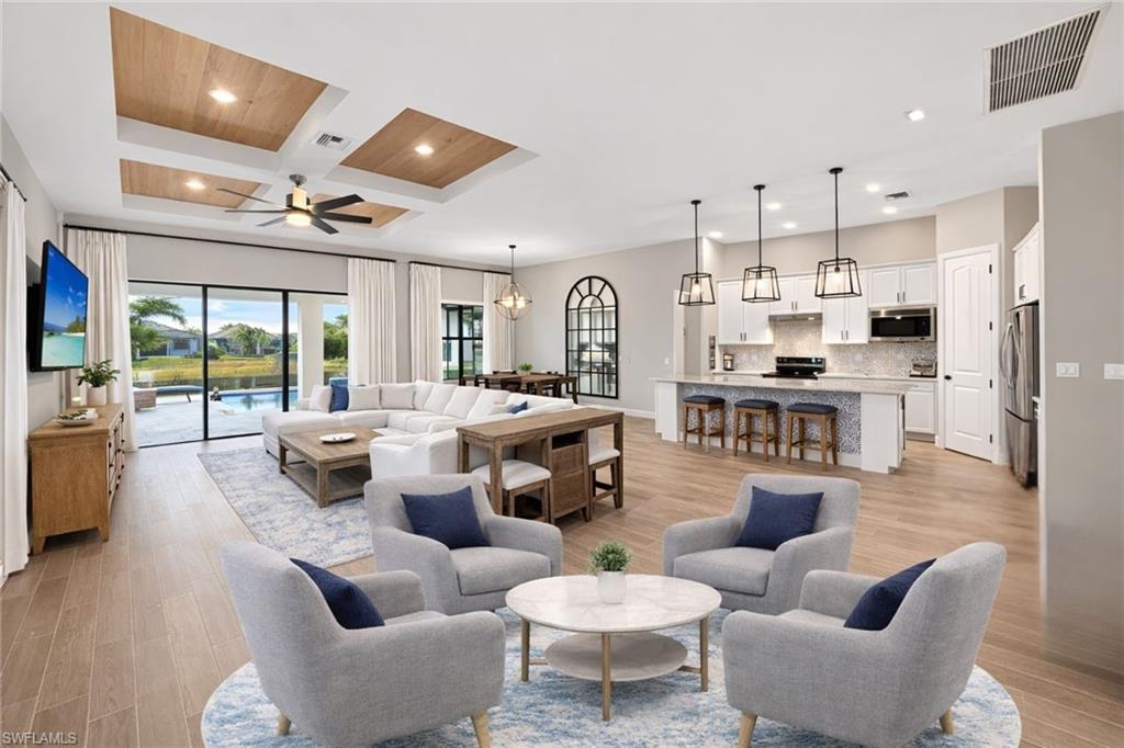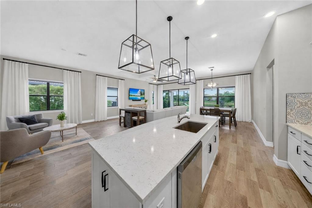 WESTERN LAKEFRONT SUNSETS, a CUSTOM SALTWATER POOL, and an EXTENDED SUMMERWOOD FLOOR PLAN with 11-FOOT CEILINGS and MODERN COASTAL FINISHES u2014 this home truly SHOWS LIKE A BRAND-NEW MODEL.Perfectly positioned on a PREMIUM LAKEVIEW HOMESITE in Bridgetown at The Plantation, this beautifully maintained residence offers 3 BEDROOMS + DEN, 2 FULL BATHS, & 2,177 SQFT OF OPEN SINGLE-STORY LIVING designed for both comfort and entertaining.A MODERN GLASS ENTRY DOOR welcomes you inside where natural light fills the foyer and SOARING 11-FOOT CEILINGS create an immediate sense of space. The main living areas and den feature WOOD-LOOK PLANK TILE FLOORING, while 8-FOOT INTERIOR DOORS WITH UPGRADED COASTAL TRIM elevate the homeu2019s clean, modern aesthetic. The EXTENDED GREAT ROOM provides additional living space beyond the standard model and is highlighted by a COFFERED CEILING WITH CUSTOM WOOD SHIPLAP DETAIL.The kitchen is designed for everyday living and entertaining, centered around a LARGE QUARTZ ISLAND WITH BUILT-IN CABINETRY. WHITE CABINETRY WITH MODERN BLACK HARDWARE, a STYLISH BACKSPLASH, and STAINLESS STEEL APPLIANCES including a BUILT-IN MICROWAVE and ELECTRIC COOKTOP WITH HOOD VENT complete the space. Additional highlights include a SINGLE-BASIN BLANCO SINK and STEP-IN CORNER PANTRY.The spacious PRIMARY SUITE features a TRAY CEILING, WATER VIEWS, and room for a king-size bedroom set. The ENSUITE BATH includes QUARTZ COUNTERS, DUAL SINKS, FRAMELESS GLASS WALK-IN SHOWER, and a LARGE WALK-IN CLOSET. Two guest bedrooms share a nearby bath with QUARTZ COUNTERS and a TUB-SHOWER COMBO.The DEN WITH SLIDING BARN DOORS offers a flexible space ideal for a HOME OFFICE, MEDIA ROOM, OR FLEX SPACE.Outdoor living is what draws people to Southwest Florida and this home delivers! The EXTENDED LANAI WITH TRAVERTINE PAVERS overlooks the lake and showcases a CUSTOM SALTWATER POOL WITH SUNSHELF & BUBBLERS plus a RAISED FEATURE WALL WITH WATER FOUNTAINS u2014 the perfect setting for relaxing evenings and unforgettable sunset views. The lanai is also equipped with STORM SMART HURRICANE SCREENS that close with the push of a button.Additional highlights include a LAUNDRY ROOM WITH WASHER & DRYER plus a BUILT-IN BEVERAGE BAR WITH GRANITE COUNTERS, SHELVING, & BEVERAGE COOLER, as well as a 2-CAR GARAGE WITH EPOXY FLOORING.Located in FLOOD ZONE X (LOWEST FLOOD RISK u2014 FLOOD INSURANCE NOT REQUIRED), this home is part of the highly desirable Bridgetown at the Plantation community known for RESORT-STYLE AMENITIES including a RESORT POOL & SPA, LAP POOL, FITNESS CENTER, CLUBHOUSE, TENNIS, PICKLEBALL, BOCCE, WALKING PATHS, & A POOLSIDE TIKI BAR. OPTIONAL MEMBERSHIPS are available at the nearby PLANTATION GOLF & COUNTRY CLUB.Ideally located just minutes from RSW International Airport, Gulf Coast Town Center, Costco, Target, and JetBlue Park u2014 with easy access to dining, shopping, and entertainment u2014 and only 30u201340 MINUTES TO SOUTHWEST FLORIDAu2019S BEAUTIFUL GULF BEACHES.