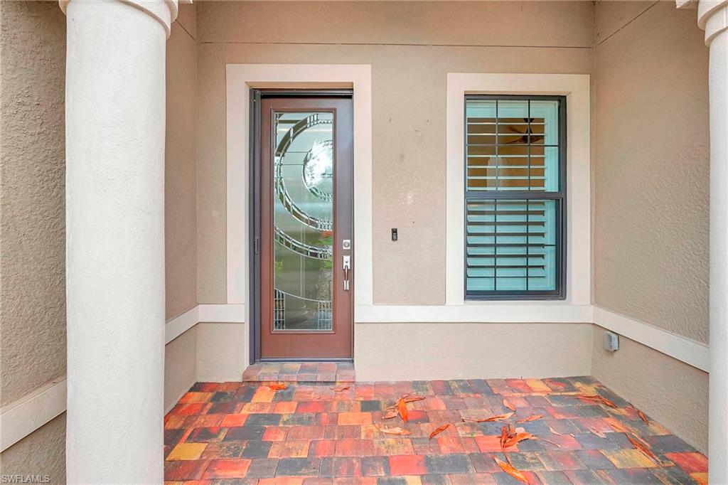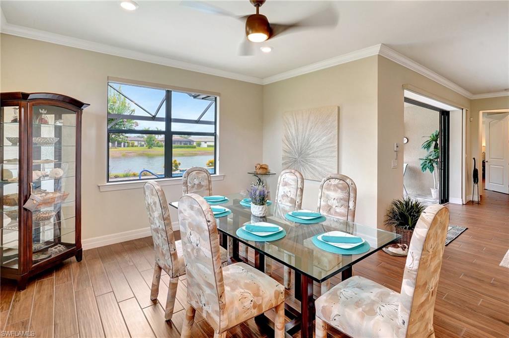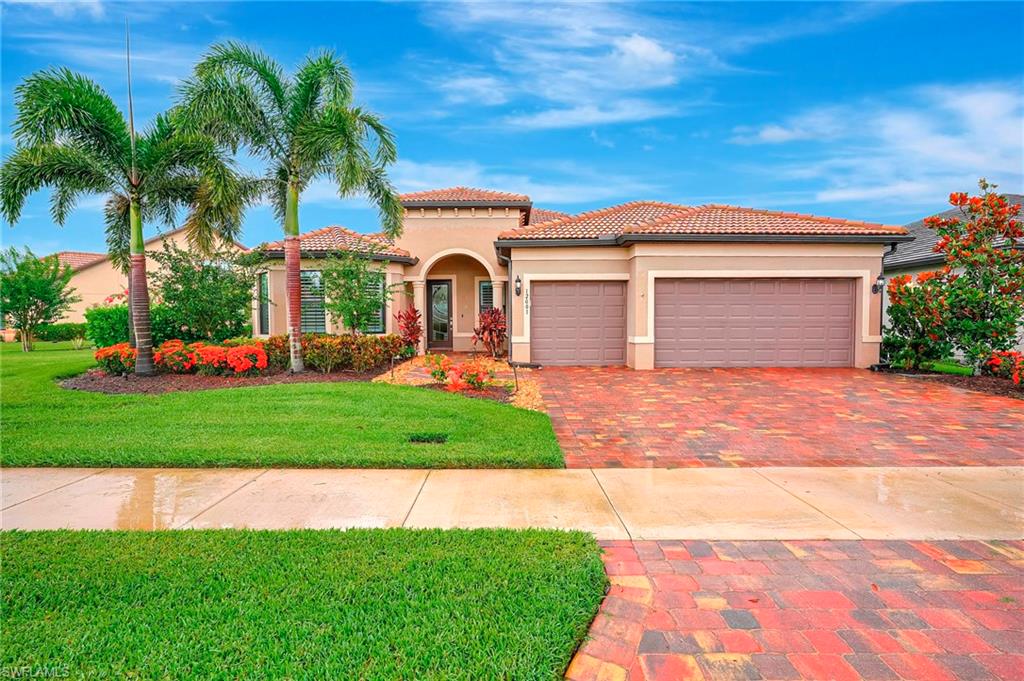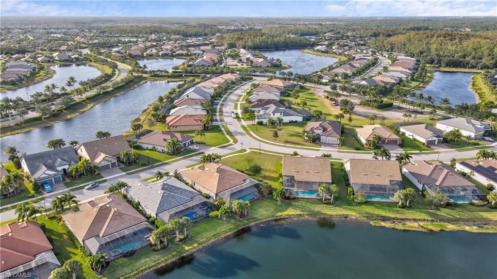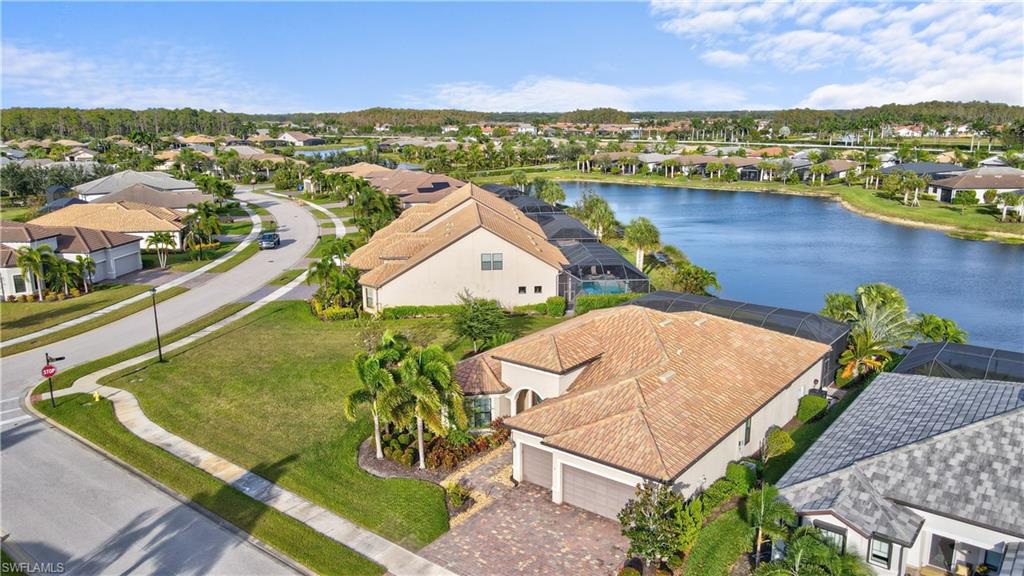 Ideal for multigenerational living or seasonal retreat, this elegant waterfront Pinnacle floor plan offers space, privacy, and resort-style comfort with three spacious bedrooms (including two en-suites), three full baths, a versatile den, and an extended three-car garage. The open-concept design features floor-to-ceiling pocket sliders that open to a private lanai with a custom heated pool and oversized spau2014perfect for relaxing or entertaining across generations. The gourmet kitchen boasts granite countertops, 42-inch off white cabinetry, a designer tile backsplash, premium stainless-steel appliances with wall ovens, a walk-in pantry, and a beverage bar with fridge. The luxurious primary suite includes a sitting area, spa-style bath with dual vanities and walk-in shower, and a custom-built closet. Additional upgrades include impact-resistant windows and sliders, electric roll-down Kevlar hurricane screens, a picture-frame lanai screen, coffered ceilings, crown molding, plantation shutters, and sleek plank tile flooring. Located in a vibrant, amenity-rich community with tennis, pickleball, bocce, a state-of-the-art gym, and a resort-style pool and spa, the HOA also covers cable, internet, lawn care, and exterior pest control. Conveniently located near I-75, RSW Airport, upscale shopping, fine dining, and Gulf beaches, this partially furnished home offers the perfect blend of luxury, flexibility, and Florida lifestyleu2014ready to welcome you home