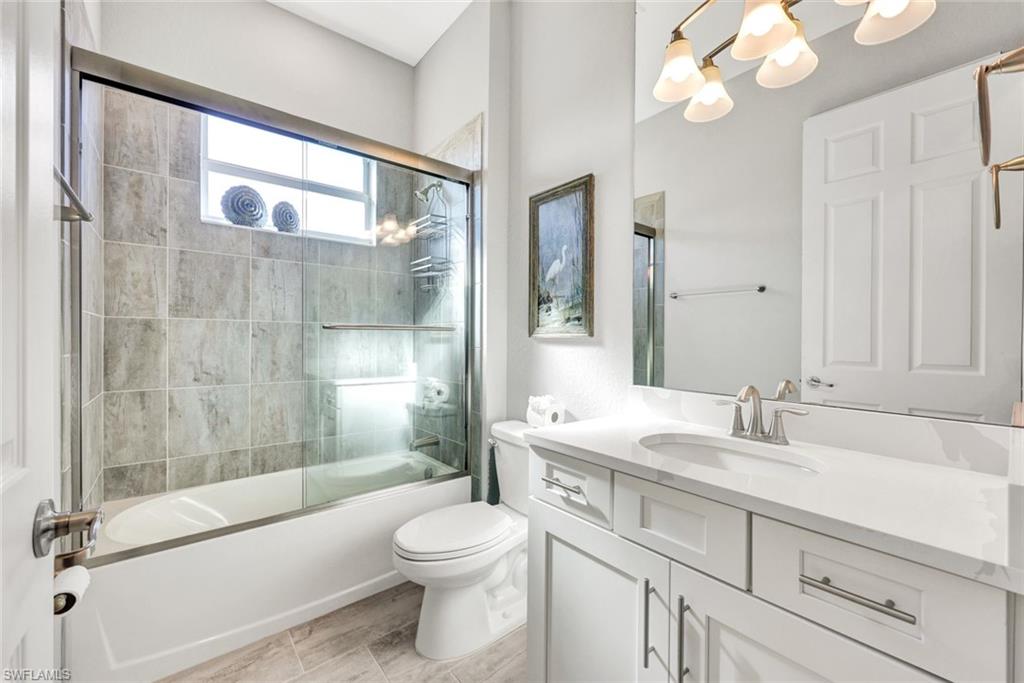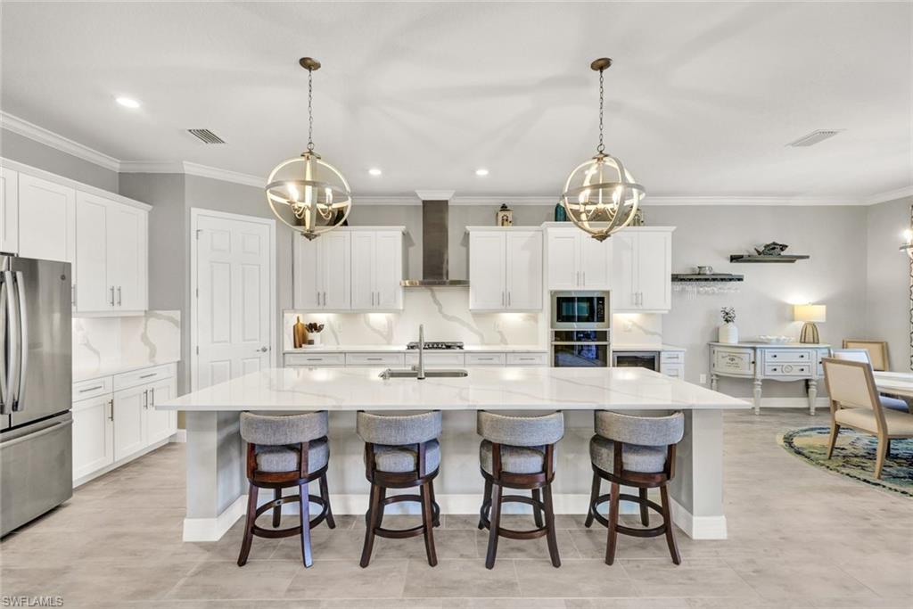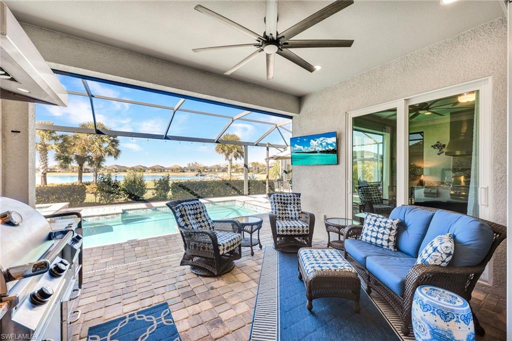 Welcome to exceptional waterfront living on an oversized pie-shaped homesite with a composite dock already in placeu2014perfect for embracing the Southwest Florida lifestyle. This beautifully designed Summerville floor plan offers 3 bedrooms plus a den and 3 full baths with a desirable open-concept layout and split bedroom design for both comfort and privacy.The spacious primary suite features two walk-in closets and a spa-inspired bath with dual vanities, a soaking tub, and a separate walk-in shower. At the heart of the home, the entertaineru2019s kitchen showcases an expansive quartz island with seating for four, GE Profile appliances, a dishwasher replaced in 2025, an additional beverage refrigerator, and elegant under- and over-cabinet lighting.The home is equipped with dimming light controls and motion sensors for ambiance and convenience. In addition the home includes three TV's. Step outside to a spectacular screened lanai enhanced with a panoramic ClearView screen, allowing uninterrupted lake views. The outdoor living space is complete with a full outdoor kitchen, custom lanai lighting, and a solar hybrid heated pool and spa with a newly replaced pool pumpu2014creating the perfect setting for both relaxation and entertaining.The air-conditioned 3-car garage provides comfort and versatility, while a regularly maintained Generac generator offers added peace of mind. For added enjoyment, the home includes a two-person kayak with paddles, and there is an option to purchase a four-person golf cart.Located within the highly sought-after community of WildBlue, residents enjoy a resort-style lifestyle with pickleball, bocce, tennis, and extensive water sports including kayaking, fishing, boating, and wakeboarding. The impressive clubhouse offers two restaurants with elegant indoor dining and a lively outdoor poolside bar featuring regular entertainment. A state-of-the-art fitness center, lap pool, and a full schedule of fitness and water classes complete the amenity experience.This home is the perfect blend of waterfront serenity, thoughtful upgrades, and luxury community livingu2014WildBlue truly has it all.