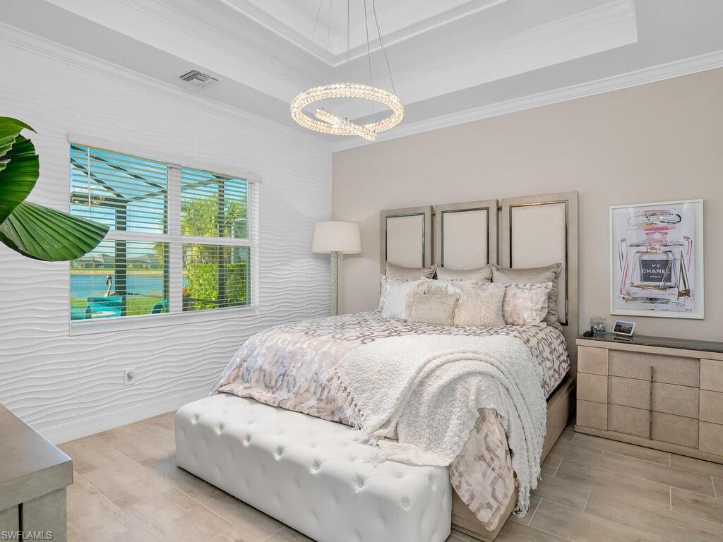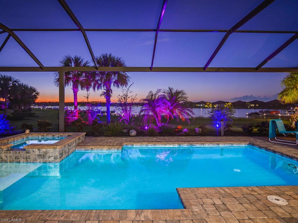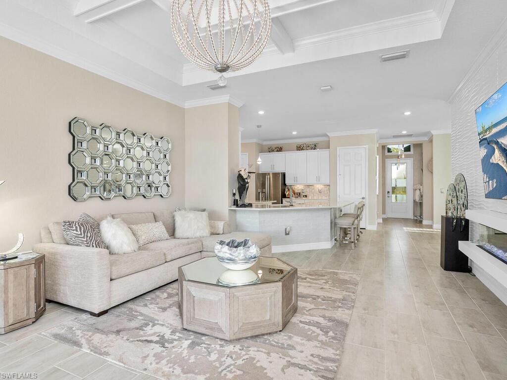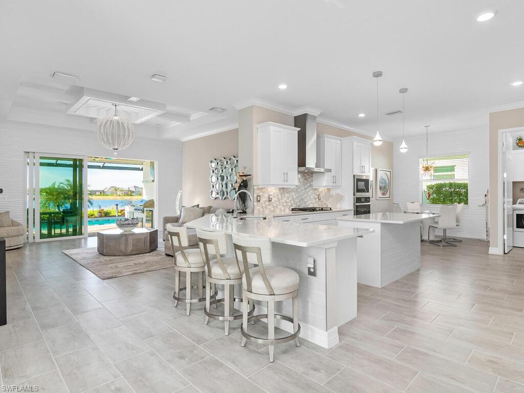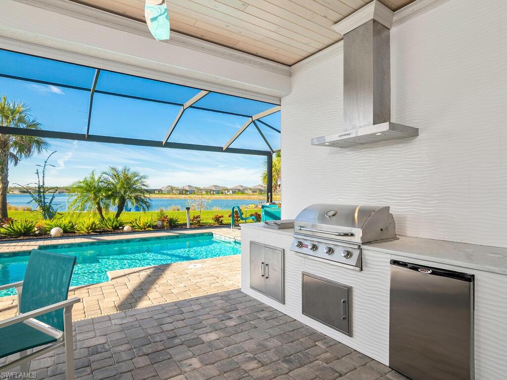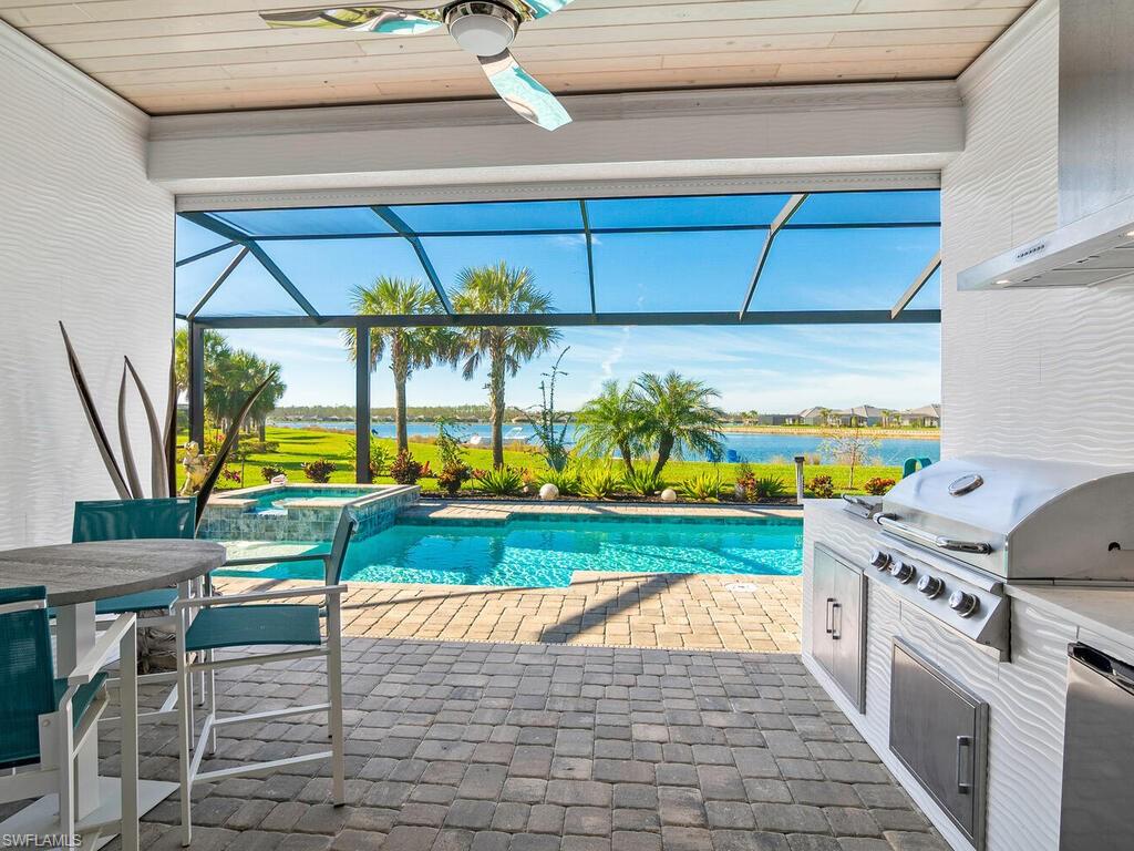 HUGE PRICE IMPROVEMENT! FURNISHED! STUNNING LAKE VIEWS! Welcome to Vista WildBlue! BETTER THAN NEW! NOT IN A FLOOD ZONE! Looks and feels like a model that is loaded with upgrades and designed to impress the most discerning buyer. This beautiful Tivoli floorplan offers 2,271 sqft under air with 4 full bedrooms, 3 full bathrooms and a 3-CAR GARAGE! This gorgeous home is being sold designer FURNISHED! Custom finishes throughout with custom coffered ceilings in living room and primary suite, crown molding throughout, upgraded new lighting, chandeliers, faucets, hardware, wave tile, screened entryway, outlet covers, door handles, hinges, stoppers, towel racks and toilet paper holders. The oversized kitchen is a chef's delight with abundant cabinets and counterspace, natural gas, upgraded stainless-steel appliances, refrigerator has built-in Keurig coffee maker, quartz countertops, designer glass tile backsplash included in cooking, bar, and center island, above cabinet lighting and a cozy separate eat-in nook with custom wall mirror. The dining room is stunning with a beautiful chandelier and custom wall mirrors. The living room is open to dining room and kitchen areas with beautiful entertainment wall and built-in fireplace. The living area extends out to the beautiful outdoor covered lanai with new outdoor kitchen (never used), custom wave tile on walls, new tongue-and-groove ceiling with remote lighting behind crown molding and electric hurricane shutters for peace of mind. A beautiful sparking pool with spill over spa overlooks gorgeous lake views with upgraded lush tropical landscaping and outdoor lighting with spectacular evening sunsets. The primary suite is a luxurious retreat that includes new floor tile, wave tile, custom coffered ceiling, lighting and a large walk-in closet with beautiful views of the pool and lake. The primary bathroom has been redesigned by removing the tub for an oversized walk-in glass shower, double sinks, and private water closet. Split secondary bedrooms offer separation and privacy. The front bedroom is an ensuite perfect for guest with its own private bathroom and a new glass shower enclosure. The large 3-car garage has storage cabinets with lighting below and storage above the garage doors. This home has impact windows and doors, and flood insurance is not required. All pavers in the pool area and driveway have just been power washed and professionally sealed. WildBlue offers 5-star amenities, 800-acre lake, resort pool, lap pool, day spa, 6 har-tru tennis courts, 8 pickleball courts, full time tennis director, fitness center, boat launch w/day docks, playground, sport court, indoor fine dining and outside pool bar/grill. WildBlue is the perfect location between Naples & Ft Myers, minutes from Miromar Outlets, Gulf Coast Town Center Mall, Hertz Arena, SWFL Intl Airport, schools, shopping, restaurants and close to beautiful beaches.