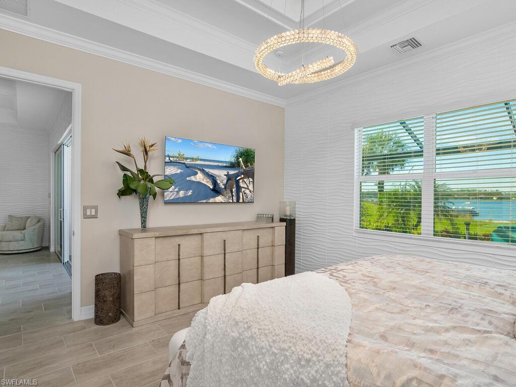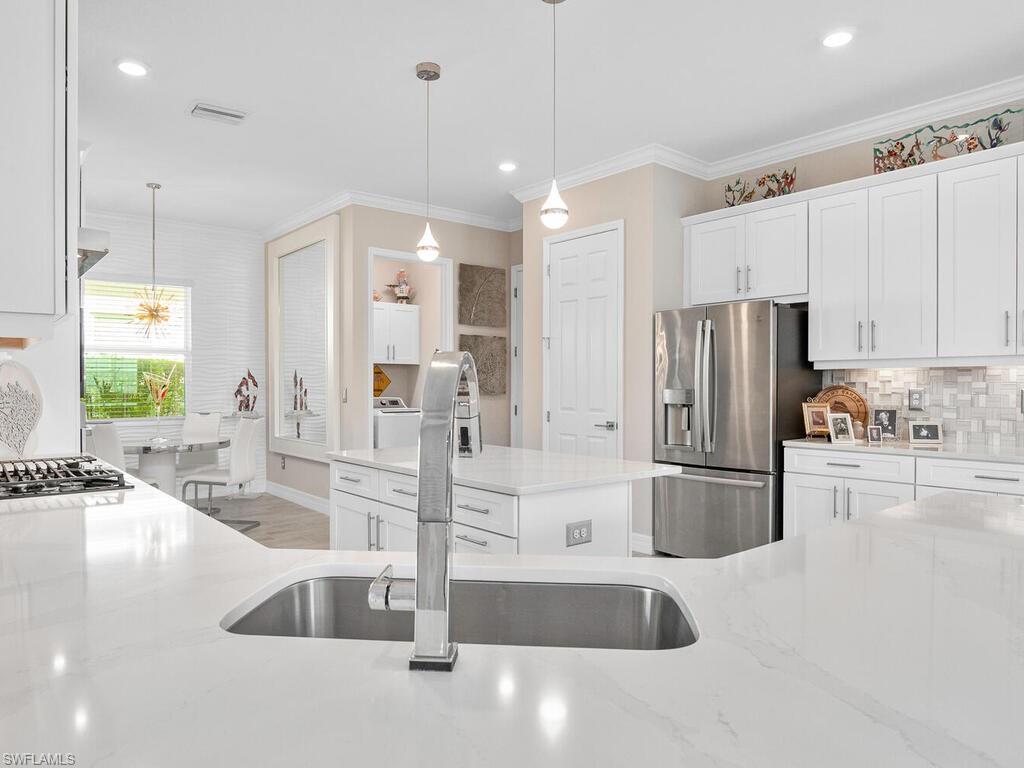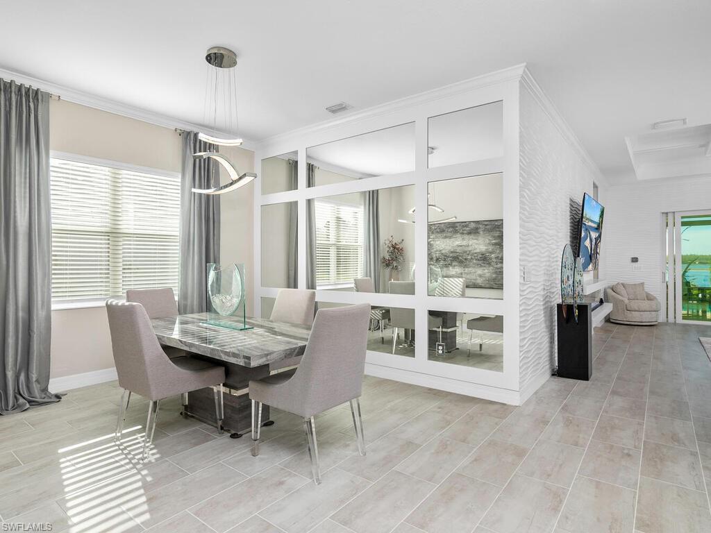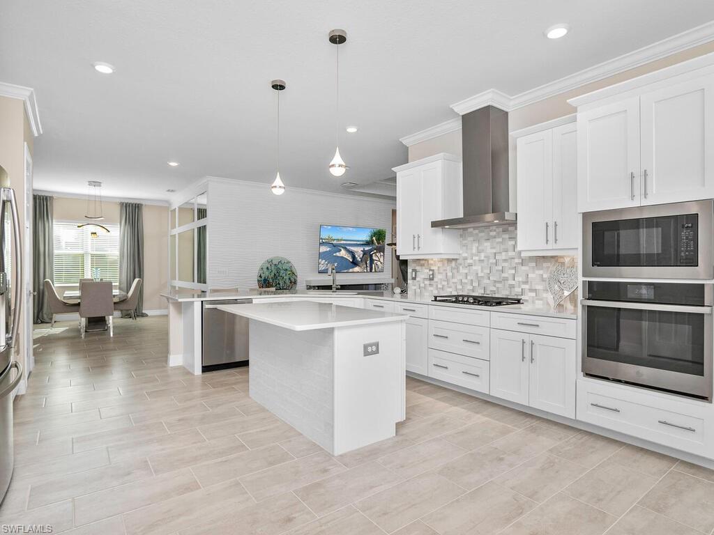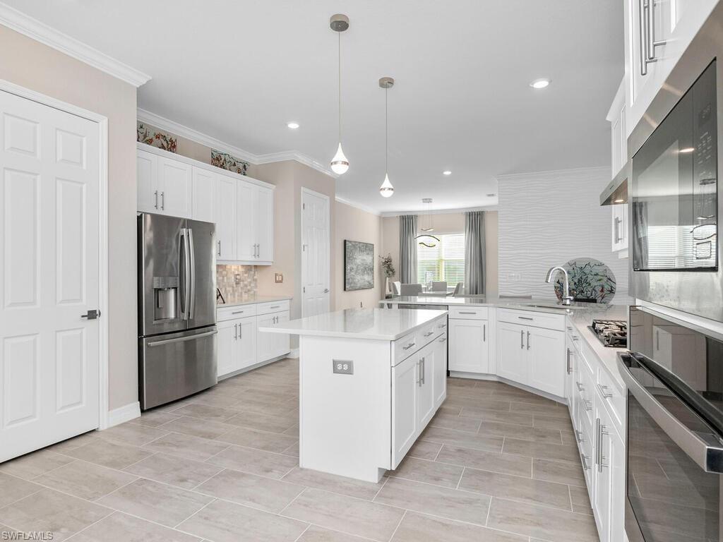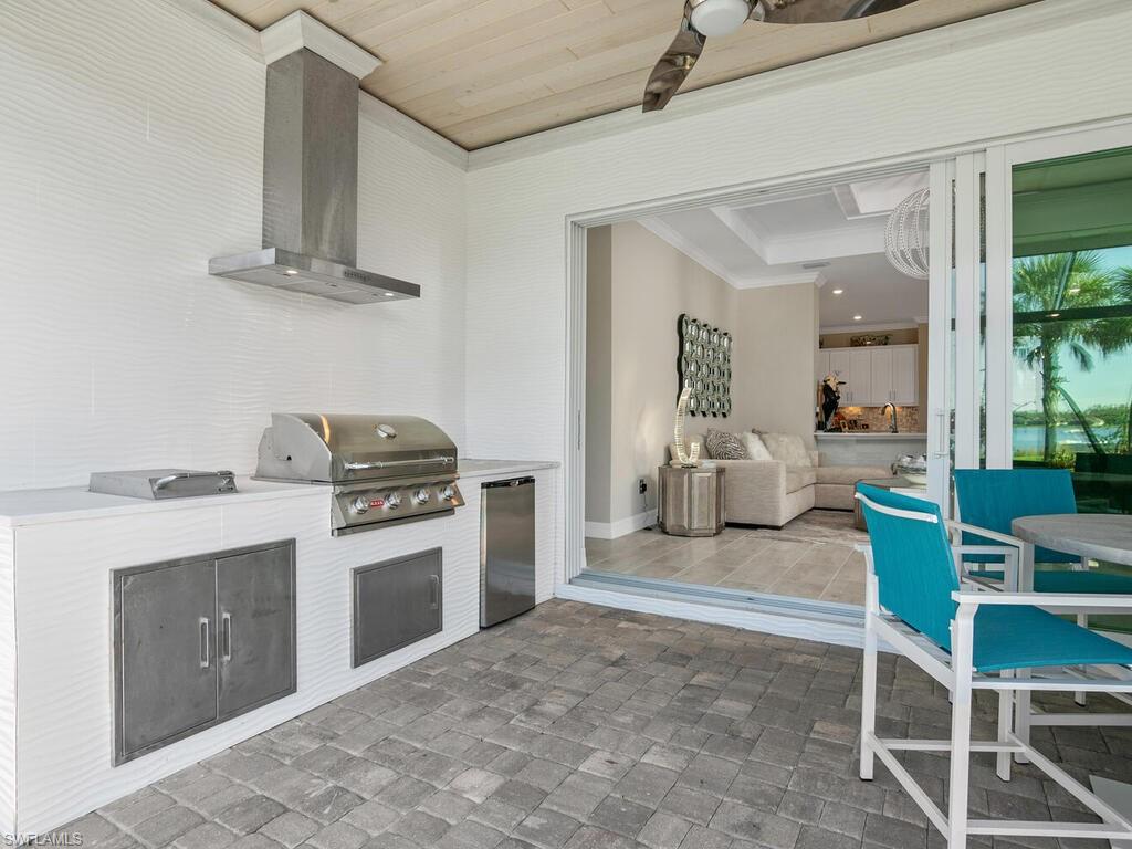 HUGE PRICE IMPROVEMENT! FURNISHED! STUNNING LAKE VIEWS! Welcome to Vista WildBlue! BETTER THAN NEW! NOT IN A FLOOD ZONE! Looks and feels like a model that is loaded with upgrades and designed to impress the most discerning buyer. This beautiful Tivoli floorplan offers 2,271 sqft under air with 4 full bedrooms, 3 full bathrooms and a 3-CAR GARAGE! This gorgeous home is being sold designer FURNISHED! Custom finishes throughout with custom coffered ceilings in living room and primary suite, crown molding throughout, upgraded new lighting, chandeliers, faucets, hardware, wave tile, screened entryway, outlet covers, door handles, hinges, stoppers, towel racks and toilet paper holders. The oversized kitchen is a chef's delight with abundant cabinets and counterspace, natural gas, upgraded stainless-steel appliances, refrigerator has built-in Keurig coffee maker, quartz countertops, designer glass tile backsplash included in cooking, bar, and center island, above cabinet lighting and a cozy separate eat-in nook with custom wall mirror. The dining room is stunning with a beautiful chandelier and custom wall mirrors. The living room is open to dining room and kitchen areas with beautiful entertainment wall and built-in fireplace. The living area extends out to the beautiful outdoor covered lanai with new outdoor kitchen (never used), custom wave tile on walls, new tongue-and-groove ceiling with remote lighting behind crown molding and electric hurricane shutters for peace of mind. A beautiful sparking pool with spill over spa overlooks gorgeous lake views with upgraded lush tropical landscaping and outdoor lighting with spectacular evening sunsets. The primary suite is a luxurious retreat that includes new floor tile, wave tile, custom coffered ceiling, lighting and a large walk-in closet with beautiful views of the pool and lake. The primary bathroom has been redesigned by removing the tub for an oversized walk-in glass shower, double sinks, and private water closet. Split secondary bedrooms offer separation and privacy. The front bedroom is an ensuite perfect for guest with its own private bathroom and a new glass shower enclosure. The large 3-car garage has storage cabinets with lighting below and storage above the garage doors. This home has impact windows and doors, and flood insurance is not required. All pavers in the pool area and driveway have just been power washed and professionally sealed. WildBlue offers 5-star amenities, 800-acre lake, resort pool, lap pool, day spa, 6 har-tru tennis courts, 8 pickleball courts, full time tennis director, fitness center, boat launch w/day docks, playground, sport court, indoor fine dining and outside pool bar/grill. WildBlue is the perfect location between Naples & Ft Myers, minutes from Miromar Outlets, Gulf Coast Town Center Mall, Hertz Arena, SWFL Intl Airport, schools, shopping, restaurants and close to beautiful beaches.