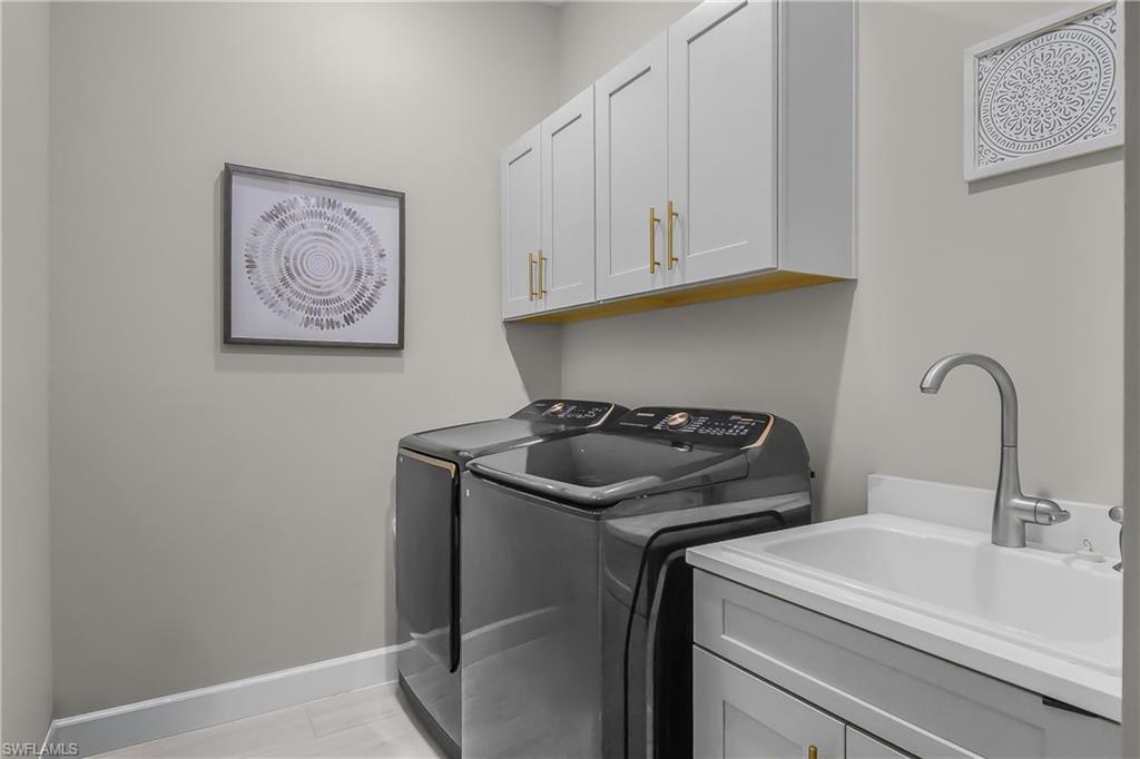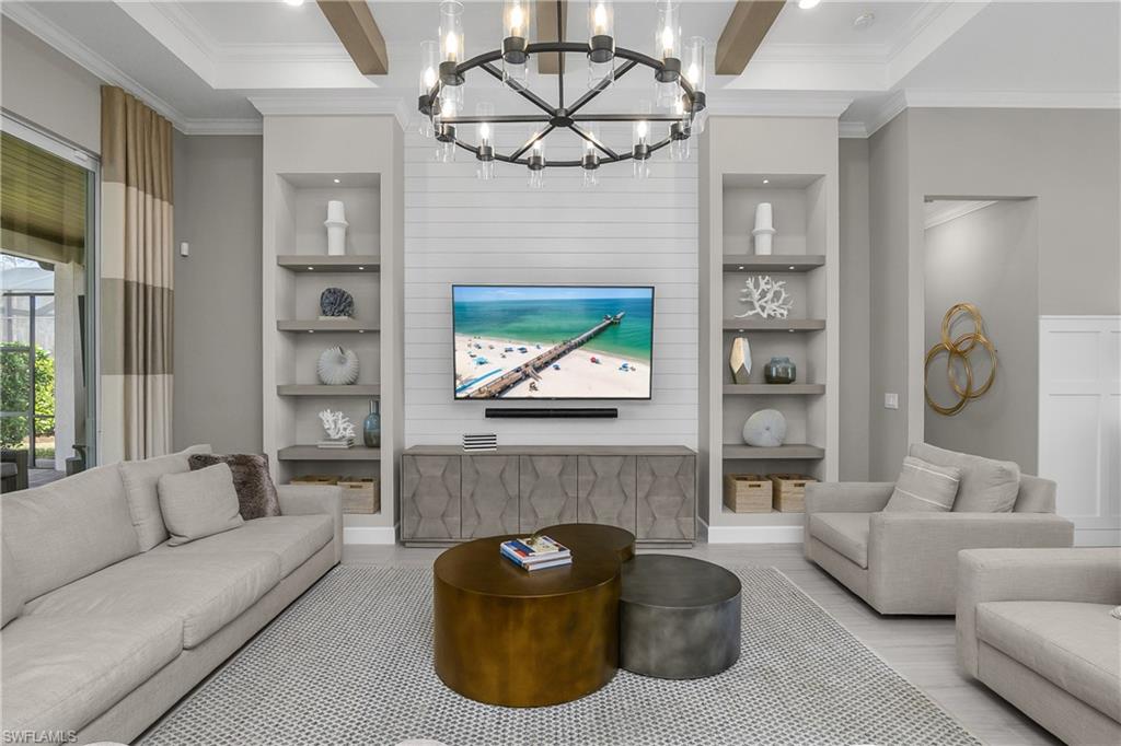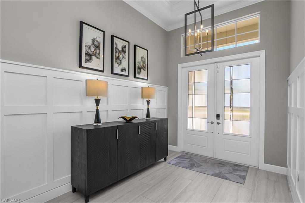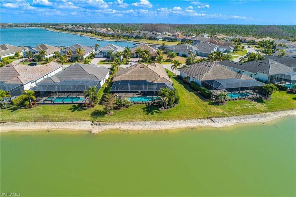 Welcome to WildBlue. Modern elegance captivates you the moment you walk through the door of this impressive designer fully furnished home. This beautiful home has every upgrade you can imagine. The Iris floor plan built by WCI offers 4 bedrooms, 3 bathrooms and 3 car AIR-CONDITIONED GARAGE. This house features a full house GENERATOR, custom ELECTRIC HURRICANE BLINDS and IMPACT WINDOWS & DOORS. Grand entry through the double glass doors welcomes you into a stunning open living room with custom built-in wall unit looking into the elegant dining room, kitchen and casual eating area. Impressive kitchen with natural gas cooktop, built-in oven and microwave, upgraded stainless steel appliances, large center island, water filtration system, quartz counter tops and backsplash make this a delight for cooking and entertaining. Upgraded designer finished wall and ceiling accents, crown molding, lighting fixtures and beautiful remote control window blinds through-out, tile in whole house make this home feel and look like a model. Primary suite has private doors out to the pool area, custom built-in closets, separate soaking tub, walk-in shower and separate vanities. Spacious secondary bedrooms are separated for privacy for guest. A huge, extended covered pool lanai with outdoor kitchen and outdoor living area with beautiful water and preserve views creates another living environment year-round to relax by the pool or entertain with friends and family. WildBlue offers 5-star amenities, 800-acre lake, resort pool, lap pool, day spa, 6 har-tru tennis courts, 8 pickleball courts, full time tennis director, fitness center, boat launch w/day docks, playground, sport court, indoor fine dining and outside pool bar/grill. WildBlue is the perfect location between Naples & Ft Myers, minutes from Miromar Outlets, Gulf Coast Town Center Mall, Hertz Arena, SWFL Intl Airport, schools, shopping, restaurants and close to beautiful beaches. Watch video tour! Contact for a private showing.