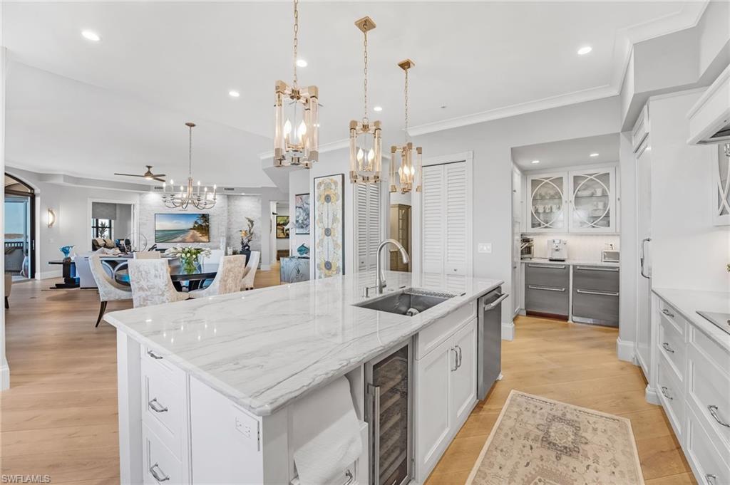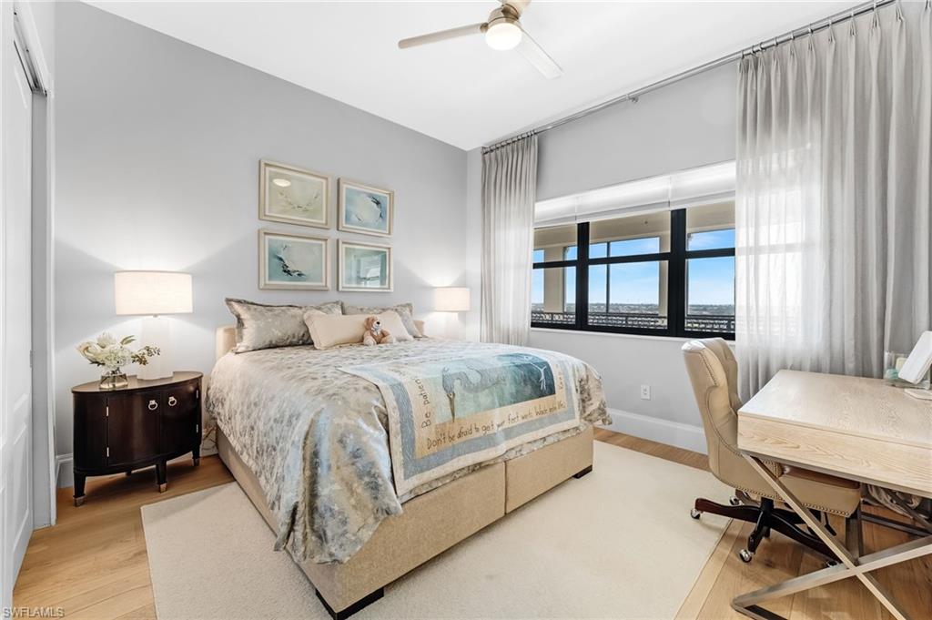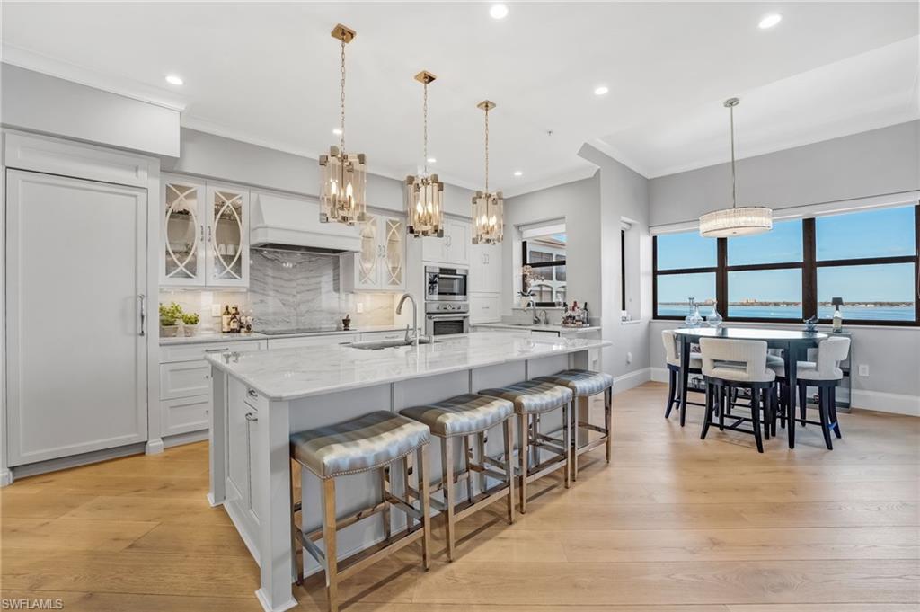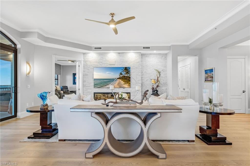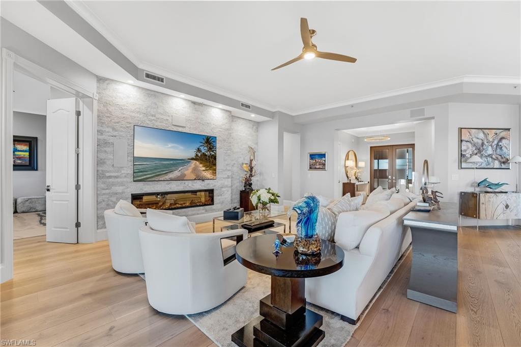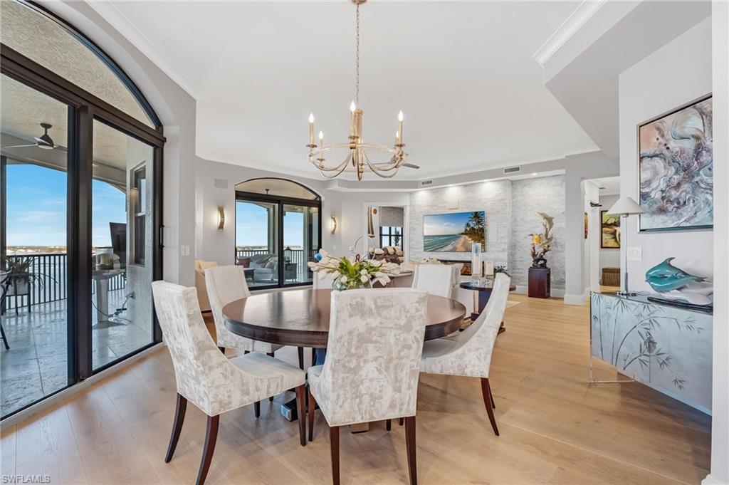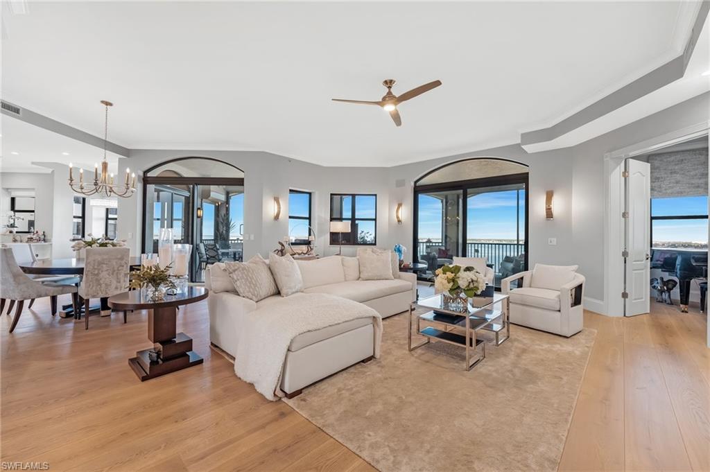 Elegantly nestled within Gulf Harbour Yacht & Country Club, Palmas Del Sol presents a refined coastal lifestyle enriched by luxury and resort-style amenities. This exquisitely renovated 9th-floor penthouse captures sweeping panoramic views of the Caloosahatchee River from its expansive lanai. Spanning over 4,000 square feet of sophisticated indoor and outdoor living, the coveted Espana floor plan offers 3 bedrooms plus a den and an office and 3.5 baths, thoughtfully designed for both intimate moments and grand entertaining.Offered fully furnished and professionally curated by Pacifica of Naples, this residence is a true masterpiece. Upon entering the building, you are welcomed by newly renovated, breathtaking lobbies before ascending via the elevator to the penthouse. Double glass entry doors open to soaring ceilings and timeless transitional interiors, highlighted by a dramatic quartz stacked-stone feature wall. The kitchen, office, and primary suite all enjoy captivating river views, while French limestone enhances the lanai and European wide-plank natural oak flooring flows seamlessly throughout.The custom-designed kitchen and butleru2019s pantry are impeccably appointed with a 42` Sub-Zero refrigerator, four Sub-Zero freezer drawers, Thermador induction cooktop and oven, Wolf steam oven, bar sink with ice maker, and exotic Caribbean Calacatta quartzite countertops and backsplash. The spa-inspired primary bath showcases Italian marble, dual Calacatta marble vanities, a luxurious soaking tub, and an elegant walk-in shower wrapped in classic marble. Two additional guest suites feature full ensuite baths with walk-in showers, Silver Cloud travertine flooring, custom cabinetry, and marble countertops.Additional highlights include surround sound, full hurricane protection, two new A/C systems, striking designer lighting, crown molding, exquisite wallpaper, and a two-car under-building garage with epoxy flooring. Residents enjoy one of Gulf Harbouru2019s premier pool and spa settings, along with a clubhouse offering billiards, kitchenette, meeting rooms, library, and BBQ areau2014perfect for both social gatherings and quiet relaxation.Gulf Harbouru2019s championship 18-hole golf course winds along the Caloosahatchee River, complemented by a fully appointed spa and world-class fitness center with saunas, massage services, and over 30 weekly exercise classes. The tennis complex features eight Har-Tru courts and a heated pool, while the 186-slip floating dock marina provides full-service boating amenities. World-class dining awaits with the completion of the beautifully renovated clubhouse in 2026. Two exceptional videos are available to further showcase this extraordinary residence and lifestyle. 2 fabulous videos to enjoy this home to the fullest as well as the renovations to our clubhouse that is underway!