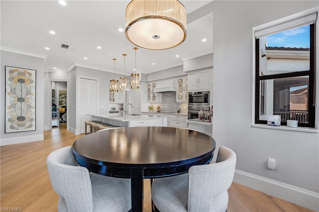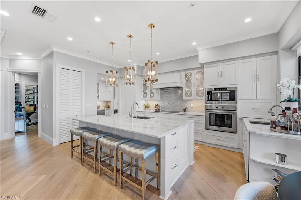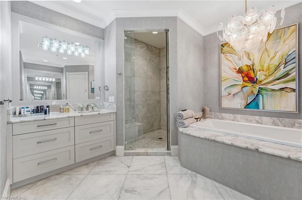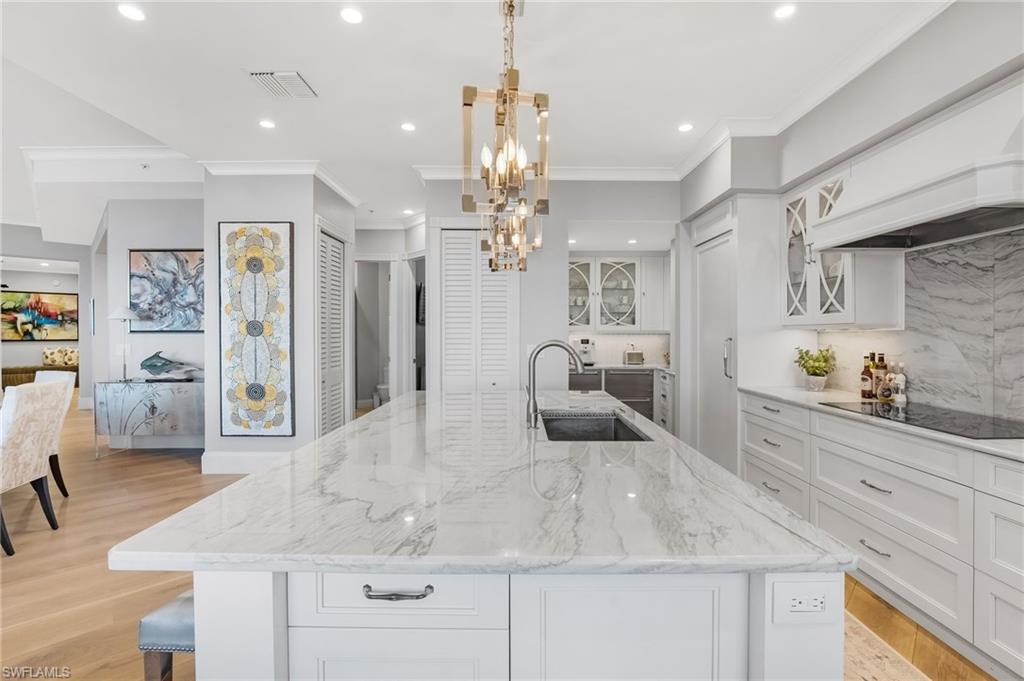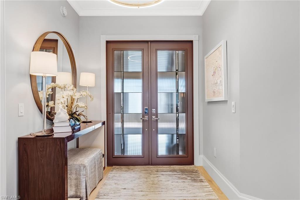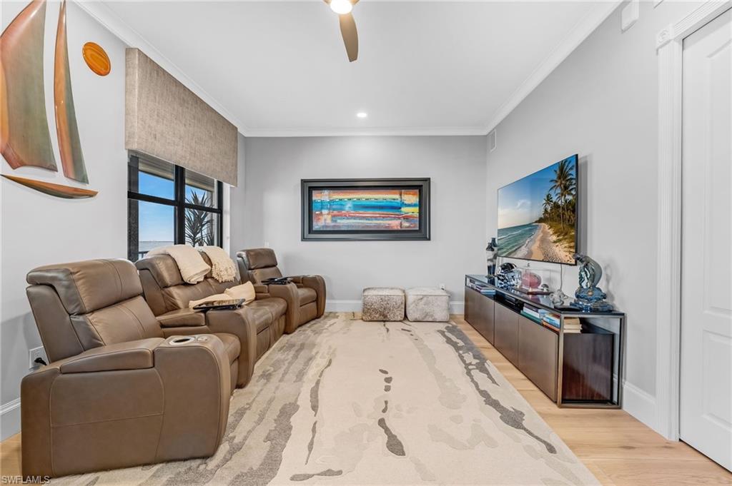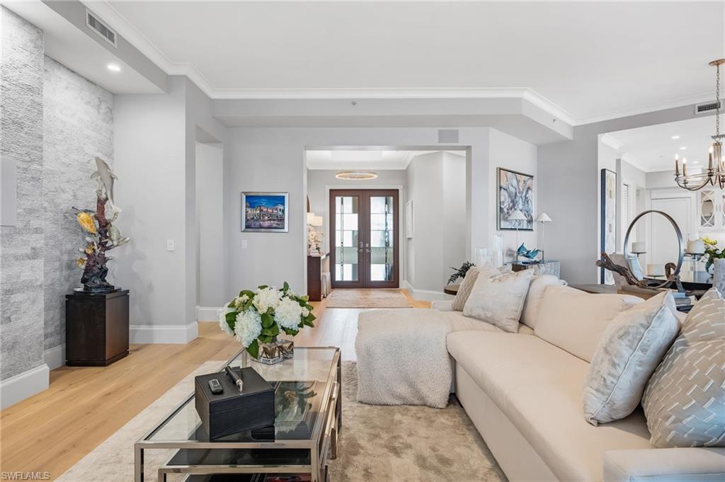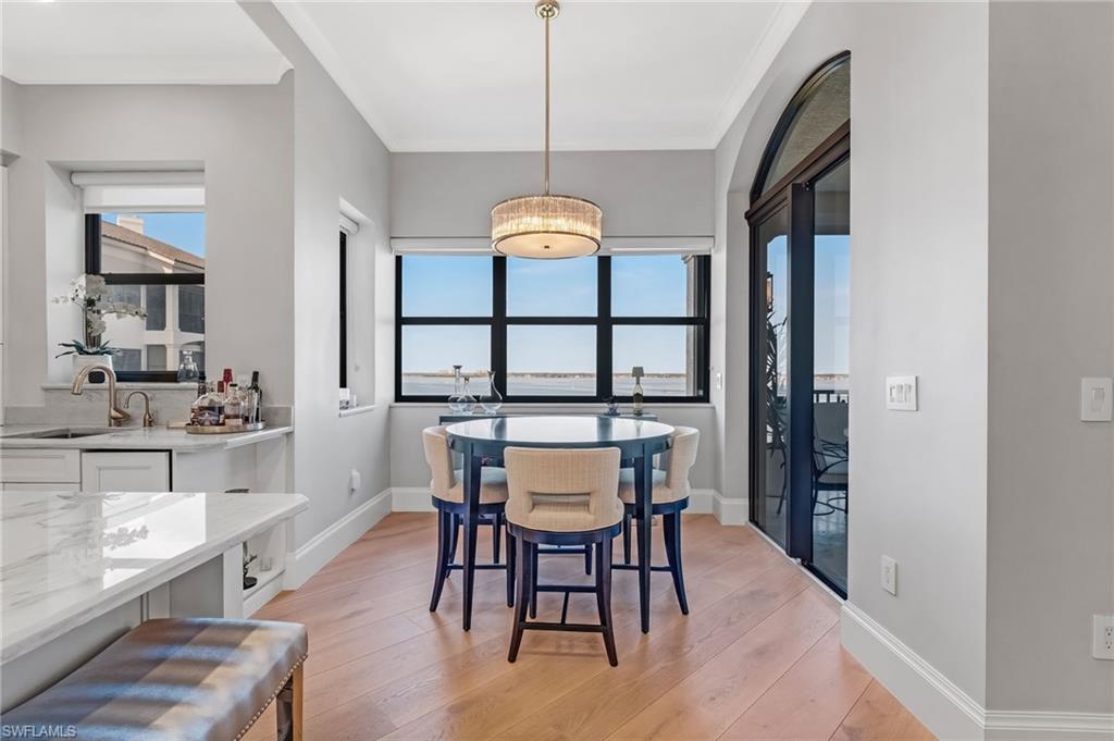 Elegantly nestled within Gulf Harbour Yacht & Country Club, Palmas Del Sol presents a refined coastal lifestyle enriched by luxury and resort-style amenities. This exquisitely renovated 9th-floor penthouse captures sweeping panoramic views of the Caloosahatchee River from its expansive lanai. Spanning over 4,000 square feet of sophisticated indoor and outdoor living, the coveted Espana floor plan offers 3 bedrooms plus a den and an office and 3.5 baths, thoughtfully designed for both intimate moments and grand entertaining.Offered fully furnished and professionally curated by Pacifica of Naples, this residence is a true masterpiece. Upon entering the building, you are welcomed by newly renovated, breathtaking lobbies before ascending via the elevator to the penthouse. Double glass entry doors open to soaring ceilings and timeless transitional interiors, highlighted by a dramatic quartz stacked-stone feature wall. The kitchen, office, and primary suite all enjoy captivating river views, while French limestone enhances the lanai and European wide-plank natural oak flooring flows seamlessly throughout.The custom-designed kitchen and butleru2019s pantry are impeccably appointed with a 42` Sub-Zero refrigerator, four Sub-Zero freezer drawers, Thermador induction cooktop and oven, Wolf steam oven, bar sink with ice maker, and exotic Caribbean Calacatta quartzite countertops and backsplash. The spa-inspired primary bath showcases Italian marble, dual Calacatta marble vanities, a luxurious soaking tub, and an elegant walk-in shower wrapped in classic marble. Two additional guest suites feature full ensuite baths with walk-in showers, Silver Cloud travertine flooring, custom cabinetry, and marble countertops.Additional highlights include surround sound, full hurricane protection, two new A/C systems, striking designer lighting, crown molding, exquisite wallpaper, and a two-car under-building garage with epoxy flooring. Residents enjoy one of Gulf Harbouru2019s premier pool and spa settings, along with a clubhouse offering billiards, kitchenette, meeting rooms, library, and BBQ areau2014perfect for both social gatherings and quiet relaxation.Gulf Harbouru2019s championship 18-hole golf course winds along the Caloosahatchee River, complemented by a fully appointed spa and world-class fitness center with saunas, massage services, and over 30 weekly exercise classes. The tennis complex features eight Har-Tru courts and a heated pool, while the 186-slip floating dock marina provides full-service boating amenities. World-class dining awaits with the completion of the beautifully renovated clubhouse in 2026. Two exceptional videos are available to further showcase this extraordinary residence and lifestyle. 2 fabulous videos to enjoy this home to the fullest as well as the renovations to our clubhouse that is underway!