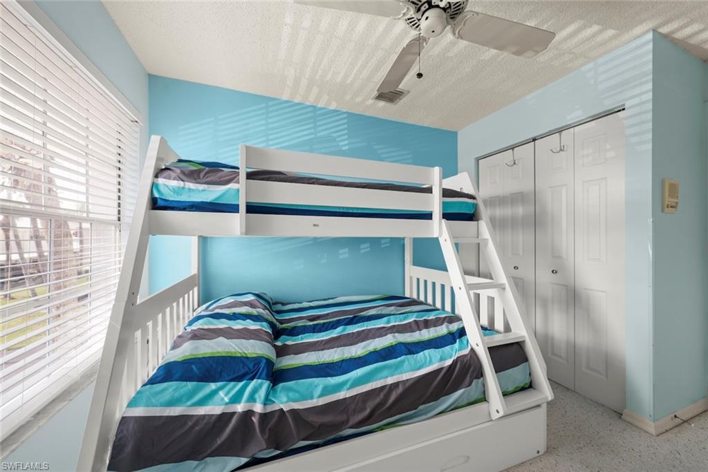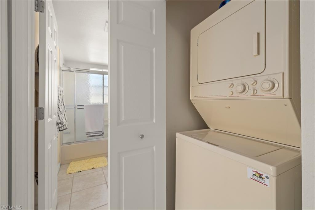 SUNLIGHT POURS IN OFF THE GLISTENING LAKE. Second floor end unit with windows seemingly everywhere. Located in the Rivers Edge Community of prestigious Gulf Harbour Golf and Country Club in Southwest Ft. Myers. The living room, kitchen and primary bedroom are wrapped around the huge screened lanai with the sliding doors forming a corner of glass that allows the spectacular water view to sparkle through virtually the entire unit. Vaulted ceilings increase the open feeling. Laminate flooring thru the living area with Berber carpet in the bedrooms. Updated kitchen with granite countertops and lazy Susan lower units. Primary bedroom accommodates a king bed plus supporting furnishings. Large walk-in closets. Updated bath. Large closets in both guest bedrooms, one with a conventional bedroom set and the other with bunk beds and pull-out trundle. Stacked washer and dryer with utility closet adjacent to bedrooms. Updated guest bath. Dining area overlooks water view. Covered reserved parking. Guest parking nearby. Just a few steps to the community pool and spa. Sold completely turnkey with classic comfortable furnishings so it is move-in ready, either as a winter hideaway or great seasonal rental. Miles of pathways inside the gate to enjoy bike rides, jogging, or casual walks in the sunshine. Close to Ft. Myers Beach, Sanibel Beach and nearby Bunche Beach. Or simply stroll the private Gulf Harbour Eagle Perch Island for gorgeous sunsets. Surrounded by shopping and restaurants. Easy access to SWFL International Airport, plus Twins and Red Sox baseball stadiums. Additional amenities of golf, tennis, fitness center and two restaurants require an optional membership, now available at a surprisingly low fee.