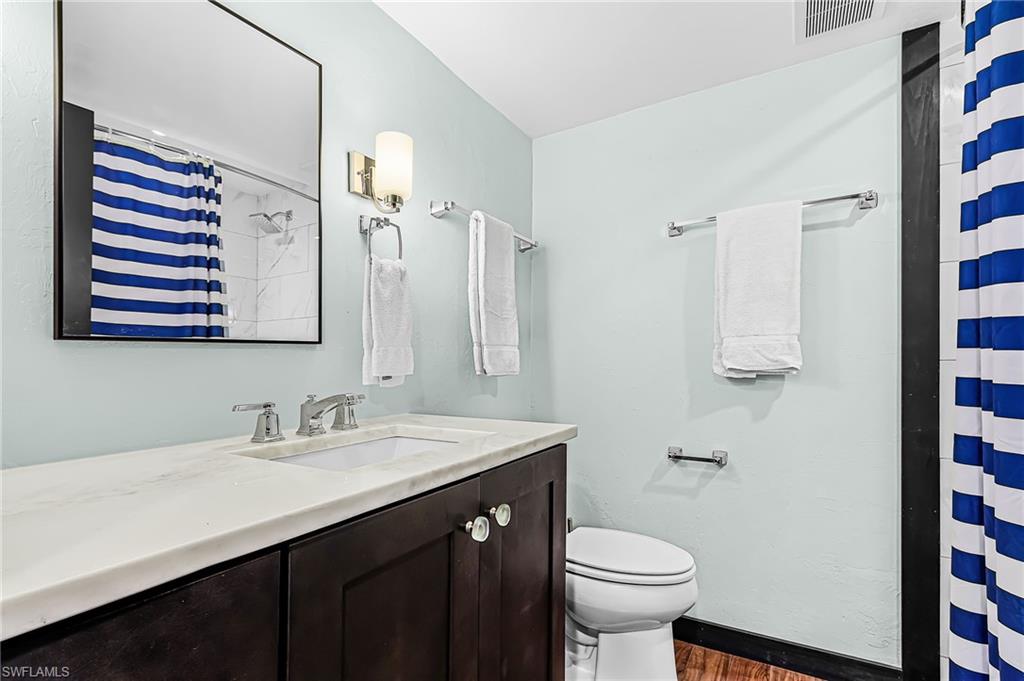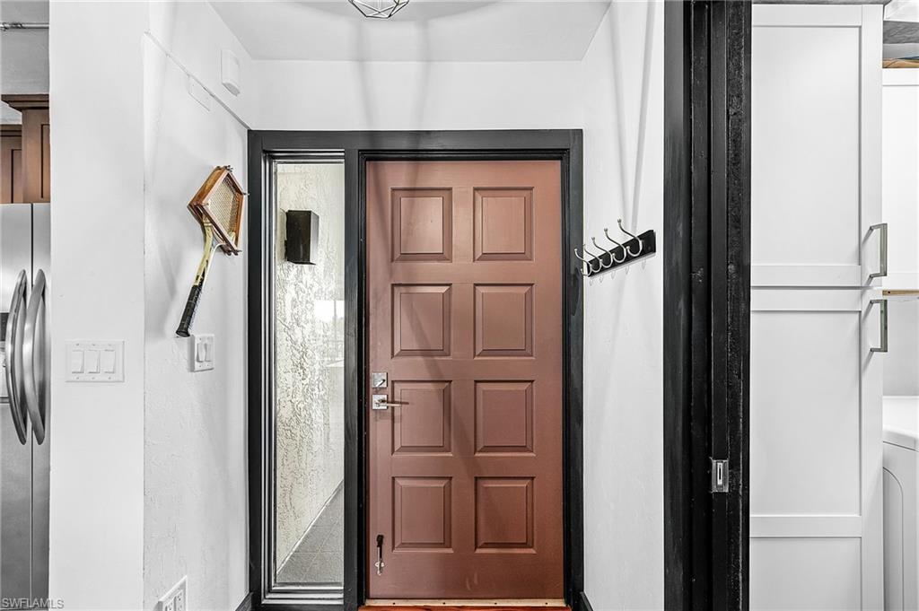This contemporary top-floor three-bedroom turnkey condominium offers a downtown loft ambiance with a unique industrial appeal. The open concept features elevated ceilings, beautiful 42-inch wood cabinetry, stainless appliances, quartz countertops, retro pendant lighting and stylish glass tile backsplash. Gorgeous wood flooring, designer solid core doors and trim enhance the interior. Fully renovated baths feature new vanities, seamless shower doors, and modern tile; the guest bath includes a Jacuzzi tub. Sliding barn doors from the living room provide versatility for the third bedroom or den/sitting area. Comfy leather seating. The lanai offers exceptional golf and lake views, providing a relaxing atmosphere, and a roll-down storm screen provides protection from wind and rain. Trawler Village is centrally located within The Landings Yacht, Golf & Tennis Club, where youu2019ll enjoy the active and u201cbundledu201d lifestyle that includes golf, tennis, pickle ball, bocce, fitness center, lap pool and a boat slip in the well protected Gulf-access marina. Two dining clubs, waterfront picnic area and endless activities. Come live the good life!
