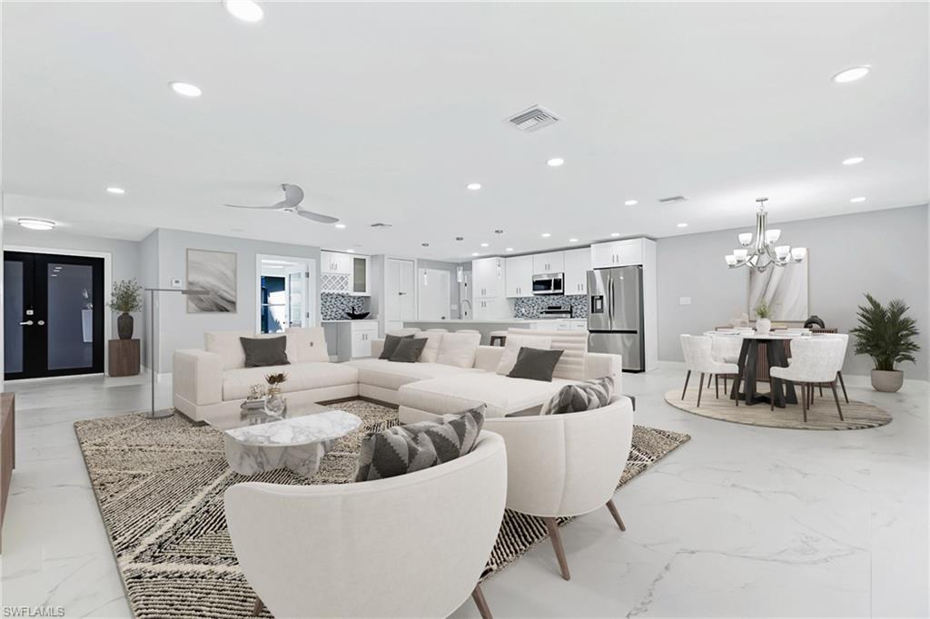 Quiet. Versatile. Entertain. Additional updates and better than everu2014now featuring a brand-new massive lanai and two new impact sliding doors! This stunning home in the highly sought-after Town & River Estates of South Fort Myers has been completely transformed from top to bottom. Every detail of this recent renovation exudes quality and modern style, offering the perfect blend of luxury and livability.Surrounded by beautiful waterfront homes, this property enjoys one of the most desirable locations in Fort Myersu2014just minutes from top restaurants, boutique shopping, healthcare, beaches, downtown, and RSW International Airport.Inside, youu2019ll find 3 spacious bedrooms, a sun-filled den, and a versatile flex room that opens to the new outdoor living area. The flexible layout offers two bonus rooms that can effortlessly serve as additional bedrooms, creating the potential for five-bedroom living. The open-concept kitchen shines with stainless steel appliances, granite countertops, a large island, and a wet baru2014ideal for entertaining. Bathrooms feature elegant tile shower surrounds, granite vanities, and glass enclosures, while the flooring throughout is modern tile for a seamless flow.The entire home is fully impact-resistant, including newer windows and doors, ensuring peace of mind year-round. The expansive, fenced backyard is ready for your personal touchu2014with space for a pool (which the seller can add if desired).Donu2019t miss this opportunity to own a completely new, move-in-ready home in one of South Fort Myersu2019 most established and convenient neighborhoods.
