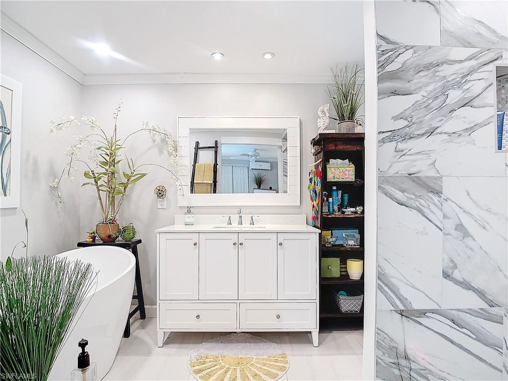 Rare opportunity to own a premier Bayside point corner lot with coveted southeastern exposure on a canalu2014offering over 150 feet of seawall and a setting that is seldom available. Located in Bayside Estates, a highly sought-after 55+ community known for its vibrant lifestyle and outstanding amenities, this extensively updated 2-bedroom, 2-bath home delivers the ultimate coastal vibe and waterfront living experience. No corner has been untouched, featuring u00be` plywood subflooring, u00bc` cement board screwed (not nailed), beautiful porcelain flooring, new windows with marble sills, crown molding, 4` baseboards, recessed lighting, and updated electrical. The primary bath offers a European soaking tub for a spa-like retreat. Outdoor living is designed for both relaxation and entertaining, with a heated 60,000 BTU saltwater Gunnite pool, bronze custom enclosure, remote-controlled lanai blinds, electric hurricane shutters, Tiki hut with outdoor kitchen, Azek decking, professionally designed zero-scape landscaping, and serene preserve views. Wine and dine, host gatherings, or simply unwind while boats cruise pastu2014this property offers multiple spaces to enjoy the waterfront lifestyle. Boating enthusiasts will appreciate the new stringers and 10,000 lb boat lift with canopy, and there is 50-amp service for a motorhome along with a 12x20 garage for additional storage or workspace. Just 2.5 miles from Estero Island with convenient access to beaches, dining, and shopping, this home blends privacy, luxury, and accessibility. Bayside Estates features amenities including tennis, community pool, clubhouse, live music, bingo, card nights, and a wide variety of organized activities. Premier point lots like this are rareu2014secure your waterfront retreat before itu2019s gone.