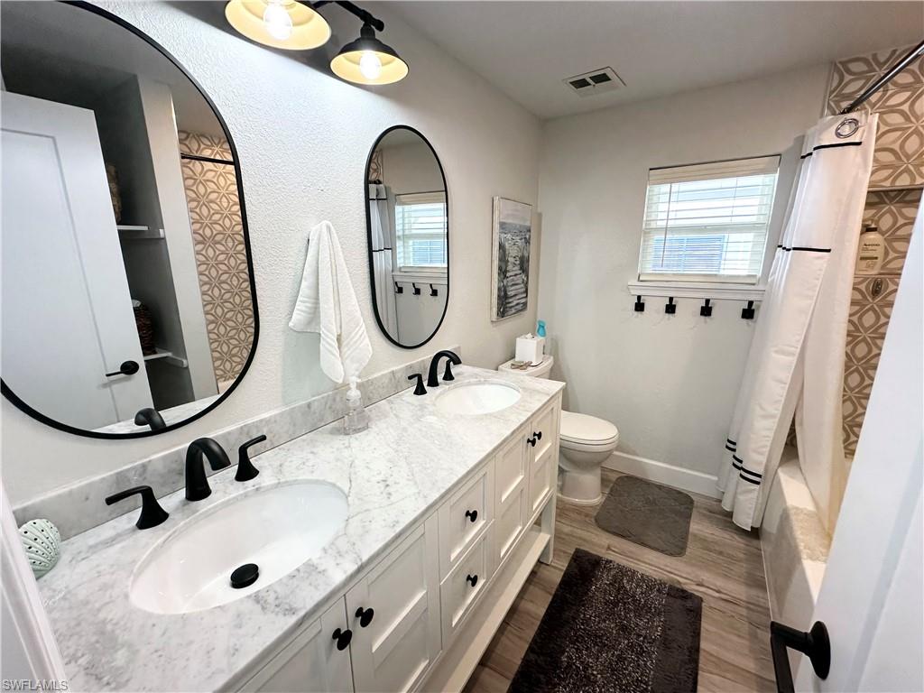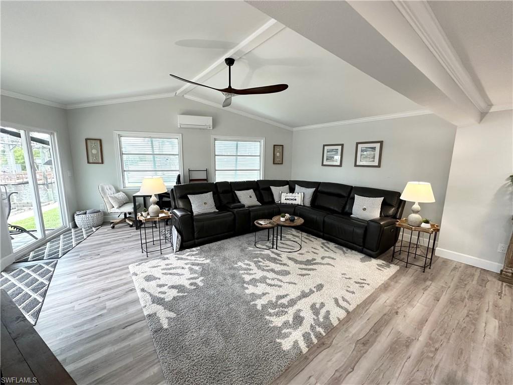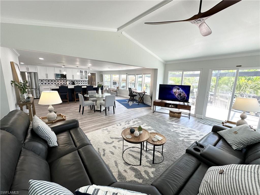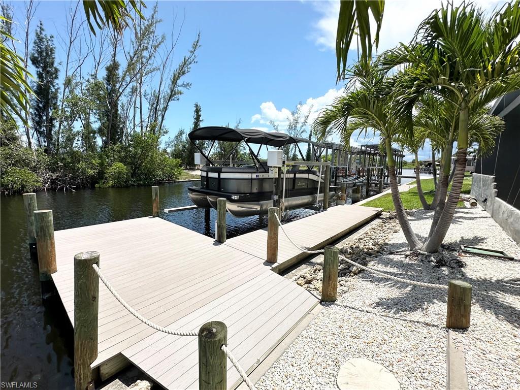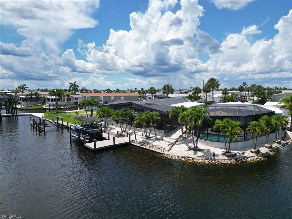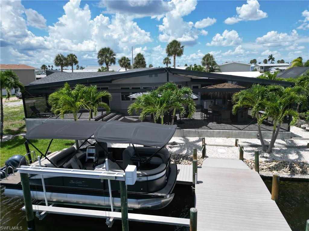 You have worked hard all your life, you raised your kids, done well for yourself-----and now itu2019s YOUR time. Itu2019s time to enjoy what you have toiled all these years for. And what better way to reward yourself than to buy that vacation home in Southwest Florida you have been dreaming of. Imagine, a place to get away from the cold northern winters, a place with endless sunshine, white sandy beaches, tiki bars on every corner and a place to let the grandkids build sandcastles and write their names in the sand. Well, you need to look no further. This spectacular Bayside Estates home has that u201cwow factoru201d from all vantage points, especially when you first walk in. It is spacious, amazingly apportioned, fabulously decorated and nothing less than stunning. The focal point of the home is the kitchen, dining area and great room which seamlessly blends functionality with luxury. Both bedrooms are nicely sized, and the bathrooms are spacious and offer custom tile work and quartz countertops. The master bath has a spacious walk-in shower lined with thick, clear glass. There is a bonus room opposite the kitchen with a couch, chair and TVu2014a great place for the grandkids to entertain themselves while the adults do their thing. Equally as impressive as the inside of the home is the is the rear of the property. Adjacent the waterfront is a 55u2019 X 25-foot custom built lanai. Inside this lanai is a tiki bar complete with an outdoor TV, BBQ, sitting area and a lounge area to work on those tan lines. Beyond the lanai is a custom-built dock and boat lift which currently houses a pontoon boat. Make an appointment to see this home today and start living the dream. Bayside Estates is the best kept secret of Fort Myers Beach. This incredibly active and friendly 55+ community is the crown jewel on the gulf coast. Bayside estates is only 2.5 miles to the beach and is accessible by either car or boat--right from either your driveway or private boat dock. Ride your electric bicycle to the beach for the day and visit the world-famous Jimmy Buffettu2019s Margaritaville. Just don't step on a pop-top!! Major retail vendors are within a very short driving distance for ultimate convenience. For those who donu2019t know a lot about Bayside Estates, it is a very fun place to call home---some would even say itu2019s a mature personu2019s playground. Whether you want to play pickleball, tennis or bocce ball, hang out at the community pool, or simply cruise the hood in your swanky golf cart, there is always something going on around here. People are friendly and you will be warmly welcomed.