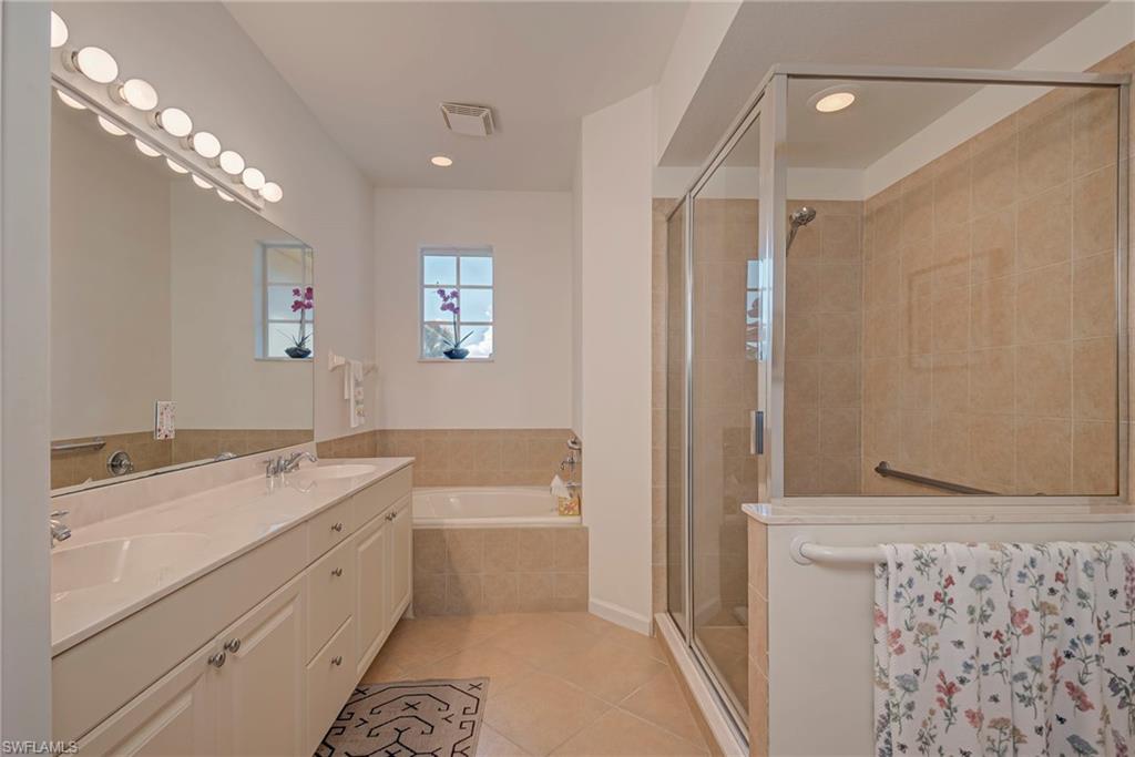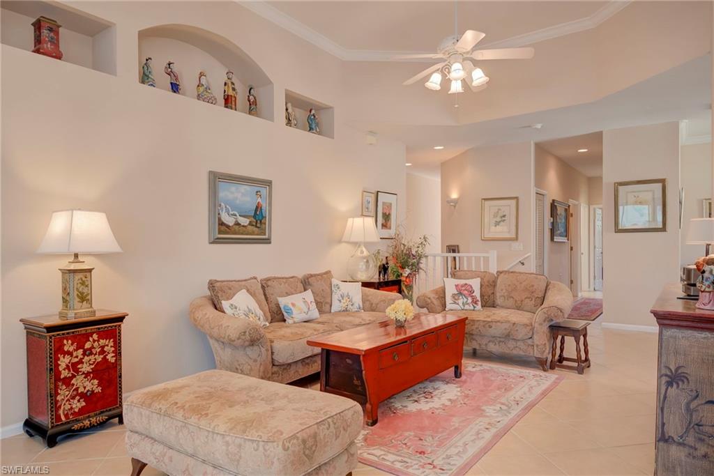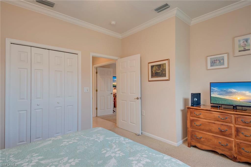 Immaculate Carriage Home with Stunning Lake Views! Nestled in a quiet, gated community just minutes from Southwest Floridau2019s beautiful beaches, this exceptional second-floor carriage home offers nearly 1,800 sq. ft. of refined living space and an incredible eastern lake view.This 3-bedroom, 2-bath residence features a bright and open great room design with volume and tray ceilings, crown molding throughout, and a formal dining area perfect for entertaining. The spacious kitchen flows seamlessly into the living area and out to the large screened lanai, where you can relax and enjoy serene water views and the soothing sound of the lakeu2019s fountain. The master suite offers a private retreat with a walk-in closet, dual vanities, a garden tub, and a walk-in shower. A versatile guest bedroom can easily serve as a media room or den, providing flexible space for your lifestyle. Additional highlights include an attached one-car garage, electric hurricane shutters, and meticulous maintenance throughout. Residents enjoy resort-style amenities just a short walk away, including a community pool, fitness center, and social spaces. Conveniently located near shopping, dining, and entertainment, this pristine home combines comfort, style, and the best of Southwest Florida living.