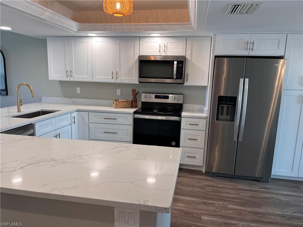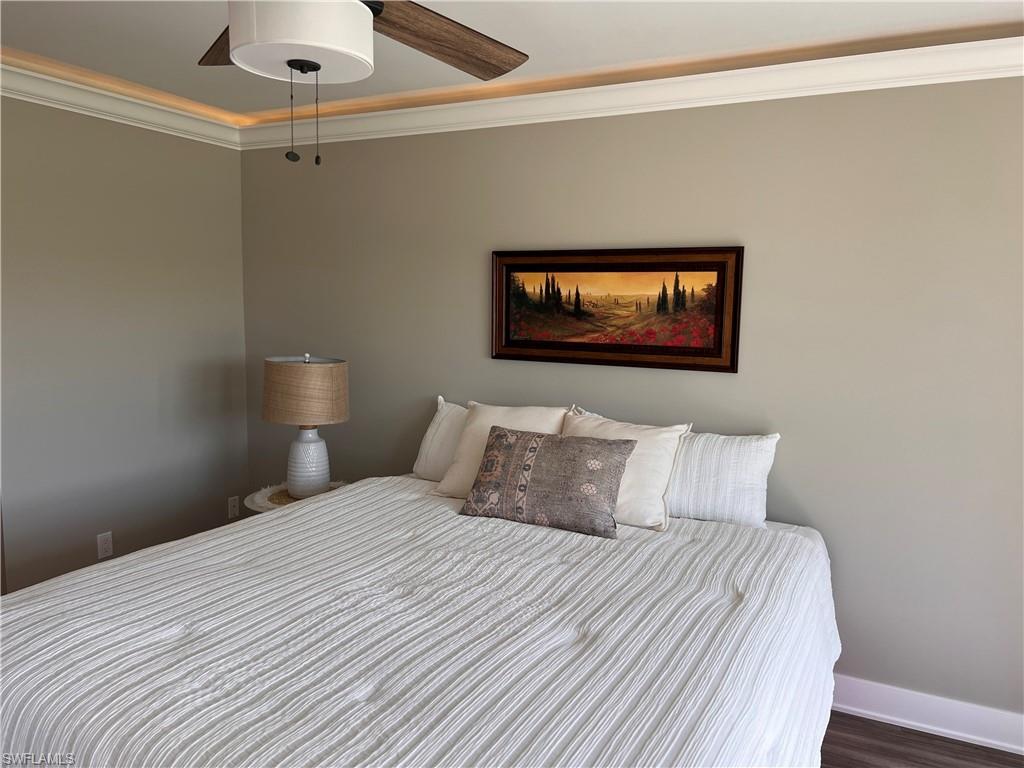 Best price on end unit in Kelly Greens! Light, bright end unit with additional windows! Completely renovated and furnished end unit where salt life meets golf life! This 2-bed + huge den/2-bath with detached garage on the 1st floor captures stunning views of Kelly Greens' 3rd fairway. The den could easily be a 3rd bedroom. The modern kitchen, featuring soft-close cabinets, quartz countertops, and stainless steel appliances, is a delight for culinary enthusiasts. Effortless hosting awaits in the open family/dining area with bar. Enjoy new luxury vinyl tile flooring and designer tile in baths. The guest bath offers a full tub-shower combo, while the owner's bath boasts dual sinks and a walk-in shower. Elegant details like custom crown molding and designer lighting enhance the ambiance. With new electric shutters, new A/C, hwh, and an in-unit washer/dryer, convenience is paramount. Relax on screened lanais in both front and back, and make use of ample storage in the single detached garage with attic. The condo building received a new roof in 2022. Kelly Greens, a gated, bundled golf community, features tennis courts, pools, and a newly renovated clubhouse. Conveniently located near Ft. Myers Beach, Bunche Beach, and the Sanibel Island Causeway.