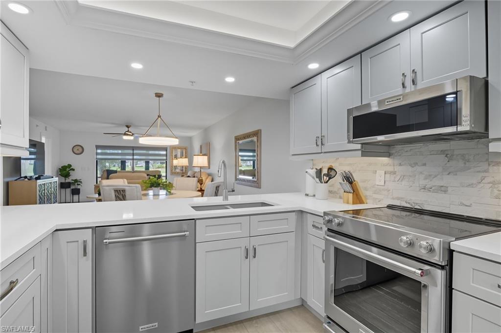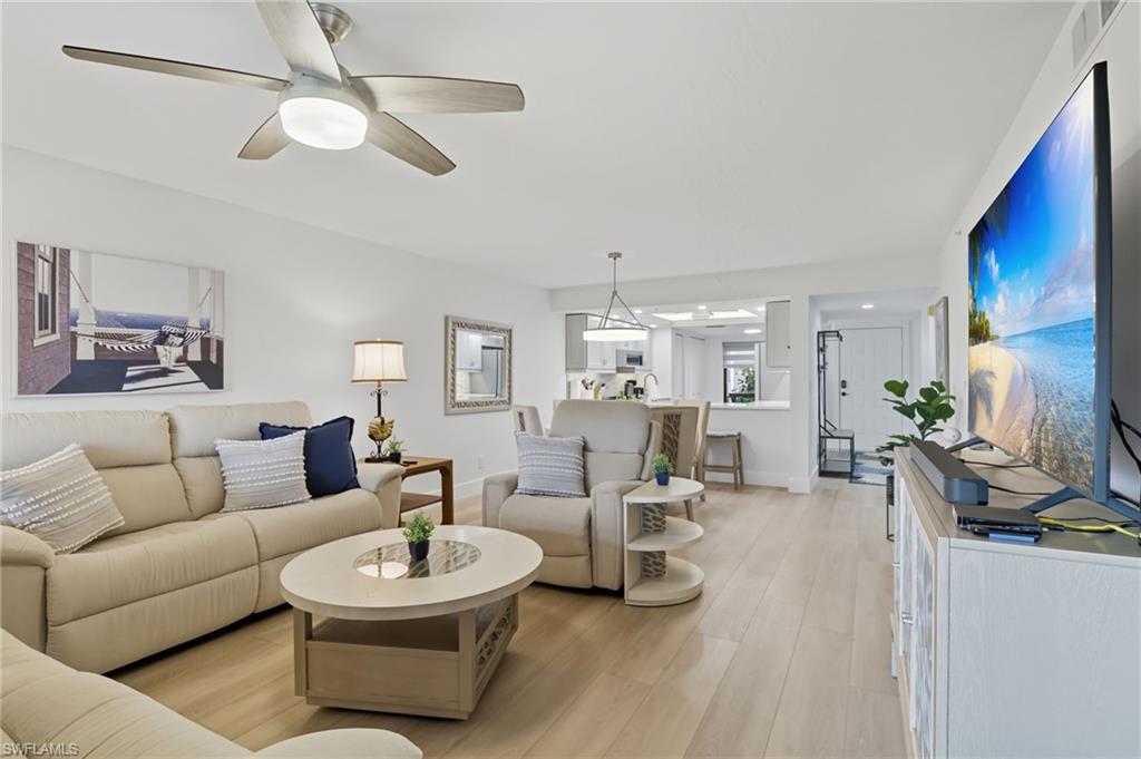 Welcome to this totally renovated 2 bedroom 2 bath condo in the Kelly Greens gated golf course community. No detail was overlooked in this MOVE IN ready TURN KEY unit. What you see is what you get! All decor, pictures, accessories, blinds, furniture, linens, dishes are provided for a seamless move! There are no steps and no carpet! Ceiling fans with remote in every room. Light and airy decor with anything that you could possibly need to enjoy the beaches and sunny southwest Florida!