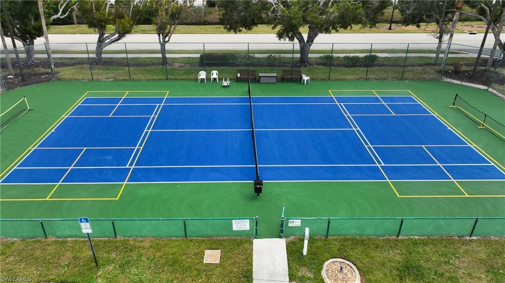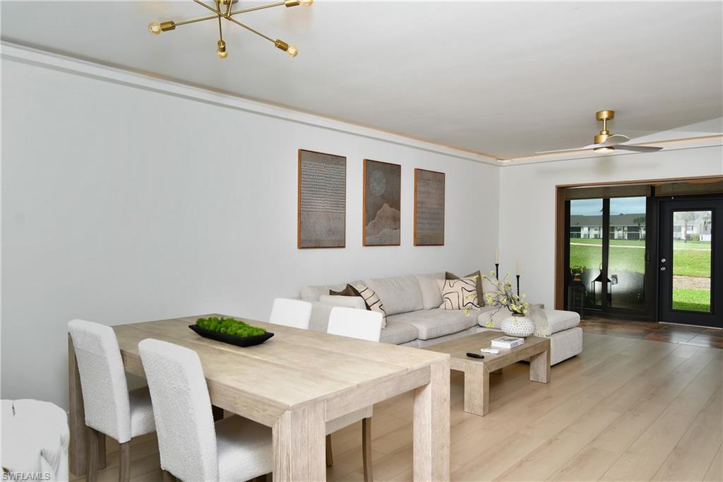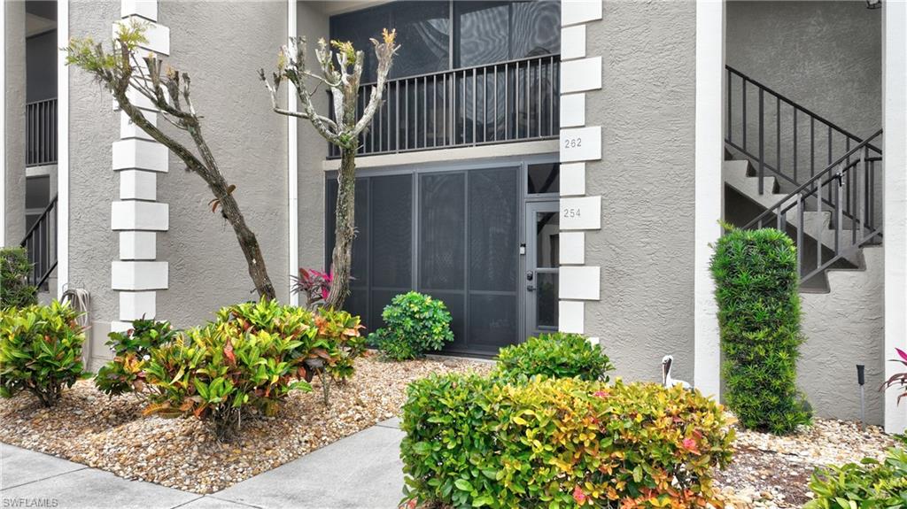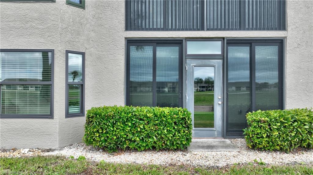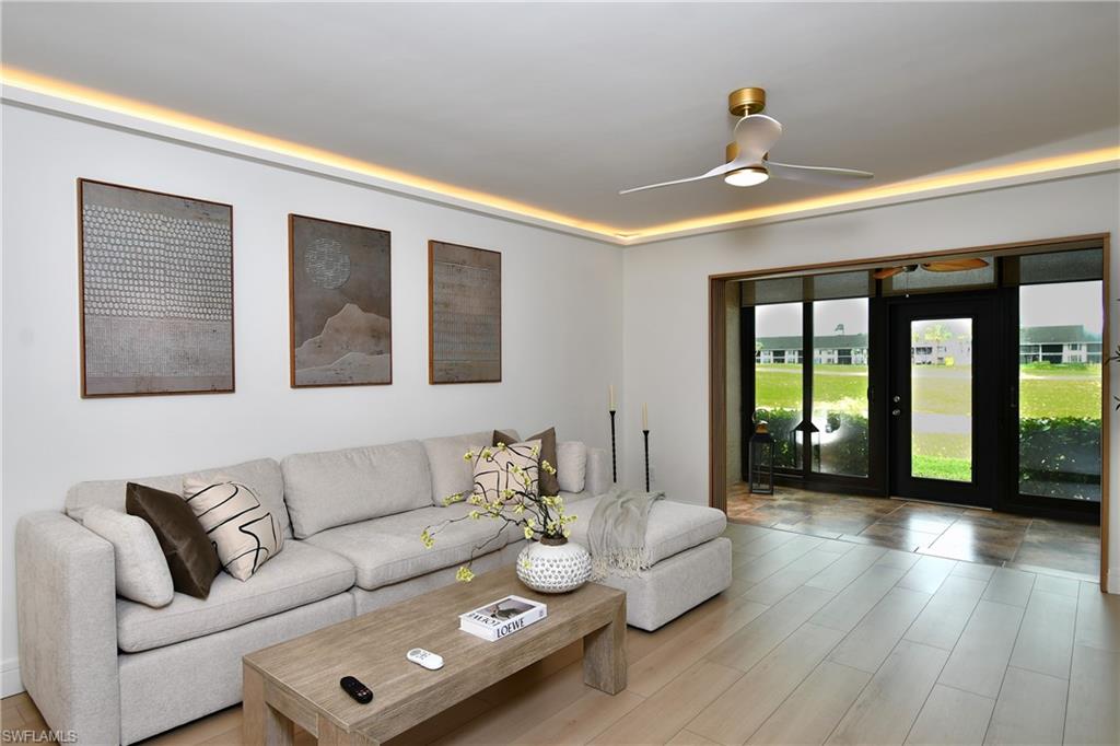 Kelly Greens Veranda Style Condo includes championship golf and clay tennis! This first floor gem has been completely rebuilt. Hurricane sliders adorn the front and back lanais along with hurricane windows in the master bedroom. The main flooring is vinyl style. The bathrooms and lanais have gorgeous tiling. The wall between the kitchen and the hallway has been removed and a kitchen island was built in place. The kitchen has been remodeled with all new custom cabinets, counter tops, and faucets with extra storage. Above and below cabinet lighting has been added along with state of the art lighting with rheostat controls that change brightness and also goes on and off with ALEXA verbal controls.(All programable)! Kitchen appliances have been upgraded to the Samsung style. Large baseboards and new doors have been installed throughout. Crown molding with hidden ceiling lighting has been installed in all main areas and bedrooms. The bathrooms have all new tiling, fixtures, cabinets, cabinet tops, and lighting. Finally, the sliders between the main living area and the golf side lanai have been removed to increase the overall square footage. Wall fireplace and large TV included.