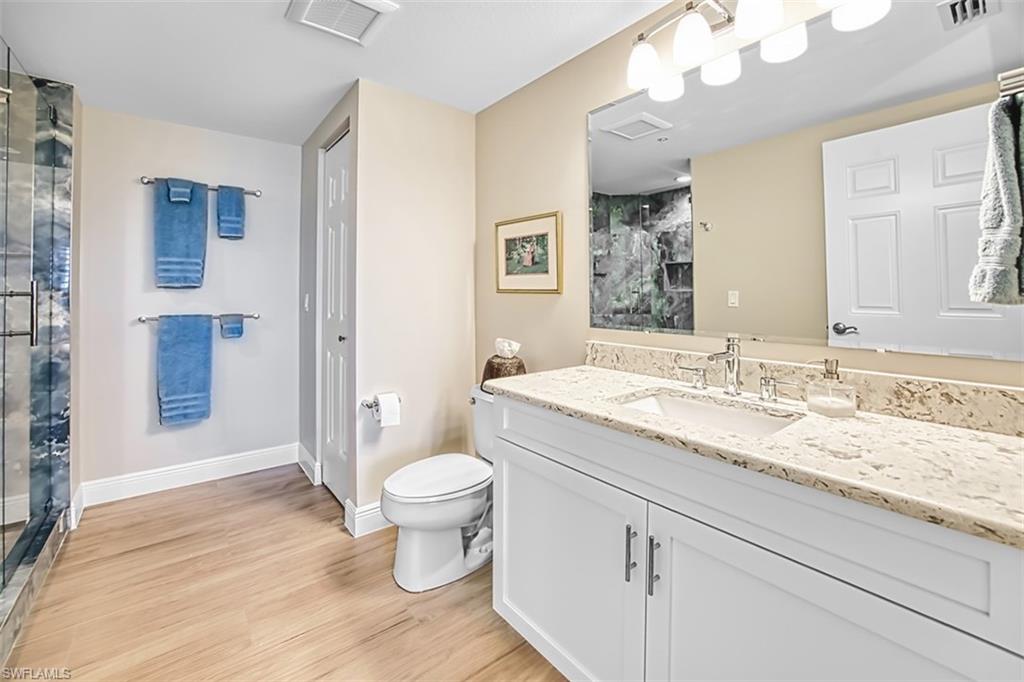 THE TOTAL PACKAGE! TOTALLY RENOVATED interior w/STUNNING VIEWS. West vistas can be appreciated from most rooms & 2 screened balconies. From the 16th floor, looking west, you see Sanibel, clearly identified by the historic lighthouse, situated between the Gulf & Bay. You can even see the river as it makes its way to the Bay. Regularly, you will experience an explosion of color as the sun sinks into the watery horizon. To the south you overlook a shimmering, 25-acre lake, 700+ acres of preserve land, FMB, the Bay & panoramic views of the Gulfu2019s shoreline along Estero Island. Turning your sights inside to the recently renovated & barely used interior, you will find a spacious living/dining area. Natural light streams in from a large impact window & sliders which access 2 lanais (both are tiled & have hurricane shutters). Summer of u201825 renovations were done by Cornerstone. The kitchen has all new, white, Shaker-style cabinetry w/pull-outs & slide spice-rack. Granite counters & backsplash, 2 bars, SS GE Profile appliances, cook-top w/SS hood. Positioned central in the condo, the kitchen is the heart of the home & open to the living/dining area. A breakfast room or flex space is also open to the kitchen.New wood-look tile runs throughout the condou2013no carpet! The primary retreat accesses one of the lanais, has a large window that invites the light in & frames views, 2 walk-in closets & attached primary bathroom featuring new white Shaker style cabinetry. More storage was created by removing a soaking tub. 2 separate sink vanities provide personal space. A walk-in shower w/new tile, frameless shower door, stone floor & private commode closet complete the spa like feeling. One the condou2019s opposite sides are 2 guest rooms, 1 is a secondary en suite. A split plan affords owners & guests privacy. The in-suite bathroom has new white, Shaker style cabinets, granite, new shower tile & frameless shower door. A 3rd guest bathroom has a pedestal sink, new tile in tub/shower enclosure & frameless door. The 2nd guest room is being used as an office/den. Both guest rooms have crown molding, plantation shutters & the same wood-look tile flooring. A generous laundry w/new white Shaker-style cabinets, soaking sink & closet make doing laundry a bit more pleasurable. A storage closet is steps outside the back doors. A 2-car garage & large a/c storage room on the 2nd level & dehumidified storage located on the 1st level convey. Located on 50+ lush, tropical acres w/a 25-acre shimmering lake gives this low-density community privacy & space to spread out. A shell path follows the lakeu2019s shore. A 6000+u2019 clubhouse includes fitness center, yoga studio, billiard/poker room, gathering space, dining area, media/meeting room, screened lanai & covered dining. On the edge of the lake sits a resort style, salt-water pool & spa. Bocchi, tennis/Pickleball & dog park are also avail. for your use. Beyond the gates, walk to the beach, restaurants, shops, grocery & bike to Sanibel & FMB.