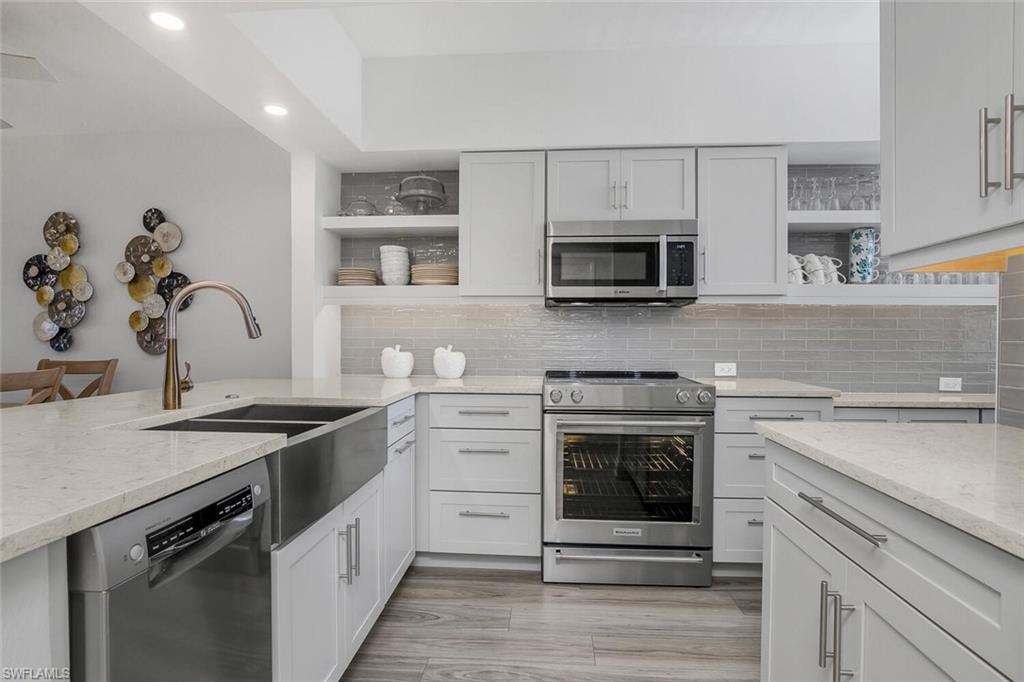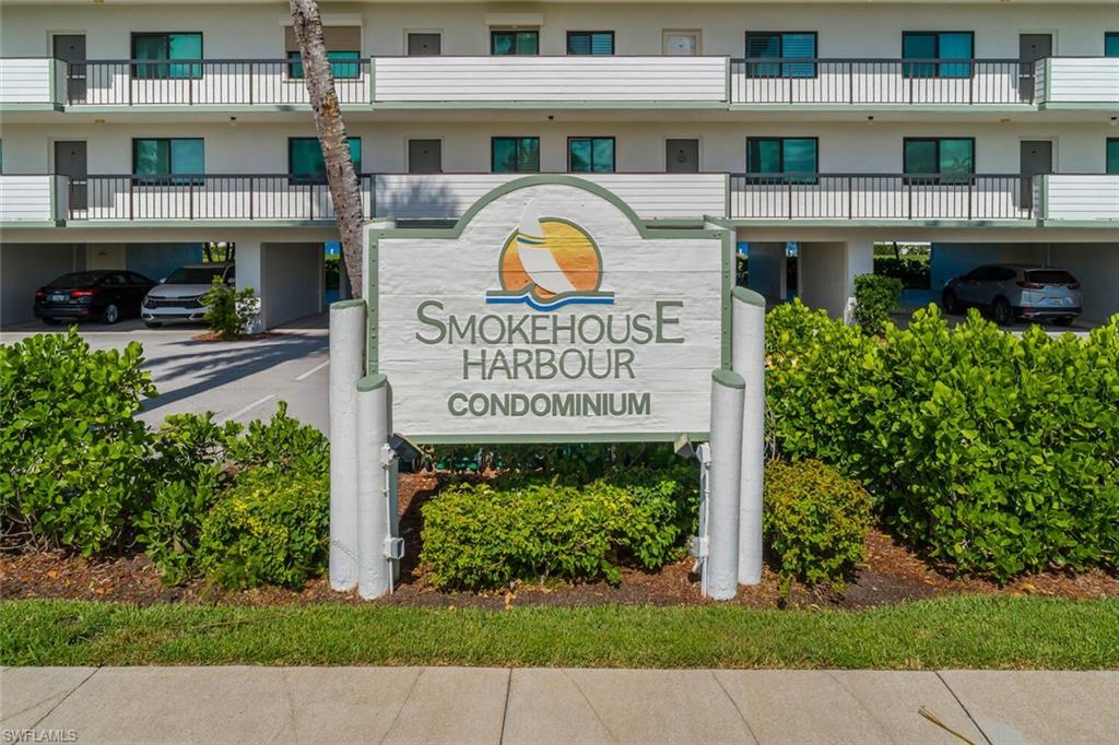 Welcome to Smokehouse Harbour, a stunning condominium conveniently located in the heart of the Island where all your needs are at arms length. This beautifully refurbished 2-bedroom, 2-bath unit perfectly blends comfort, security, and style and is offered turn key. The neutral and smooth decor enhances the breathtaking views of the lush landscape, pool, and bay. Completely renovated in 2022, this unit features impact glass, auto shade, and a security system for your peace of mind. The kitchen is a highlight, showcasing slow-close cabinetry, a farmhouse sink, and a spacious quartz island, making it both beautiful and functional. The wood-look tile flooring extends seamlessly throughout the unit, including the lanai, while Bahama shutter window treatments add a touch of elegance.The stocked galley kitchen is a chef's dream, offering fantastic counter space, a stylish subway tile backsplash, and a glass refrigerator. The Bosch stacked laundry unit is conveniently tucked away, complemented by an abundance of natural light that fills the space.The spacious primary suite is a true retreat, featuring a custom built walk in closet, double quartz vanity and an impressive stone walk-in shower with a stunning barn glass door and high-quality stainless steel hardware. The new sleep number bedding can accommodate either a king or two singles, providing flexibility for your comfort. Don't miss the opportunity to make this exquisite condominium your new home. Experience the perfect combination of luxury and tranquility at Smokehouse Harbour!