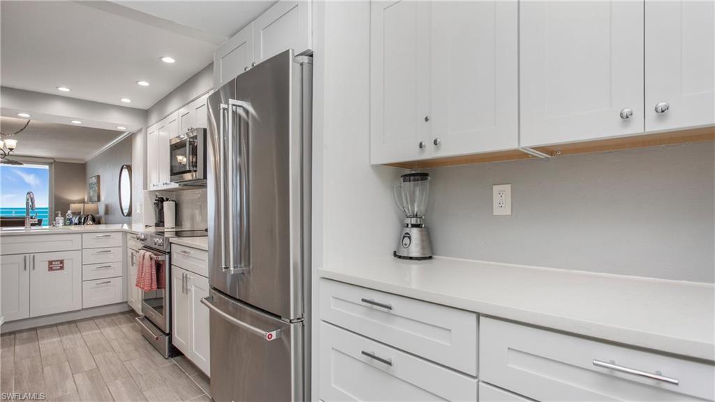 This recently remodeled elegant Somerset unit has it all! Located on the north side of the complex giving spectacular views of Marco Island crescent beach skyline and west facing sunset views from your private balcony. High end, custom finishings throughout, from the ''open'' kitchen to the master and guest bathrooms, plank style wood flooring, oversized walk -in shower... this unit is walk in ready for yourself of for rentals. Unit is being sold turnkey with designer furnishing throughout. All sliders and entry windows are impact and hurricane proof. The Somerset complex on Marco offers all of the amenities. Offering two pools, two private beach access boardwalks, two grilling areas, recently remodeled lobby and fitness room Also adding 2 top of the line pickleball courts as well as tennis. This gated and secured beachfront complex has it all. Building allows for weekly rentals. Unit is move in ready!furnished per inventory