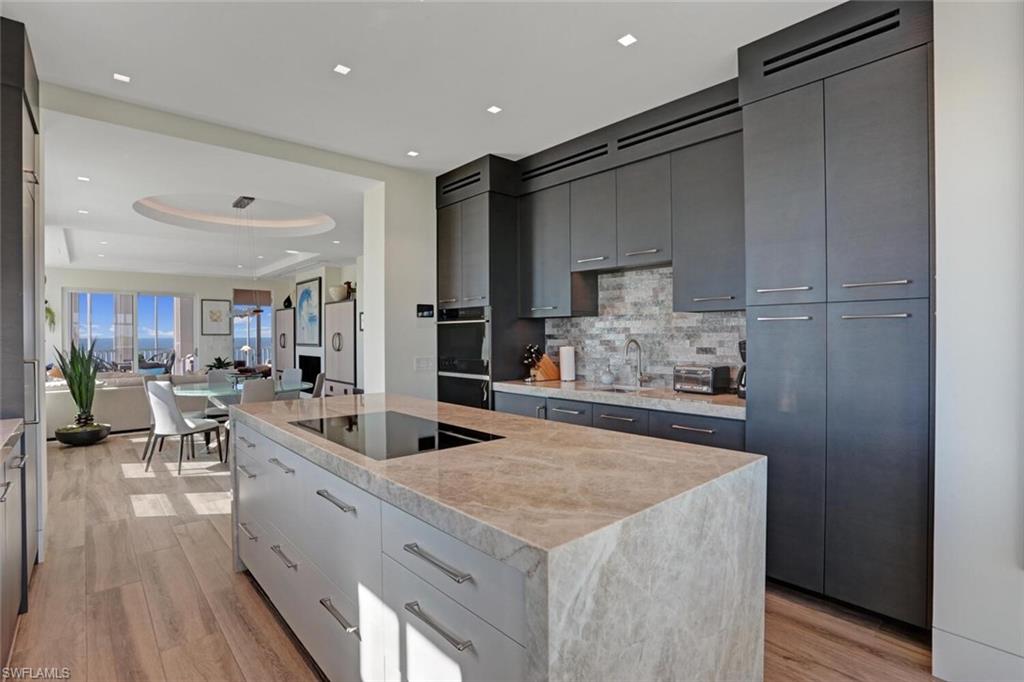 Ask about reduced off season rates. The pinnacle of luxury has been reached on Barefoot Beach and you can experience it in this beautiful, sunny, and masterfully remodeled, BEACHFRONT PENTHOUSE. Every square inch of this condo has been professionally redesigned to enhance your luxury living experience. The oversized 3 bedroom, 3 and a half bathroom floor plan is one-of-a-kind. The custom features include a brand new state-of-the-art chef's kitchen with Wolf and Subzero appliances, stunning center island with waterfall quartz, separate beverage/wine refrigerators, two microwaves, and even a countertop television. The living room is the perfect place to relax with a Dimplex electric fireplace and a home theatre that includes projector, surround sound, and retractable movie screen. The primary suite features a full size jacuzzi tub, heated bathroom floor, rainfall steam shower, and electric window shades. The second and third bedrooms are both en suite, and one is set up with a hide-a-bed sofa and treadmill so it's easy to stay active within the comfort of your home. Enjoy breathtaking Gulf of Mexico views from the spacious, wrap-around, screened balcony featuring another fireplace and electric cooktop grill. Lighting enhancements have been added to every room and create the special mood and setting you desire. Even the parking space is upgraded, allowing for an extra 3ft on each side to avoid banging doors and to provide easy in and out access to your vehicle. The Barefoot Beach Club offers world class amenities including a beachfront pool and club house and fitness center overlooking Barefoot Beach.