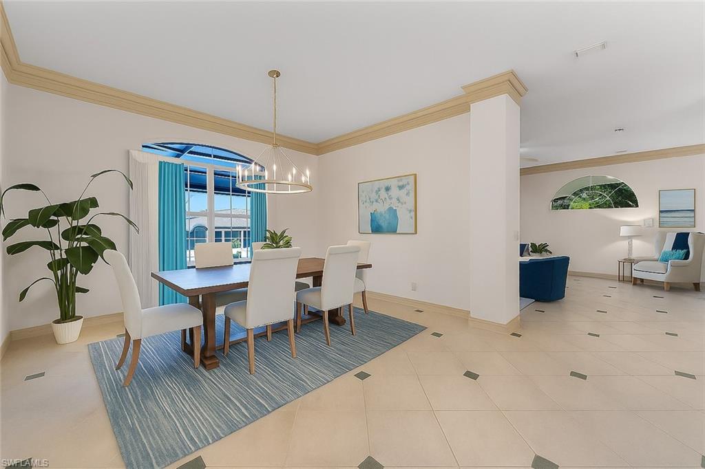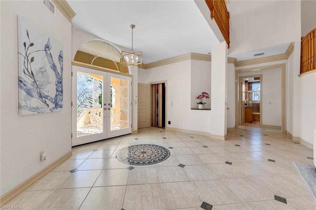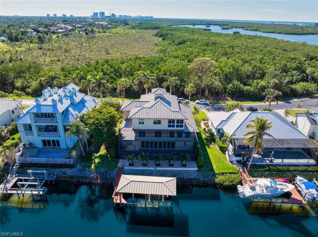 **Some rooms in this home have been now virtually staged and previously it was staged and those photos are listed as well, but the property is now vacant and easy to show.**Welcome to **Dolphin Cove**, a rare and exclusive **gated waterfront community** of only 12 residences, offering **direct Gulf access** just minutes from your back door. This exceptional 4-bedroom, 4-bathroom home features over **4,100 sq ft of living space** and is perfectly designed for both luxury living and effortless entertaining.Boating enthusiasts will appreciate the **private dock with 10,000 lb. lift**, **no-bridge access**, and fast, deep-water passage to the Gulf of Mexicou2014perfect for enjoying world-class beaches, pristine water, and the ultimate Southwest Florida boating lifestyle.This three-story coastal residence features an open floor plan, volume ceilings, hardwood and porcelain tile flooring, and elegant architectural details including arches and a sweeping staircase. The **third-floor primary suite** offers a private retreat with an en-suite bath, bidet, soaking tub, walk-in shower, and oversized custom closet. Enjoy peaceful mornings and sunsets from the screened private balcony. A den on this level also opens to a covered porch, with elevator access to all three floors.The **second floor** showcases a spacious kitchen with granite countertops, an island, and a walk-in pantry, along with 3 additional bedrooms and 2 full bathrooms, including one en-suite. The formal living room features vaulted ceilings and flows seamlessly into the dining room and family room, making the home ideal for gatherings.On the **first floor**, you'll find over **1,000 sq ft** of flexible spaceu2014perfect for a gym, entertainment area, hobby room, or guest spaceu2014along with a full bathroom. The lap pool and spa are enclosed in an impressive three-story screened lanai, accessible via the spiral staircase from the family room above.Additional features include a **whole-house generator**, **3-zone AC**, two garages, with space for 3-4 cars, plus workshop area, and abundant storage.Located minutes to the Gulf of Mexico, Mercato, top-rated schools, dining, shopping, and a short drive to RSW International Airport, this home offers the perfect balance of **luxury, convenience, and true coastal living**.Experience the best of Naples in Dolphin Coveu2014your private waterfront oasis with direct Gulf access and unmatched lifestyle amenities.