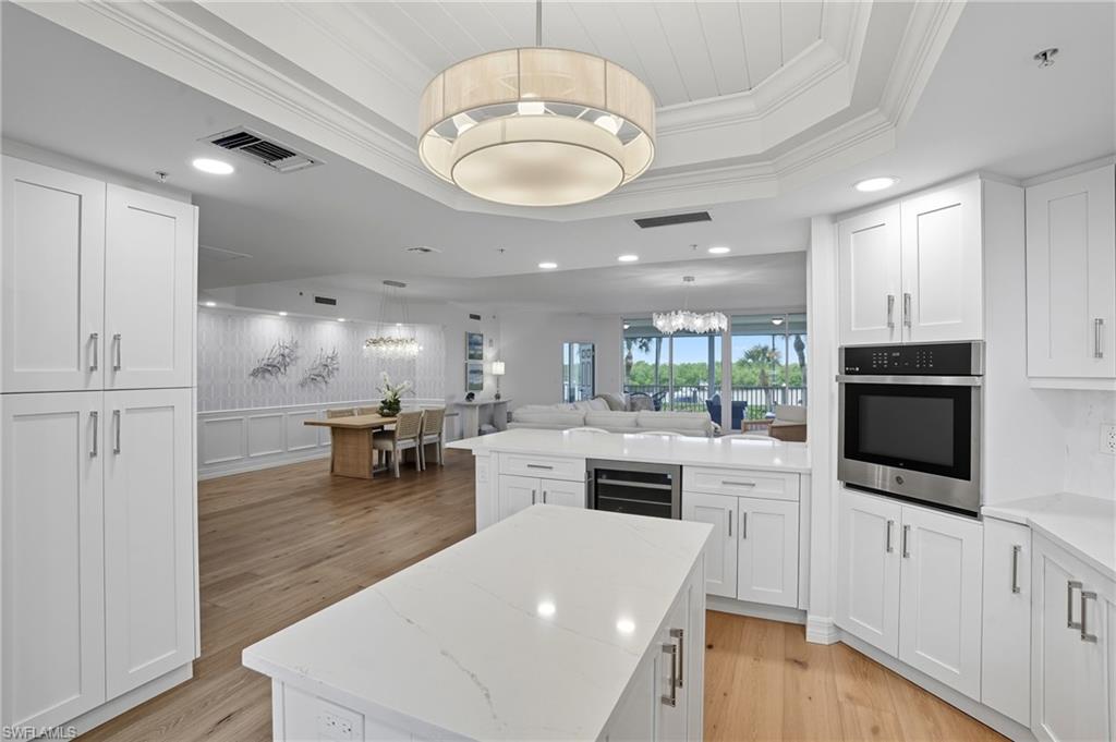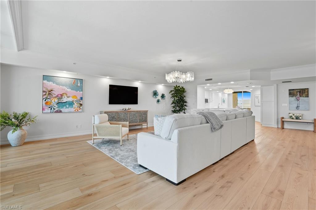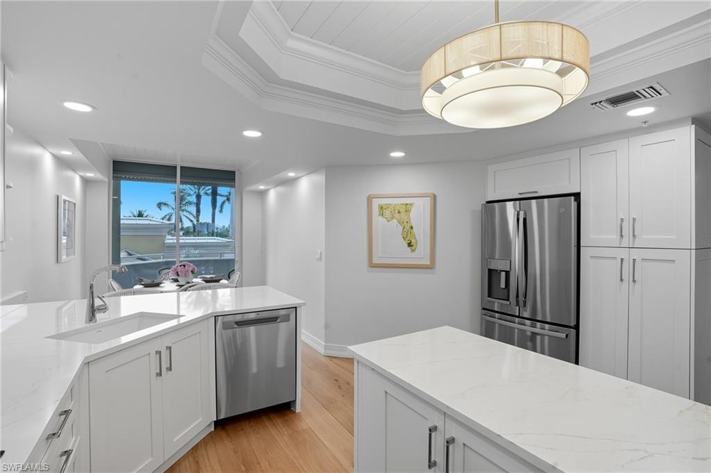 Discover the beauty of coastal living in this elegant residence located in the exclusive waterfront community of Pelican Isle. Spanning 2,677 square feet, this spacious condominium has been beautifully remastered, now offering an open and inviting floor plan designed for comfort and style. The large great room provides the perfect space for entertaining, with expansive west-facing views that fill the home with natural light and frame spectacular sunsets over the water. The private owneru2019s suite is a serene retreat, featuring a luxurious bath and direct access to the lanai, while two additional guest suites ensure comfort and privacy for visitors. Enjoy morning coffee or casual dining on the kitchenu2019s private veranda, surrounded by gentle breezes and tropical scenery.Built with peace of mind in mind, the residence includes top-quality hurricane impact windows and sliders, electric shutters on the lanai and veranda, and recent mechanical updates u2014 including two newer air conditioning units and a new water heater. A spacious laundry room, ample storage, and assigned parking add everyday convenience.Set within a lush 15-acre island enclave, Pelican Isle offers an intimate setting with only three buildings and 136 total residences. Residents may also enjoy membership at the Pelican Isle Yacht Club, featuring boating access, beach shuttle service, dining, fitness, and vibrant social activities.Experience the best of Naples waterfront living u2014 a refined blend of comfort, security, and coastal elegance u2014 at Pelican Isle.