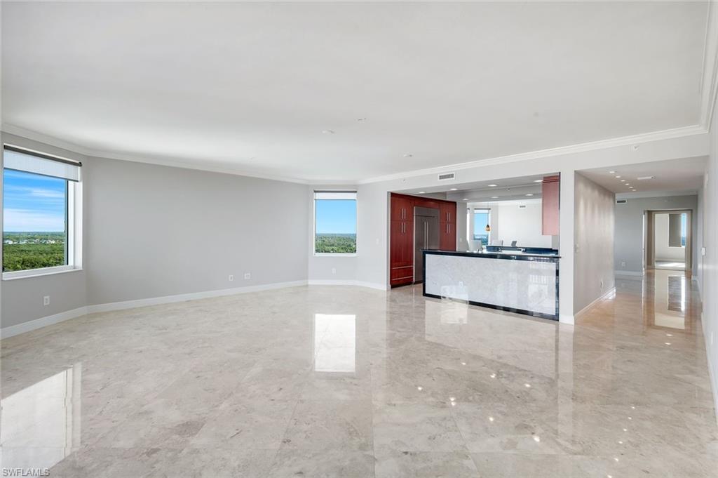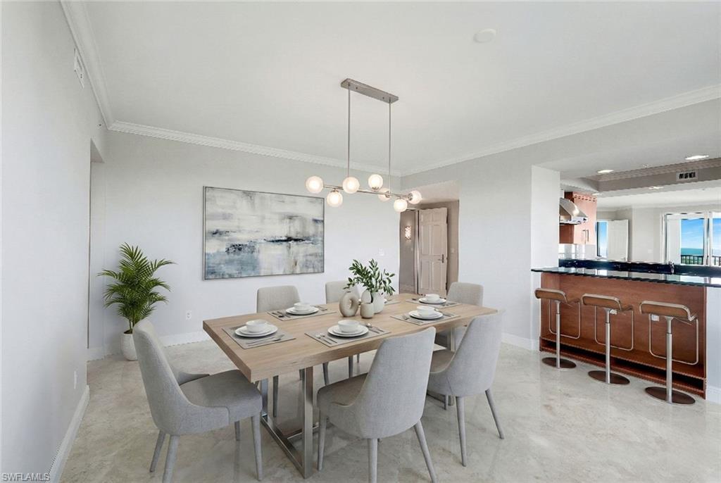 Perched on the 16th floor of the Grande Phoenician, this exceptional residence showcases sweeping panoramic views of the Gulf of Mexico and tranquil Turkey Bay. A private, secured elevator opens directly into the home, revealing a refined open-concept layout enhanced by marble tile flooring, crown molding, and updated designer fixtures throughout. At the heart of the living space, the gourmet kitchen is thoughtfully designed for both everyday living and elegant entertaining. It features custom soft-close cabinetry, quartz countertops and backsplash, a wood-paneled Sub-Zero refrigerator, wine cooler, Wolf dual-fuel range, Asko dishwasher, and LED lighting. Adjacent to the kitchen, the spacious dining area is perfectly positioned to capture stunning views of the Old Collier Golf Course, creating an unforgettable backdrop for any gathering. The great room is framed by floor-to-ceiling sliders that open to a screened lanai, where expansive Gulf views take center stage and remote-controlled hurricane shutters offer both comfort and peace of mind. The owneru2019s suite is a private retreat, highlighted by large windows overlooking the Gulf and Turkey Bay, a generous walk-in closet with custom shelving, and a spa-inspired bathroom featuring dual vanities, a soaking tub, and a frameless glass walk-in shower. Guest bedrooms are appointed with upgraded carpet and padding, while all bathrooms feature custom vanities, mirrors, and sleek one-piece fixtures. The third bedroom, currently utilized as a home office, includes cherry wood cabinetry and built-in bookshelves. This residence also includes two deeded garage parking spaces and a private storage unit conveniently located on the entry level. Additional upgrades include a new hot water heater, an air-conditioning system with built-in dehumidifier, and custom cabinetry in the laundry room. All Dunes towers have recently completed roof replacements, further enhancing long-term value and security. Residents enjoy exclusive access to The Club at The Dunes, the social and recreational centerpiece of the community. Amenities include a resort-style pool, tiki bar, casual and fine dining, a state-of-the-art fitness center, and recently renovated racquet facilities with four pickleball courts and five tennis courts, supported by an active tennis program and professional on-site pros. Ideally located near world-class shopping and fine dining, The Dunes is just a short drive from RSW International Airport and is one of the few Naples condominium communities that is truly pet-friendly. Membership to the exclusive Floridian Beach Club on Vanderbilt Beach is also available for transfer. Members enjoy shuttle service to and from the Club, full-service dining and bar, a pool, beach chairs and umbrellas, and attentive beachfront service. This is a rare opportunity to own a beautifully appointed residence in the premier coastal resort community of The Dunesu2014where luxury, lifestyle, and location come together seamlessly.