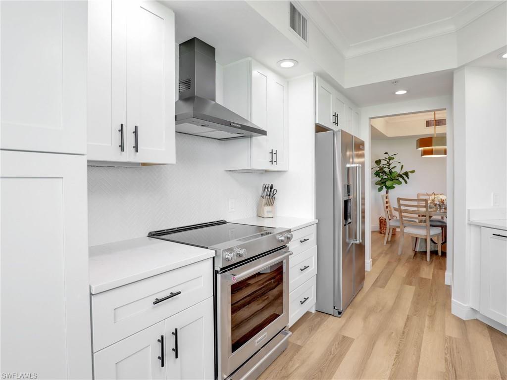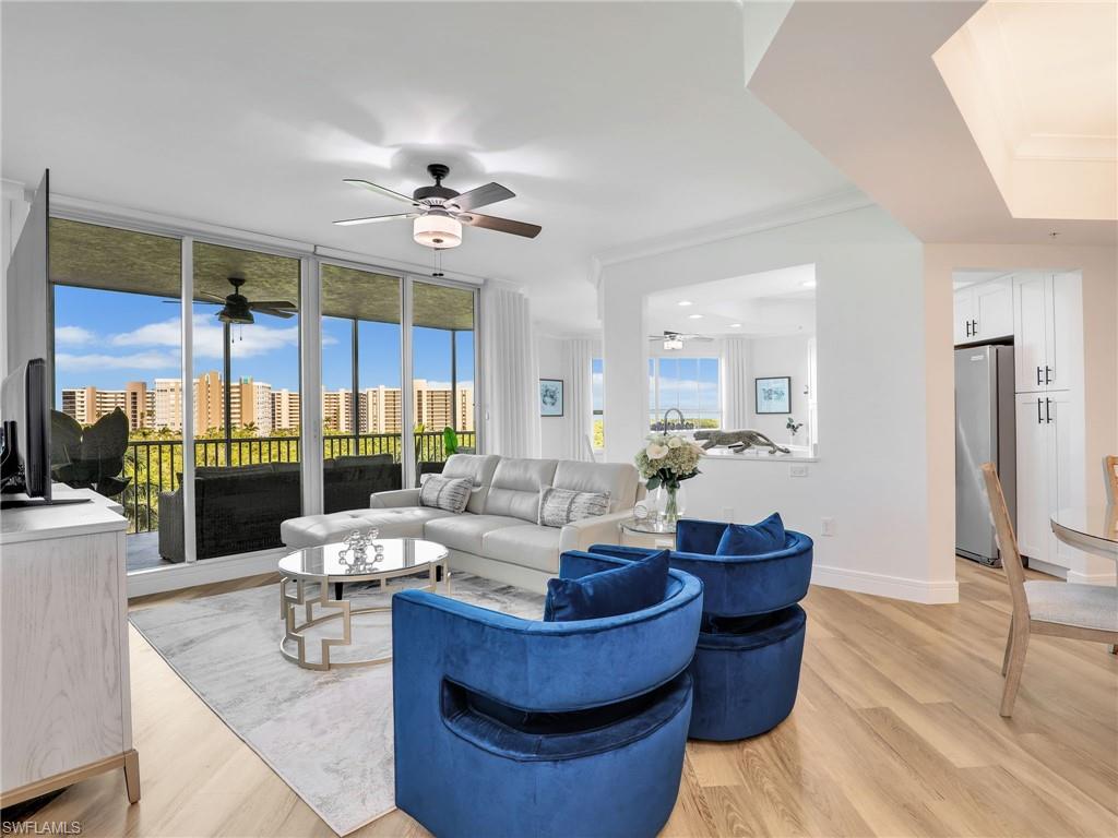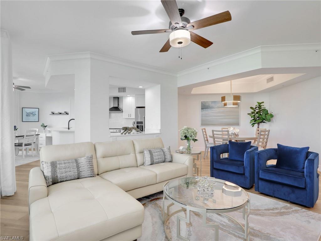 Welcome to a refined coastal retreat in the highly sought-after Cayman building at The Dunes of Naples. This impeccably updated 3-bedroom, 2-bath residence sits on the 4th floor, offering both privacy and a beautiful elevated view. Designed with a clean, contemporary feel, the home features brand-new furnishings, modern lighting selections, and a bright open-concept layout that blends style with comfort. Air Conditioner was replaced in 2022 and Hot Water Heater in 2018. The spacious primary suite provides a peaceful sanctuary, while two additional guest bedrooms create flexibility for hosting family or visitors. A private balcony invites you to relax, unwind, and enjoy the serene backdrop of this premier coastal community. Residents of The Dunes Community enjoy an unmatched lineup of amenities, including a newly renovated clubhouse, resort-style pool with waterfall features, private dining and bar areas both indoors and pool side, an expansive state of the art fitness center that offers group exercise classes, personal training, massage therapy and spa services, tennis courts, and pickle ball. You will enjoy an active social calendar. Located minutes from Naplesu2019 world-famous beaches just a short walk to Delnor-Wiggins State Park and Beach. Conveniently located near some of Naples finest shopping districts including Mercato and Waterside Shops. This residence offers the perfect combination of luxury, convenience, and effortless living. Move-in-ready, beautifully appointed, and positioned within one of Naplesu2019 finest resort communities u2014 this is coastal living at its best.