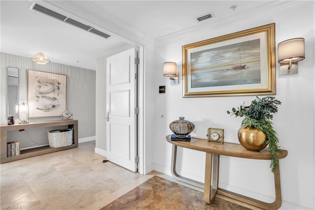 Welcome to 265 Indies Way, Unit #1404 u2014 a resplendent masterpiece in the sky, where refined luxury, tranquil privacy, and awe-inspiring vistas converge in the most coveted and secluded tower of The Dunes: Grande Geneva. Nestled at the peaceful end of the community and surrounded by shimmering water and lush preserves, Grande Geneva is the newest and most private high-rise in this prestigious enclave. A private elevator opens directly into your foyer, setting the tone for a lifestyle defined by elegance and exclusivity.This 3-bedroom, 3-bath sanctuary has been thoughtfully remodeled featuring polished marble floors throughout the main living areas. It also includes two assigned garage spaces and a rare transferable membership to The Floridian Club, a private beach club with daily shuttle service, full beachside food and beverage service, and effortless access to the white sands of Naples. Grande Geneva residents also enjoy their building's exclusive heated resort-style pool and spa, a modern fitness center, social lounge with catering kitchen, and outdoor grilling stationsu2014providing an upscale, private resort ambiance just steps from home. From the moment you enter, panoramic Gulf and golf course views dazzle in every direction. The kitchen, living room, screened lanai, and primary suite offer front-row seats to breathtaking sunsets over the Gulf of Mexico, while the second and third bedrooms frame serene sunrise views over the lush fairways of the Old Collier Golf Club. The open floor plan is crafted for elevated coastal living, with lofty ceilings, abundant natural light, and mesmerizing views throughout. The chef's kitchen is a culinary dream, complete with premium appliances, a wine cooler, granite countertops, and custom cabinetryu2014perfect for morning coffee or evening entertaining. The living area, with flat-screen TV, flows onto the screened lanai where Gulf breezes and glowing skies await. The primary suite is a peaceful sanctuary with lanai access, a spa-like ensuite bath, a massive walk-in closet and wall-mounted TV for your favorite entertainment. The second bedroom enjoys ensuite privacy and its own TV, while the third bedroomu2014also with golf course viewsu2014shares a full guest bath via hallway access. All bedrooms are appointed with superior quality bamboo sheets, blending luxurious comfort with eco-conscious elegance. Life at The Dunes is dazzling. Residents enjoy access to the five-star Club at the Dunes, honored in 2022 and 2023 with the Distinguished Club Award by BoardRoom Magazine and Forbes Travel Guide. Amenities include a cascading waterfall resort pool with zero-entry, vibrant tiki bar with poolside service, and a world-class restaurant helmed by an award-winning chef. Cap off the evening at the fire pit, surrounded by laughter and coastal breezes. For guests, enjoy privileged access to six luxurious on-site cottages.
