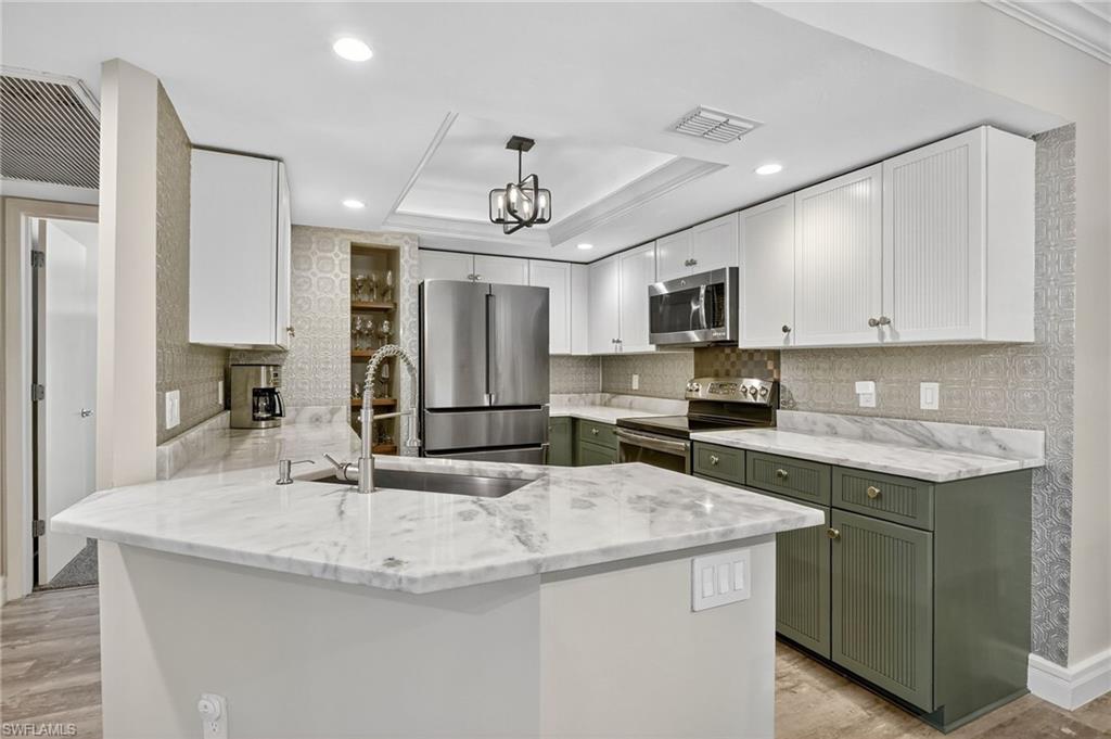 In pristine condition, this first-floor Condo, consisting of 2 bedrooms, a small office area and 2 full baths, both featuring walk-in showers, has been meticulously maintained and remodeled with all-new hurricane impact windows/sliders done in 2022. The coastal feel, open floor plan, water views and loads of privacy out back enhances this cottage-style Condo. New flooring in the main living area is a wood-grain luxury vinyl, and carpet in both bedrooms. Crown molding, decorative lighting & fans, A/C system, stackable washer/dryer, granite countertops, and a farmhouse sink in the kitchen, to name a few additional improvements. The Colony at Wiggins Bay features three buildings, its own pool only steps away from this unit. The Wiggins Bay community is gated with 24-hour security. The Tarpon Cove Yacht & Racquet Club is situated within the gates and offers membership opportunities, providing additional amenities. Please inquire about costs or book a Tour. Tennis, dining, tiki bar, bocce, fitness, boat shuttle to beach, and Club pool with towel service. Additionally, the Wiggins Bay Dock Owners Association is a separate entity that offers slips for lease or purchase; details are available.